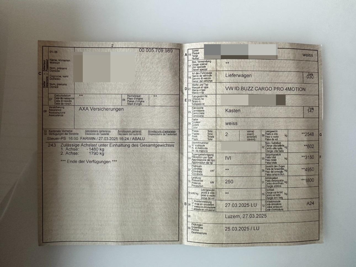 Assist: Notbremsassistent Front Assist mit Fussgänger- und Radfahrererkennung, Einfassung des Infotainment-Displays, zentrale Bedienungselemente und Lenkrad in Schwarz, 2. Schlüssel mit Funkfernbedienung, Türverkleidung und Armauflage in Kunstoff, Bordwerkzeug, Assist: Spurhalteassistent “Lane Assist”, Aussenspiegel, elektrisch einstell- und beheizbar, Sitze: Beifahrerdoppelsitzbank vorne rechts, Raucherausführung mit Anzünder und Aschenbecher, Garantie: Hochvolt-Batterie: 8 Jahre / 160 000 km auf Fehler in Werkstoff, Werkarbeit und auf 70% der Kapazität,je nachdem was zuerst eintrifft, Sitze: Fahrersitz längs- und höhenverstellbar, Licht: Leuchtweitenregulierung, Assist: Intelligent Speed Assist inkl. Geschwindigkeitsbegrenzer, Media: Mobiltelefon-Schnittstelle, Scheibenwischer-Intervallschaltung, Lackierung: Uni-Lackierung, Stossstangen vorne in Grau, Räder: 4 Leichtmetallräder “Tilburg” 8J x 19 vorn, 9 J x 19 hinten, in Schwarz, Oberfläche glanzgedreht, Sonnenblenden auf Fahrer und Beifahrerseite mit Spiegel, ohne Beleuchtung, Media: Radio”Ready 2 Discover” mit 12.9″ Touch-Farbdisplay, Verbandmaterial, Warndreieck und 1 Warnweste, Vorbereitung Alcohol Interlock, Wegfahrsperre, elektronisch, Assist: Geschwindigkeitsregelanlage, Garantie: Garantie gegen Lackmängel: 3 Jahre, Licht: LED-Rückleuchten, Polster: Sitzbezüge Stoff, Robustbodenbelag im Fahrerhaus, Laderaumbeleuchtung in LED, Elektrische Fensterheber vorne, Assist: Ablenkungs- und Müdigkeitserkennung, Media: 2 Lautsprecher vorne, Media: Digitaler Radioempfang DAB+, Geschwindigkeitsabhängige, elektromechanische Servolenkung, Airbag: Airbag für Fahrer und Beifahrer mit Beifahrer-Airbag-Deaktivierung, Betriebsspannung 12 Volt mit 12 Volt Steckdose im Laderaum, Wärmeschutzverglasung, Assist: Verkehrszeichenerkennung, Heckklappe mit Fenster und Heckscheibenwischer mit Intervallschaltung, Assist: Einparkhilfe im Front- und Heckbereich, Getreibe: Direktantieb, kein Getriebe, Ladekabel Mode 3 Typ 2, Räder: Reifendruck-Kontrollanzeige, Räder: Abdeckungen für Leichtmetallräder, Garantie: 2 Jahre ohne Kilometerbegrenzung, Licht: LED Scheinwerfer, Höhenverstellbare 3-Punkt-Automatik-Sicherheitsgurte mit Gurtstraffer, Aussenspiegelgehäuse in schwarz, Türgriffe in Wagenfarbe, Garantie: Garantie 2+1 Jahre oder 100’000 km, Zentralverriegelung mit schlüssellosem Startsystem “Keyless Start” ohne Safe-Sicherung, Holzboden im Laderaum, Lenkrad: Multifunktionslenkrad mit Touch-Bedienung, Assist: Multifunktionskamera, Media: 2 USB-C-Schnittstellen und 2 USB-C-Ladebuchsen vorne, Garantie: Garantie gegen Karosserie-Durchrostung: 12 Jahre, Türen: Schiebetüre rechts, Klima: 1-Zonen Klimaanlage “Climatronic” mit Standklimatisierung, ESP, elektr. Stabilitätsprogramm mit ABS, EDS, ASR