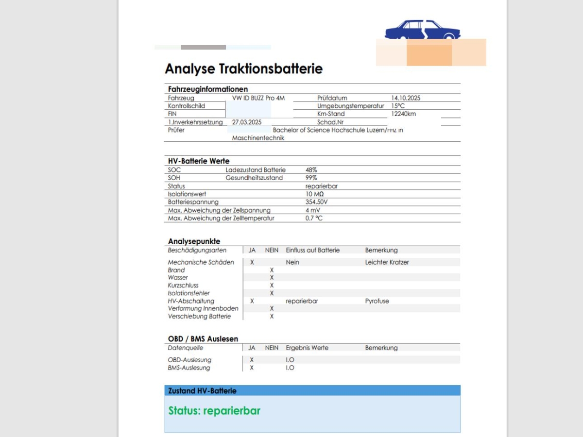 Die Hochvoltbatterie wurde geprüft und ist reparierbar. Das Fahrzeug wird mit der HV-Batterie verkauft. Die Pyrofuse muss durch einen Fachbetrieb gewechselt werden. Die (vom Fahrzeugexperten) ermittelten Reparaturkosten beziehen sich auf das versicherte Ereignis. Allfällige zusätzliche, nicht versicherte Schäden/Vorschäden, sind in den Reparaturkosten nicht enthalten. Die deklarierten Ausstattungsmerkmale können von der effektiven Ausstattung abweichen. Achtung Bei einem Hochvoltsystem – Spannungsfreiheit prüfen. Sicherheitshinweise und Betriebsanleitungen des Herstellers konsultieren und befolgen.