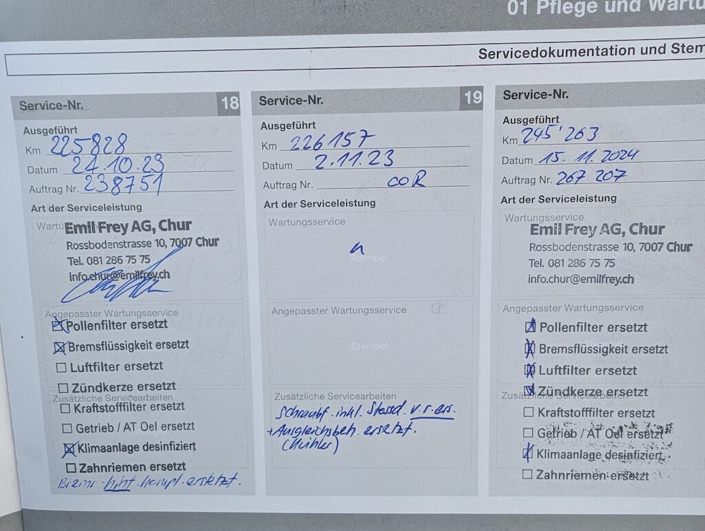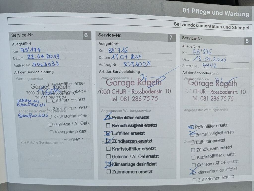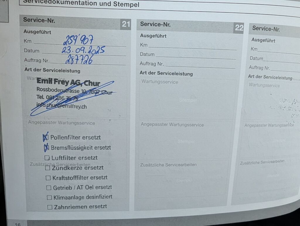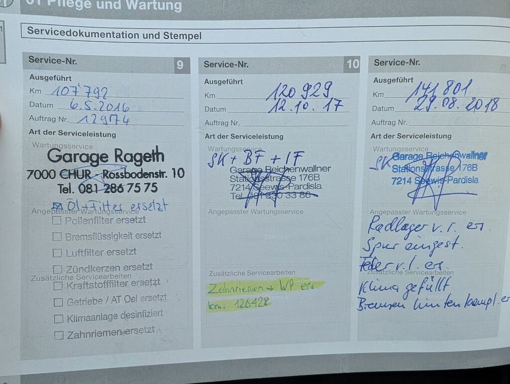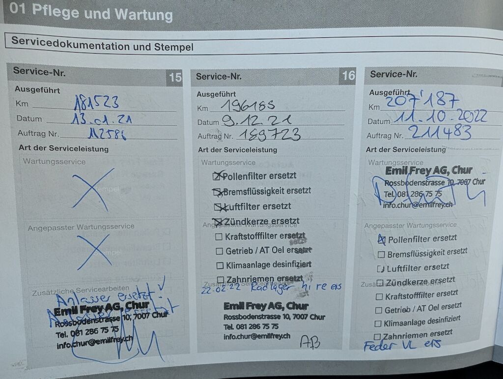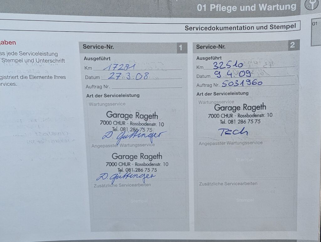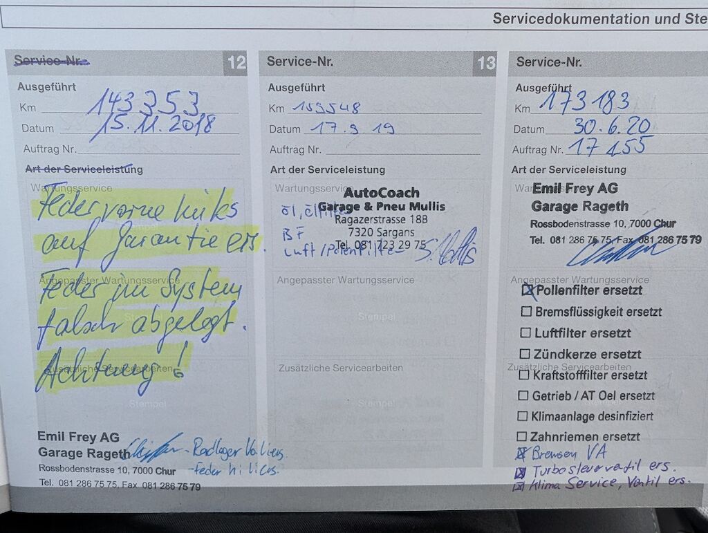 | Grosse Reparatur mit Service im September 2025 durchgefüht : -Querlenker vorne beide ersetzt -Bremsen vorne ersetzt -Lenkgetriebe + Servoleitung ersetzt offener technischer Mangel: |