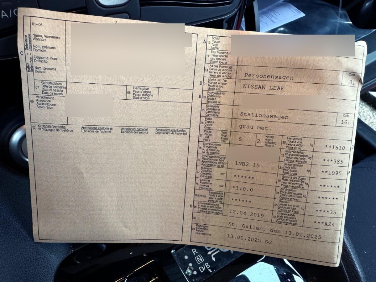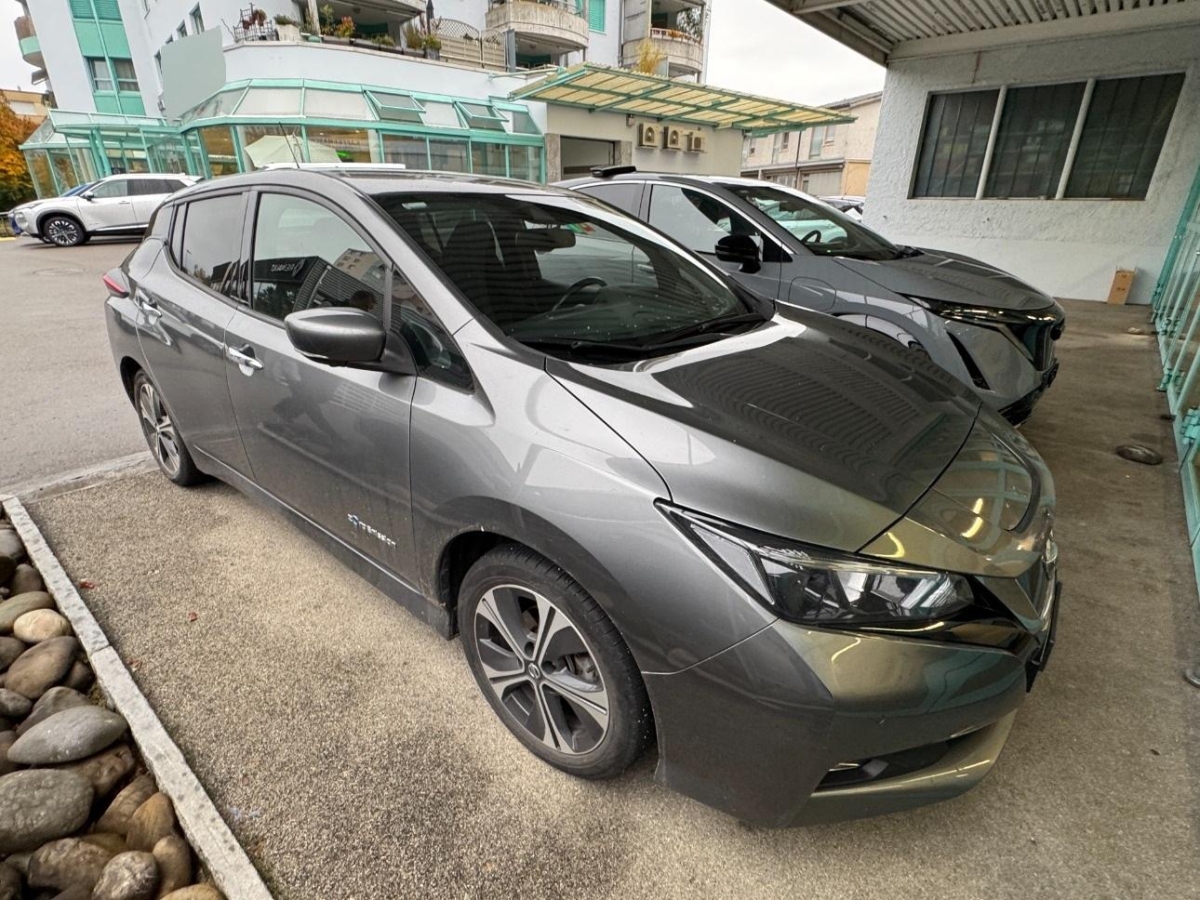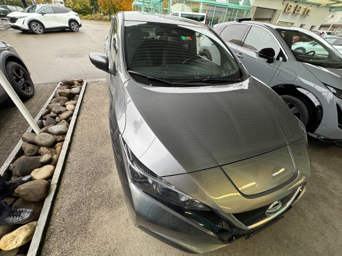 Räder: 4 Leichtmetallfelgen 17J mit Pneu, Sitze: Rücksitzbank asymetrisch geteilt umlegbar, Aussentemperaturanzeige, Haltegriffe für Beifahrer und Fondpassagiere, Pollenfilter (Staubfilter), Akustisches Annäherungssignal intermittierend, nach vorne abstrahlend, bis 30 km/h, Stufenloser Automat, Assist: Regensensor für Scheibenwischer vorne, Innenspiegel automatisch abblendbar, Stossfänger in Wagenfarbe und verkratzungshemmend lackiert, Defrosterdüsen für Front- und Seitenscheiben, Assist: Warnblinkautomatik bei Vollbremsung, Lenkrad höhenverstellbar, Armlehnen an den Türen, Mode 3 Ladekabel Typ 1 / Typ 2, Elektronische Parkbremse, Querverkehrsassistent hinten, Ladeanschluss für Wechselstrom bis 6.6kW, Akustisches Warnsignal bei nicht angelegtem Sicherheitsgurt, Kartentaschen an den Rückenlehnen, Lichtsensor, Dachspoiler, Lackierung: Uni-Lackierung, Aussenspiegel in Wagenfarbe, Gurtstraffer mit Gurtkraftbegrenzer vorne, 12-Volt-Steckdose vorne, Halogen-Fernlicht, Lenkrad: Lenkradfernbedienung, Sitze: ISOFIX-Befestigungspunkte für Kindersitz an den äusseren Rücksitzen, Lederlenkrad, Sitze: Fahrersitz höhenverstellbar, NissanConnect EV: Multimedia System, EV Telematiksystem, NissanConnect EV App, TPMS Reifendrucküberwachungssystem, Servolenkung geschwindigkeitsabhängig, Abgedunkeltes Scheibenglas (ab B-Säule), LED Heckleuchten, Licht: LED-Tagfahrlicht, Bordcomputer mit Energieverbrauchanzeige und Fahrstatistik, Blinker in Aussenspiegel, Kopfstützen vorne höhenverstellbar, Berganfahrhilfe, Halogenscheinwerfer, Aussenspiegel rechts und links elektrisch verstellbar, Fahrerassistenzpaket: autonomer Notbrems -Assistent, Fernlicht-Assistent, Spur- halteassistent, Verkehrszeichenerkennung, Airbag: Airbag Fahrer und Beifahrer, Kindersicherung an den hinteren Türen, Frontscheibe und Front-Seitenscheiben mit UV- und Infrarotfilter-Beschichtung, Spurhalteassistent Lane Assist, Sprachsteuerung, Make up-Spiegel links, Abstandswarner, Ladefunktionsanzeige auf dem Armaturenbrett, Polster: Sitzbezüge Stoff, Nebelscheinwerfer, Kopfstützen hinten höhenverstellbar, Nebelschlussleuchte, Media: Connected / Android Auto / Apple CarPlay, Wegfahrsperre elektronisch, Zentralverriegelung mit Fernbedienung, 3-Punkt-Sicherheitsgurte auf allen Plätzen, Sitze: Mittelarmlehne vorne, Elektronisches Stabilitäts-Programm (ESP), Mittelkonsole mit Ablagefach, Klimatisierungsautomatik, INTELLIGENT KEY Entriegelungsmöglichkeit der Abdeckung der Ladeanschlüsse, Keyless Entry und Starten des Motors, Airbag: Airbag Beifahrer deaktivierbar, Dachantenne, Beleuchtetes Handschuhfach, Adaptiver Tempomat mit automatischer Geschwindigkeitseinstellung, Akustisches Warnsignal nach hinten abstrahlend bei eingelegtem Rückwärtsgang, Elektrische Fensterheber vorne und hinten mit Komfortbetätigung und Einklemmschutz, Intelligenter AROUND VIEW MONITOR für360° Rundumsicht* mit Parksensoren vorne und hinten, Kofferraumbeleuchtung, Müdigkeitserkennung, Türaussengriffe in Chromoptik, Drittes Bremslicht, Aussenspiegel automatisch einklappbar, CHAdeMo Schnelladeanschluss vorn, Vehicle2Grid Ready, Gleichstrom (bis 50kW), Totwinkel-Assistent, Dual-Display für Geschwindigkeitsanzeige Batteriekapazitäts- und Restreichweiten- anzeige, Energieverbrauchsanzeige, Leseleuchten vorne, Fernentriegelung für Abdeckung der Ladeanschlüsse, vom Innenraum elektronisch (und elektronisch per INTELLIGENT KEY), Brillenfach, Seitenairbags vorne und Kopfairbags vorne und hinten, Start-/Stop-Knopf, EVSE-Kabel (Mode2-Sicherheitssystem) mit Haushalts-Stecker, Make up-Spiegel rechts, Scheibenwischer vorne und hinten mit Intervall, Abblendlichtausschaltverzögerung ‘Follow me home’, ABS, EBD elektronische Bremskraftverteilung, Bremsassistent (BAS), Automatische Türverriegelung geschwindigkeitsabhängig, Multimedia-System mit 7” Touchscreen, Navigation, Sprachsteuerung, CD, MP3, Bluetooth, USB- und Audioeingang (iPod- kompatibel, 6 Lautsprecher