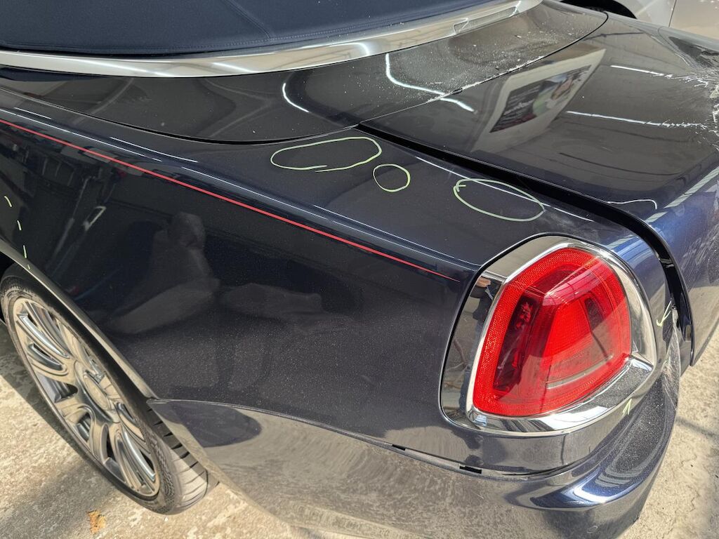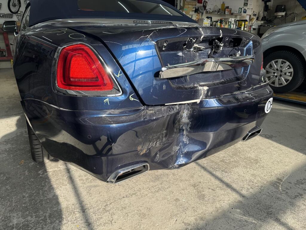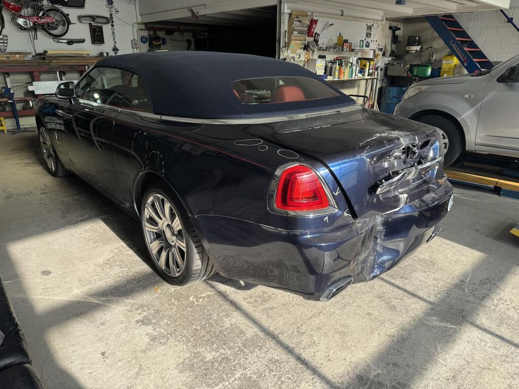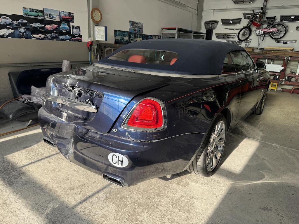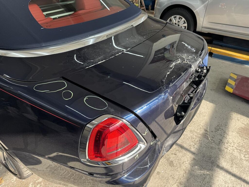 Kofferraumboden mit Heckblech deformiert. Heckdeckel mit Verdeckabdeckung aus GFK beschädigt. Diverse Anbauteile im anprallbereich beschädigt.