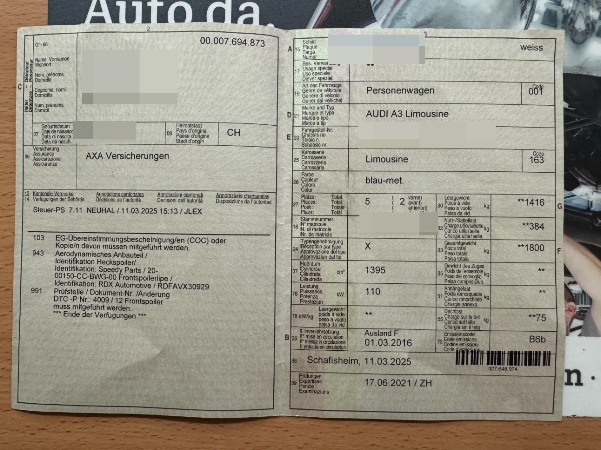 Getönte Scheiben, Teppichfussmatten vorne und hinten, Seitenaufprall-Schutzsystem, Stossstangen in Wagenfarbe, Schutzleisten in Wagenfarbe, Scheibenwischer vorne mit Intervall, Räder: Reifendruck-Kontrollanzeige, Wartungsintervall-Anzeige, Gurtstraffer vorne, Heckscheibenheizung, Einstiegsschienen, Scheibenwaschdüsen beheizt, Wagenheber, Start/Stop-Funktion, Klimaautomatik Komfort, Tageskilometerzähler, MMI Radio, Befestigungsösen im Laderaum, Lenkrad: Lenkrad längs- und höhenverstellbar, Raucherpaket, 3 Speichen-Sportlenkrad, Fahrer-Informationssystem mit Farbdisplay, Elektronische Differentialsperre (EDS), Make up-Spiegel links, Fahrwerk: Sportfahrwerk, Lackierung: Uni-Lackierung, Easy-Entry Lehnenentriegelung, Aluminium-Applikationen, Wassertemperaturanzeige, Drehzahlmesser, Audi drive select, Aussenspiegel in Wagenfarbe, Höhenverstellbare Gurten vorne, Make up-Spiegel rechts, Türgriffe aussen in Wagenfarbe, Innenlicht-Abschaltverzögerung, Alu-Räder 8Jx18 5-Arm-Design, Polster: Stoff-Ausstattung, Lichtwarnsummer, Adaptives Bremslicht, Seitenairbag für Fahrer und Beifahrer, Rücksitzlehne geteilt abklappbar, Servotronic, Antriebsschlupfregelung (ASR), Katalysator geregelt, Räder: Reifenreparatur-Set (Tire Fit), Aussenspiegel rechts und links beheizt und elektrisch verstellbar, asphärisch gewölbtes Spiegelglas, Licht: Drittes Bremslicht, Digital Uhr, Sitze: Sportsitze vorne, Sequentielles 7-Gang-Getriebe mit Automatikfunktion, Sitze: Vordersitze höhenverstellbar, Zentralverriegelung mit Fernbedienung, Aussentemperaturanzeige, Airbag: Window-Kopfairbags, Wegfahrsperre elektronisch, Antiblockiersystem (ABS), Nebelscheinwerfer, Knie-Airbag für Fahrer, Heckscheiben-Wisch-/Waschanlage mit, Airbag: Airbag Fahrer und Beifahrer, 3-Punkt-Sicherheitsgurte auf allen Plätzen, Beleuchtetes Handschuhfach, Elektrische Fensterheber vorne, LED Blinker im Aussenspiegel, Licht: Nebelschlussleuchte, 3 Kopfstützen hinten, Leuchtweitenregulierung elektrisch, Garantie: 2 Jahre ohne Kilometerbegrenzung (ab 1. Inv.), Elektronisches Stabilitäts-Programm (ESP)