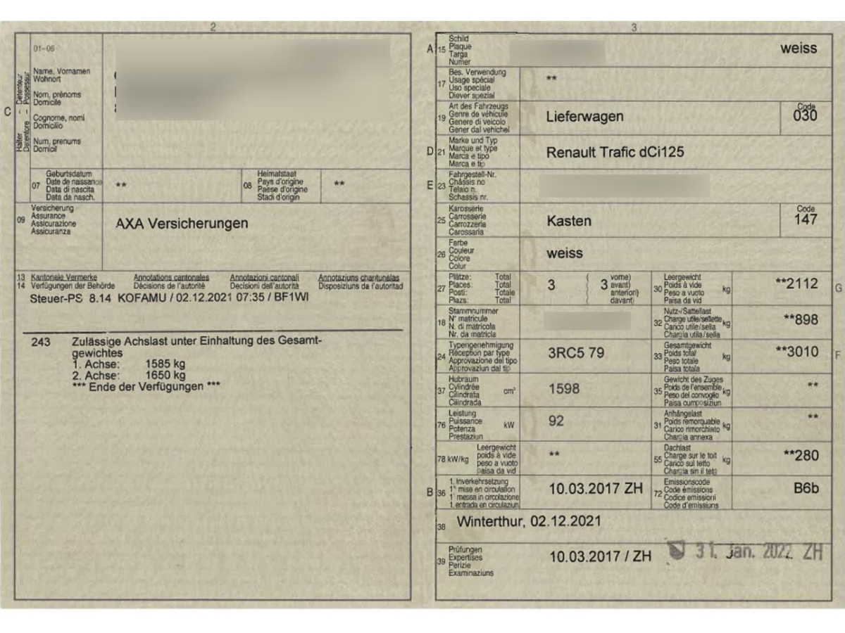 Die (vom Fahrzeugexperten) ermittelten Reparaturkosten beziehen sich auf das versicherte Ereignis. Allfällige zusätzliche, nicht versicherte Schäden/Vorschäden, sind in den Reparaturkosten nicht enthalten. Die deklarierten Ausstattungsmerkmale können von der effektiven Ausstattung abweichen. Achtung Bei einem Hochvoltsystem – Spannungsfreiheit prüfen. Sicherheitshinweise und Betriebsanleitungen des Herstellers konsultieren und befolgen. |