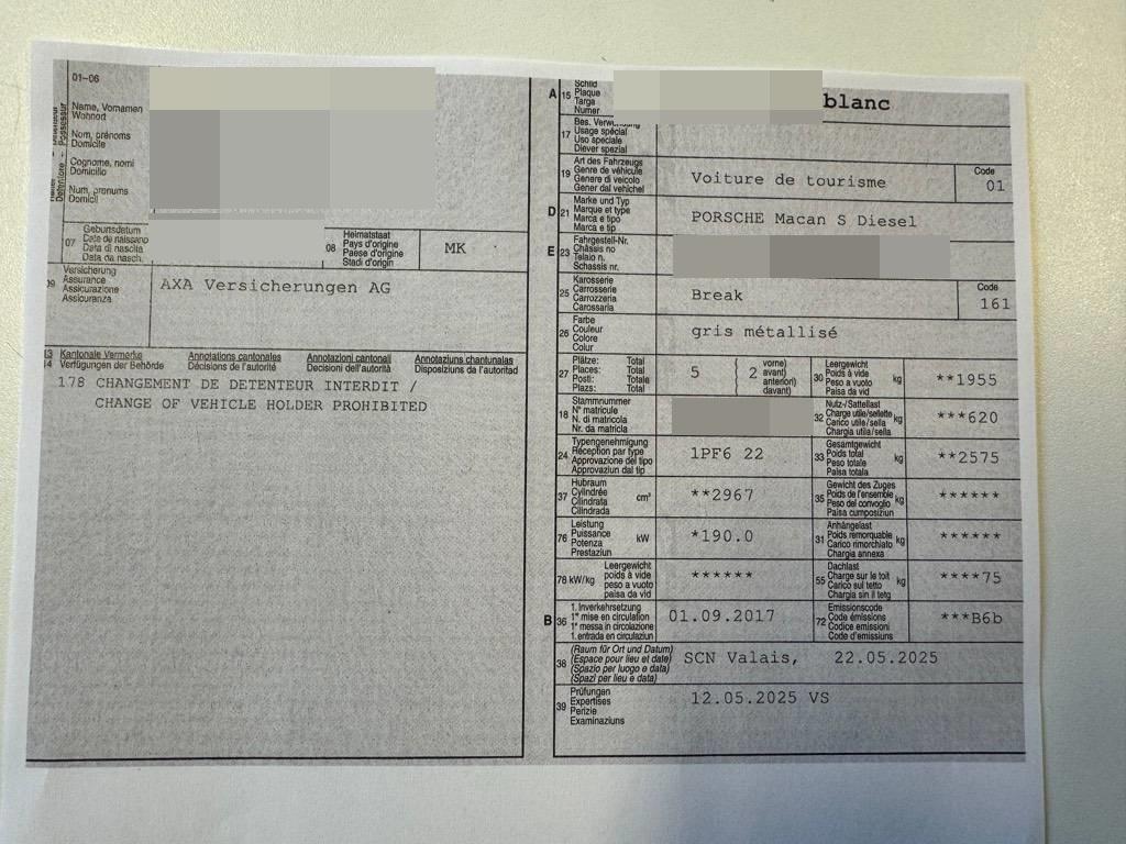 Offroad-Fahrprogramm mit Offroad-Taste, Nichtraucherausführung, Heckscheibenheizung, Fahrer-Informationssystem mit Farbdisplay, Heckklappe automatisch, Sitze: Rücksitzlehne geteilt abklappbar, Einstiegsschienen mit Logo, Gurtkontrolle, Airbag: Curtain Airbag, Leseleuchten, Tempomat mit Geschwindigkeitsbegrenzer, Aussenspiegel rechts und links beheizt, elektrisch verstell- / und einklappbar, Airbag: Airbag Beifahrer deaktivierbar, Laderaumabdeckung, Nebelscheinwerfer, Schriftzug, Handschuhfach gekühlt, Airbag: Thorax Seitenairbag für Fahrer und Beifahrer, Sporttaste, Ablagefach im Kofferraum, Assist: Seitenaufprall-Schutzsystem, Mittelkonsole mit Ablagefach, Aussentemperaturanzeige, Licht: LED Blink- und Positionsleuchten, Airbag: Airbag Fahrer und Beifahrer, Höhenverstellbare Gurten vorne, Paket: Sound Package Plus, 3-Punkt-Sicherheitsgurte auf allen Plätzen, Fahrstabilisierungssystem Porsche – Stability-Management (PSM), Antiblockiersystem (ABS), Bremsassistent (BAS), Wegfahrsperre elektronisch, Seitenschutz-Zierleisten in aluminium Look, Licht: LED Heckleuchten, Steckdose 12V, Alcantara-/Kunstleder-Ausstattung, Bremsbelag-Verschleissanzeige, Wärmeschutzverglasung, Räder: Reifenreparatur-Set mit Kompressor, Ladekantenschutz, Regensensor für Scheibenwischer vorne, Partikelfilter und Oxydationskatalysator, Licht: Drittes Bremslicht LED, Lenkrad: Lenkrad längs- und höhenverstellbar, Leichtmetallräder im 5-Doppelspeichen – Design 18J, Assist: Auto-Hold-Funktion, Cupholder vorne und hinten, Media: Zweiter USB-Anschluss, Dachspoiler, Auto Start-Stop-Funktion, Bordcomputer, Mittelarmlehne hinten, Bremssättel lackiert, Pollenfilter (Staubfilter), Lackierung: Uni-Lackierung, Auspuffanlage mit 4 Endrohren, Scheibenwischer vorne mit Intervall, Zentralverriegelung mit Fernbedienung, Assist: Bergabfahrassistent, Lenkrad: Multifunktionslenkrad mit Schaltwippen, Porsche Communication Management (PCM), Lenkrad: Sportlenkrad, Halogenscheinwerfer, Elektrische Fensterheber vorne + hinten mit Komfortschliessung, Media: Multifunktions-Antenne, Sequentielles 7-Gang-Getriebe mit Automatikfunktion, Elektronische Parkbremse, Klima: 3-Zonen-Klimatisierungsautomatik, Wartungsintervall-Anzeige, Paket: Interieur Paket schwarz Hochglanz, Multifunktionsanzeige, Gurtstraffer vorne, Räder: Reifendruckkontrollsystem ( RDK ), Media: USB-Anschluss, Aktive Kopfstützen, Dachhimmel, Tagfahrlicht, Ablagen in den Türen, ISOFIX Kindersitzvorrichtung, Licht: Fahrlichtassistent (automatisches Fahrlicht), Schriftzüge auf der Gepäckraumklappe, Komplette Telefonvorbereitung mit Bluetooth, Aktivkohlefilter (Geruchsfilter), Beleuchtetes und abschliessbares Handschuhfach, Airbag: Seitenairbags, Vorbereitung für Anhängevorrichtung, Sitze: Komfortsitze vorne elektr. verstellbar, Assist: Porsche Traction Management (PTM), Licht: Nebelschlussleuchte, Dekor: Interieur Paket in Serienfarbe, Allradantrieb permanent, Heckscheiben-Wisch-/Waschanlage