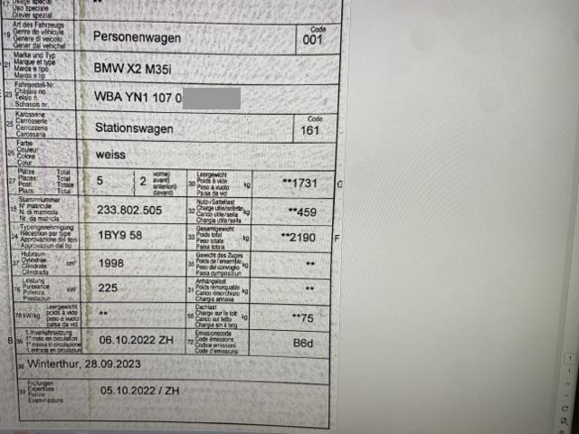 Serienaustattung Fahrer und Beifahrer-Airbag Seitenairbag für Fahrer und Beifahrer Reifendruck-Kontrollsystem RDC Aussenspiegel elektrisch verstellbar und heizbar Armauflage vorn Automatische Heckklappenbetätigung Regensensor Dynamische Stabilitäts-Control DSC Antiblockiersystem ABS Servotronic M-Sportfahrwerk Pack Ablage Hochglanz Shadow-Line Dachhimmel anthrazit Hill Descent Control HDC M-Lederlenkrad M Heckspoiler Sportsitze für Fahrer und Beifahrer Velours-Fussmatten Radio BMW Multifunktions-Lenkrad Kopfairbags vorne + hinten Pack Licht Dynamische Traktions-Control DTC Park Distance Control PDC hinten Geschwindigkeitsregelung mit Bremsfunktion Klimaautomat 2-Zonen inkl. Mikrofilter Kindersitzbefestigung Isofix für Fondsitze Digital audio DAB-Tuner Auto Start Stopp Funktion Performance Control (Drehmomentverteilung) Rücksitzlehne geteilt umklappbar 40/20/40 Freisprecheinrichtung mit USB-Schnittstelle LED-Nebelscheinwerfer Keine Gewähr auf die Angaben der Serienausstattungen M Sportbremse ConnectedDrive Services Remote Services LED-Scheinwerfer mit erweiterten Umfängen Grösserer Kraftstofftank BMW Service Plus 10 Jahre/ 100’000 km Teleservice Intelligenter Notruf M Sportlenkung Ottopartikelfilter Aufmerksamkeitsassistent Active Guard Stoff Hexagon/ Sensatec Sonderausstattung |
