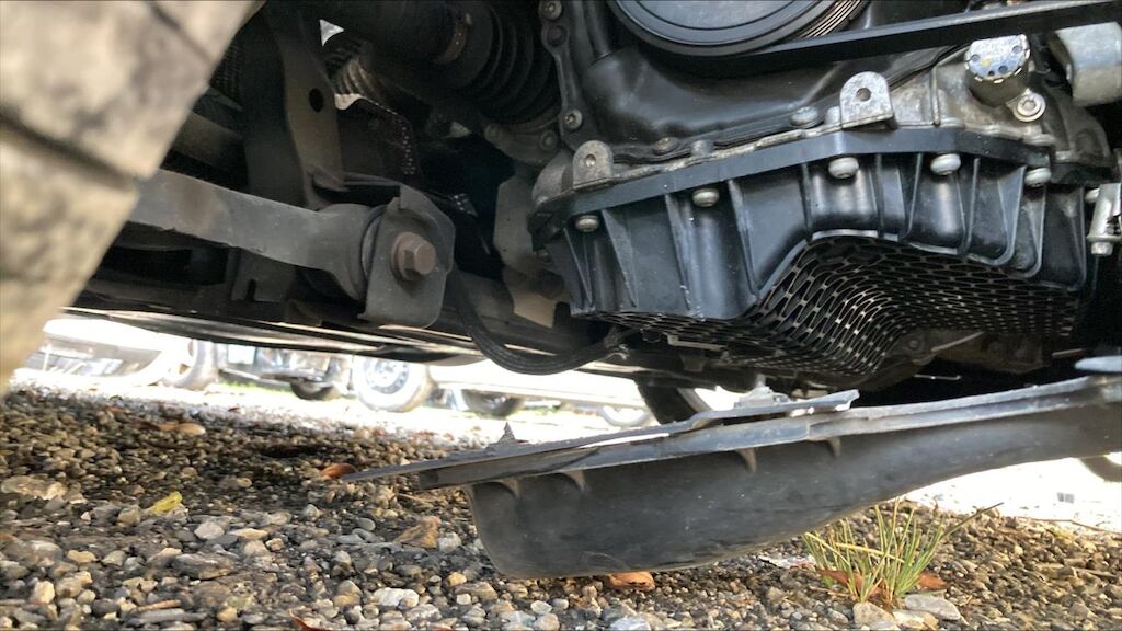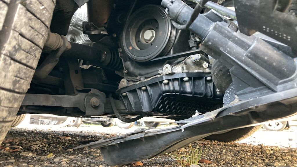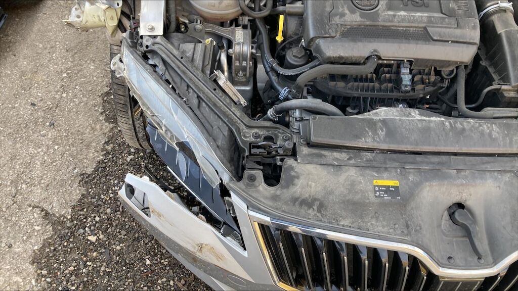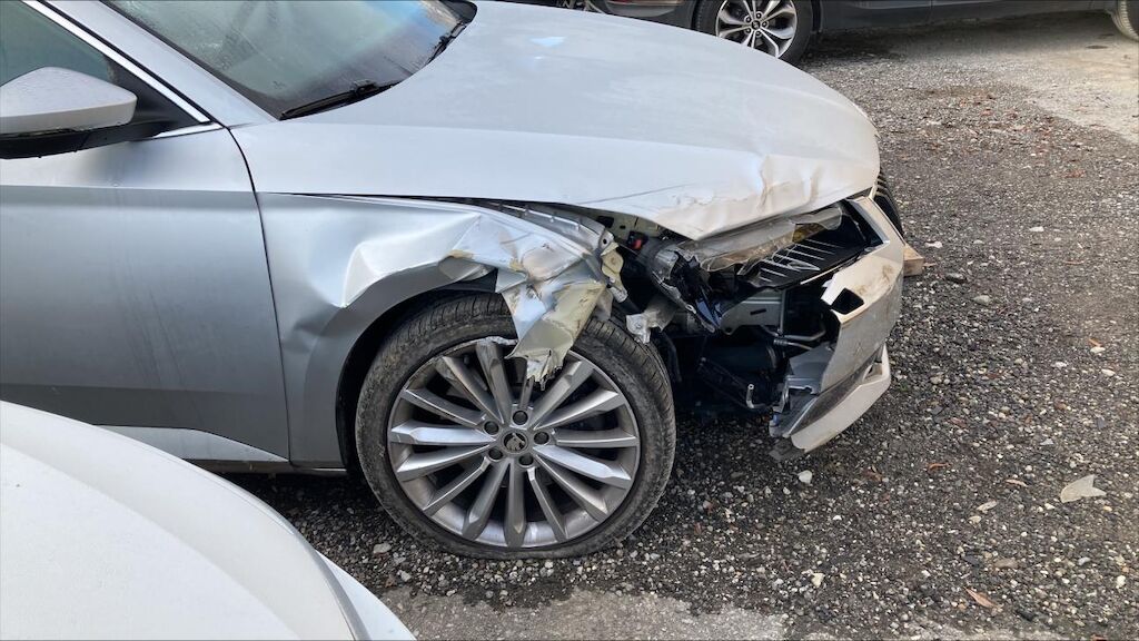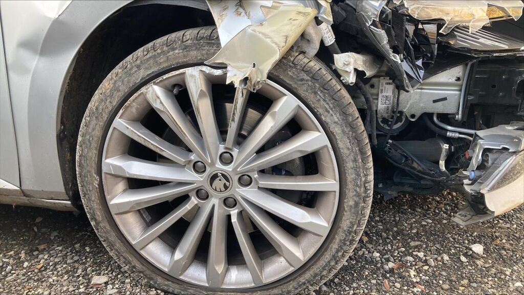 Jante avant droite enfoncée, pneu abîmé, mécanique refoulée.