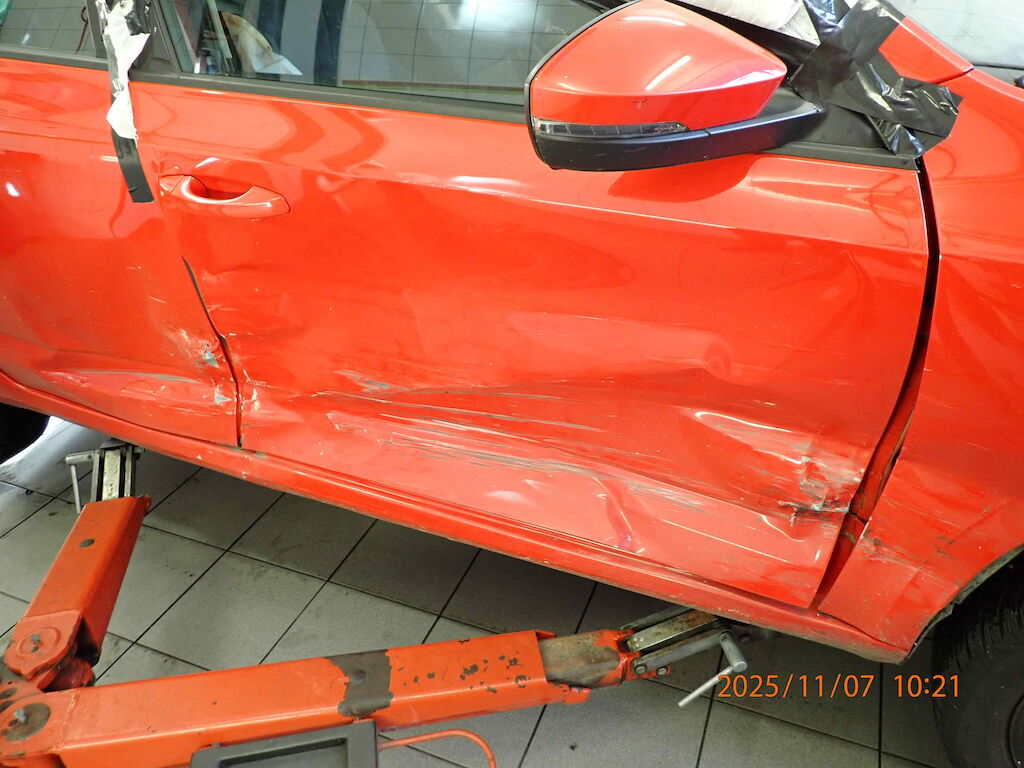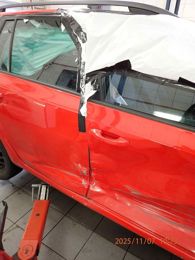 Offensichtlicher Totalschaden: Kotflügel, Türen rechts, B-Säule, Schweller und Seitenwand rechts beschädigt. Kopf und Seitenairbag rechts ausgelöst. Stossstange vorne links zerkratzt.
