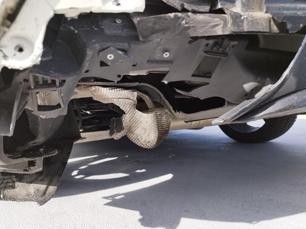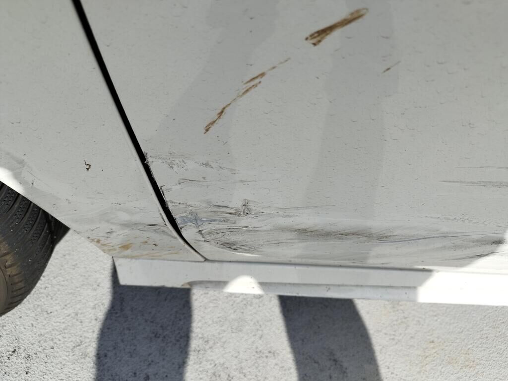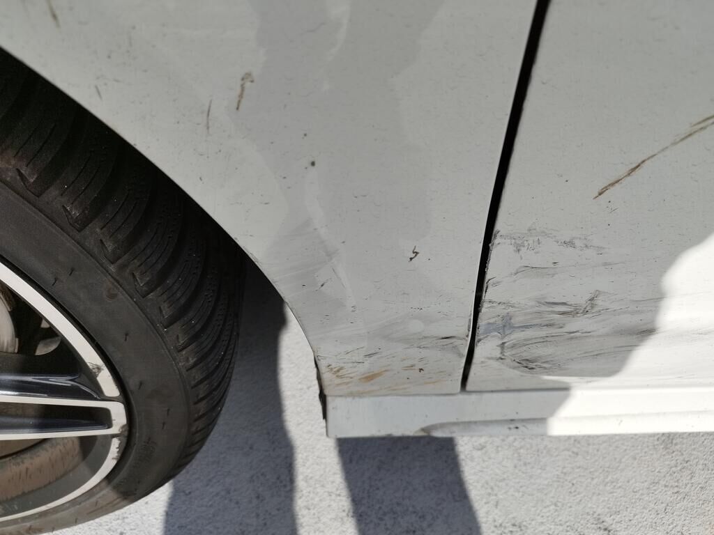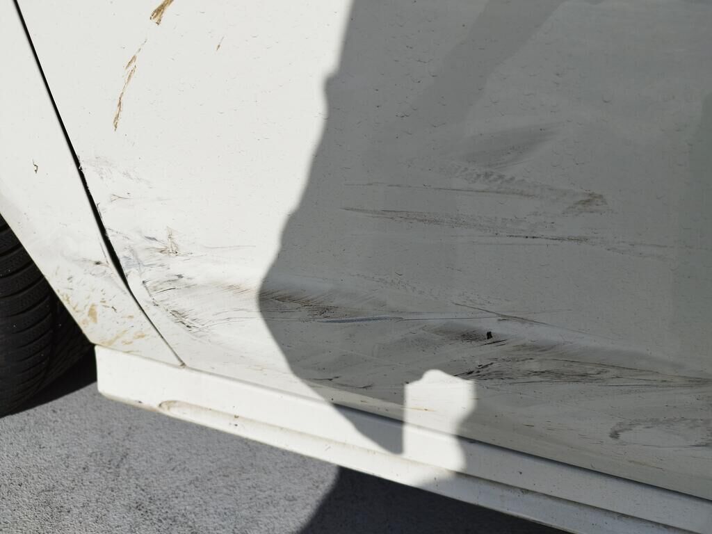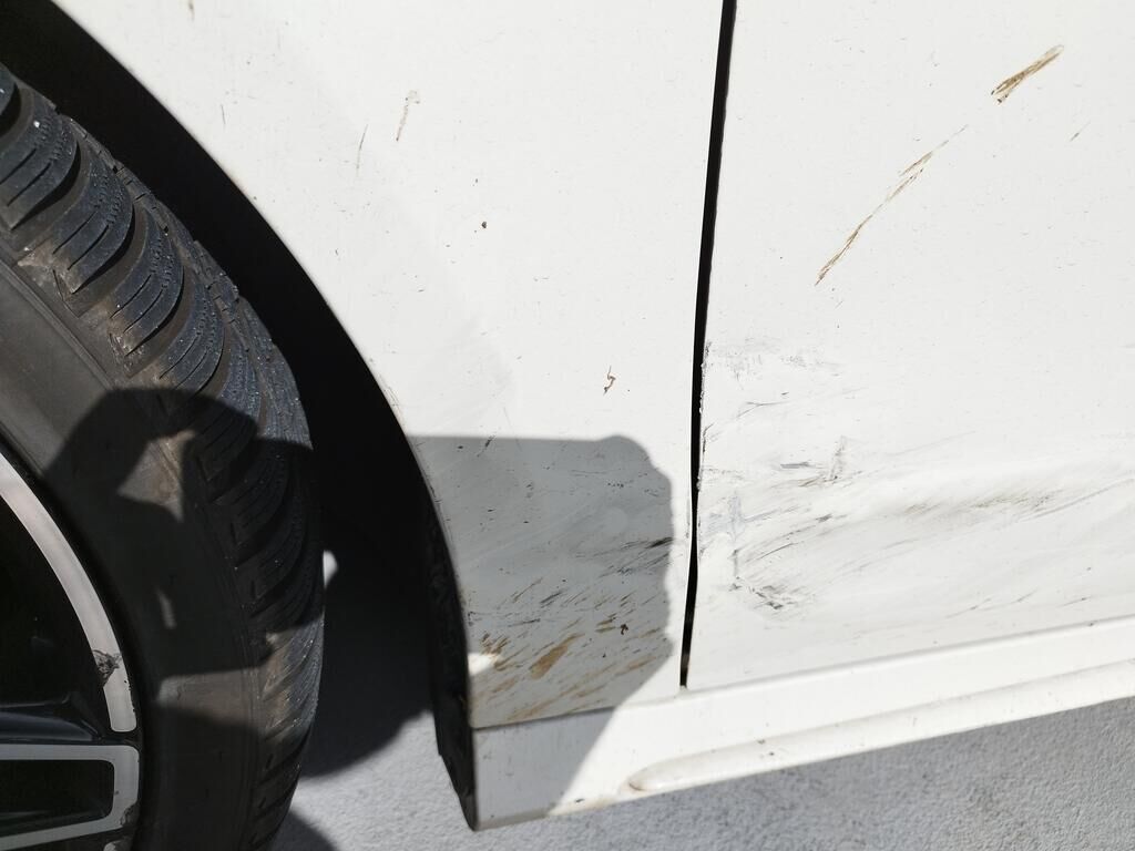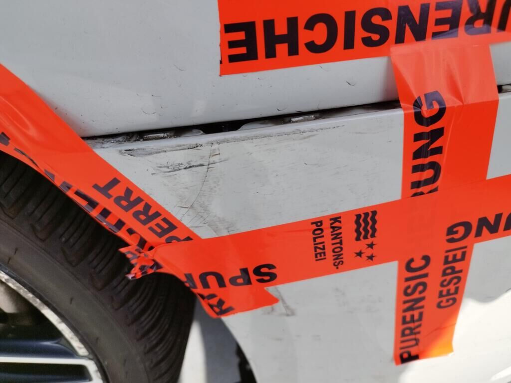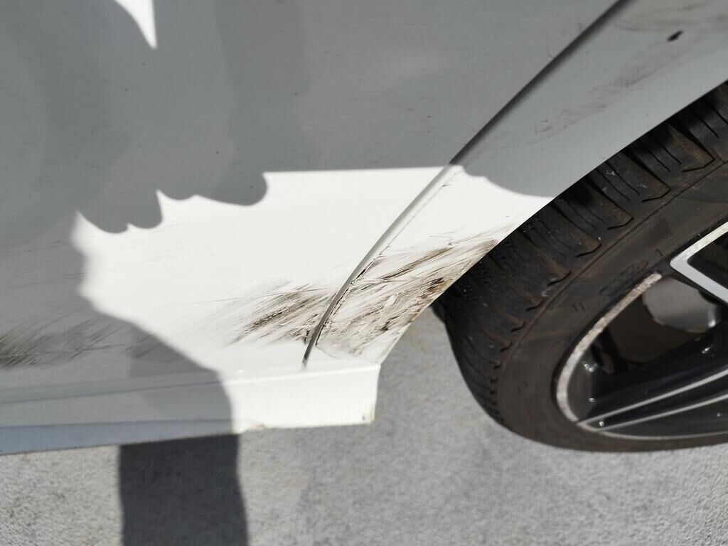 Der Kotflügel vorne links ist deformiert, die Türe vorne links ist deformiert, die Türe hinten links ist deformiert, die Schwellerblende links hat Kratzspuren, die Seitenwand hinten links hat Kratzspuren und eine Delle, die Felge hinten links hat Kratzspuren, die Stossstange hinten links ist gerissen, diverse Anbauteile sind gerissen, der Auspuff hinten links ist abgerissen, die Heckleuchte links ist gerissen.