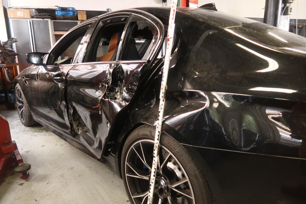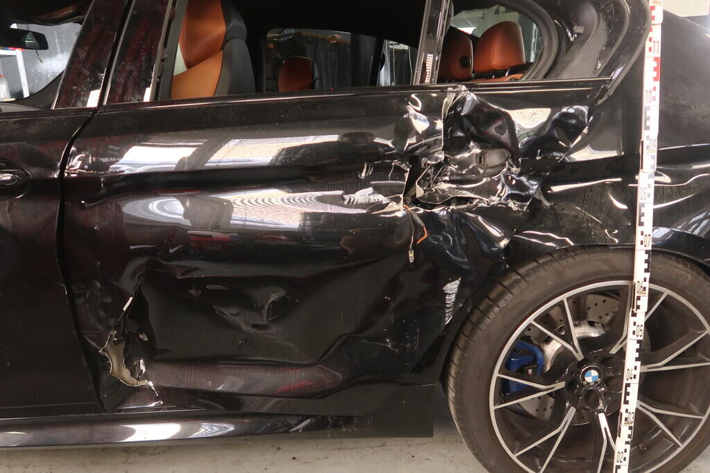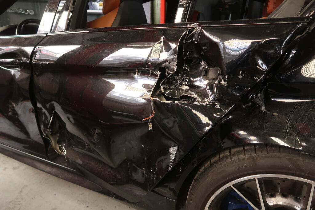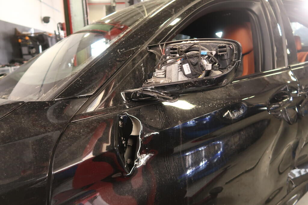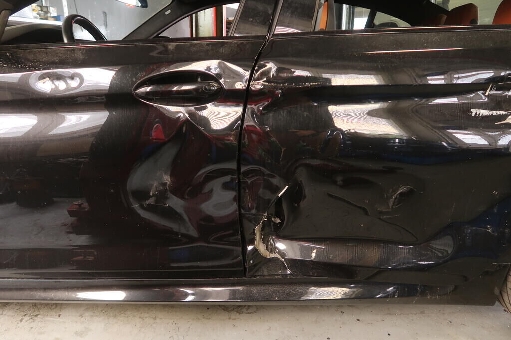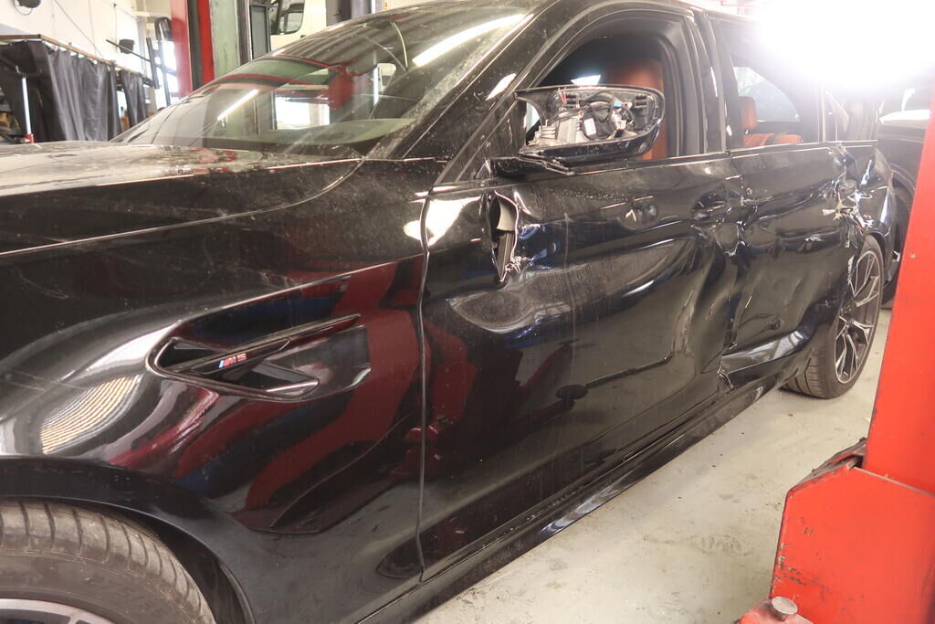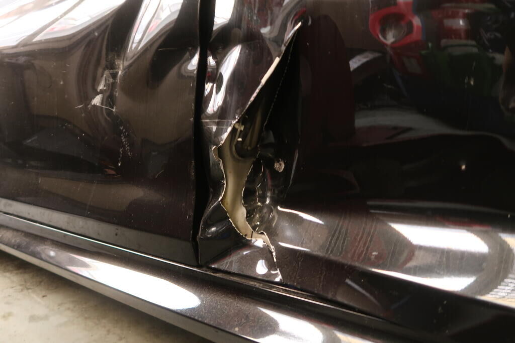 Aile arrière, porte et poignée arrière, porte avant, rétroviseur, montant supérieur avant, pied du milieu, vitre de porte arrière, revêtement porte arrière, lèche-vitre arrière; endommagés.
