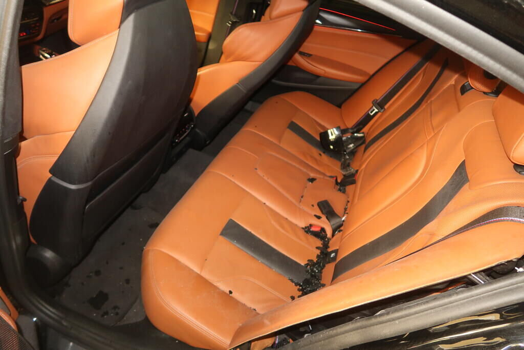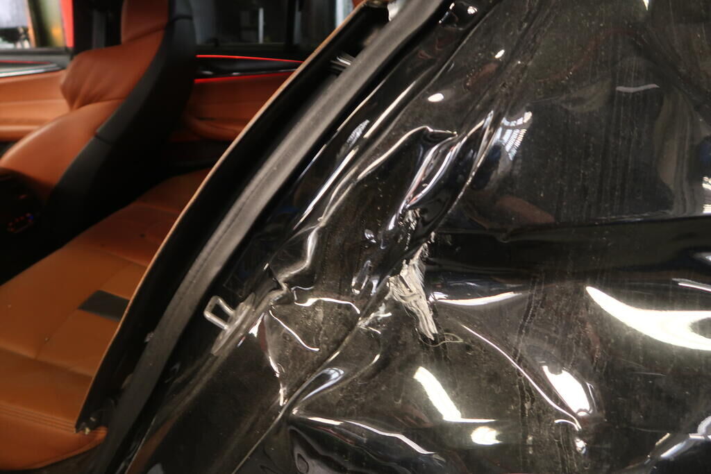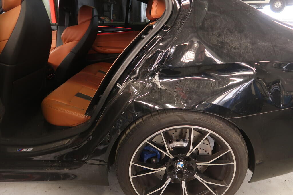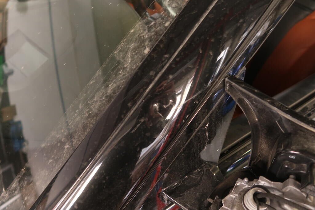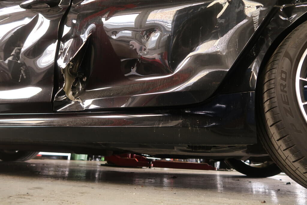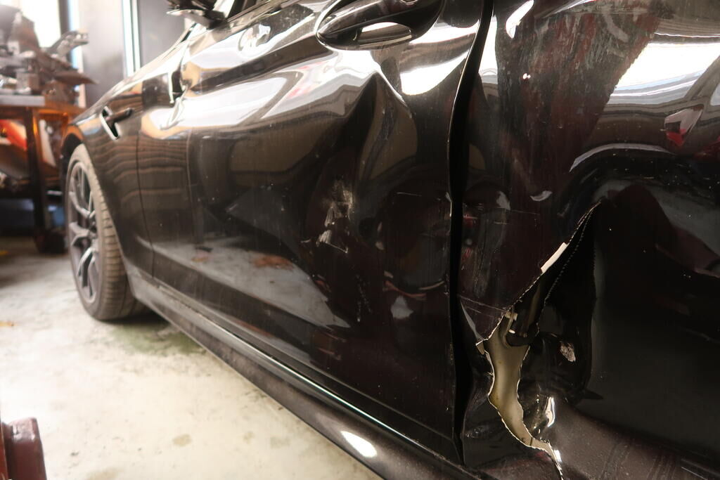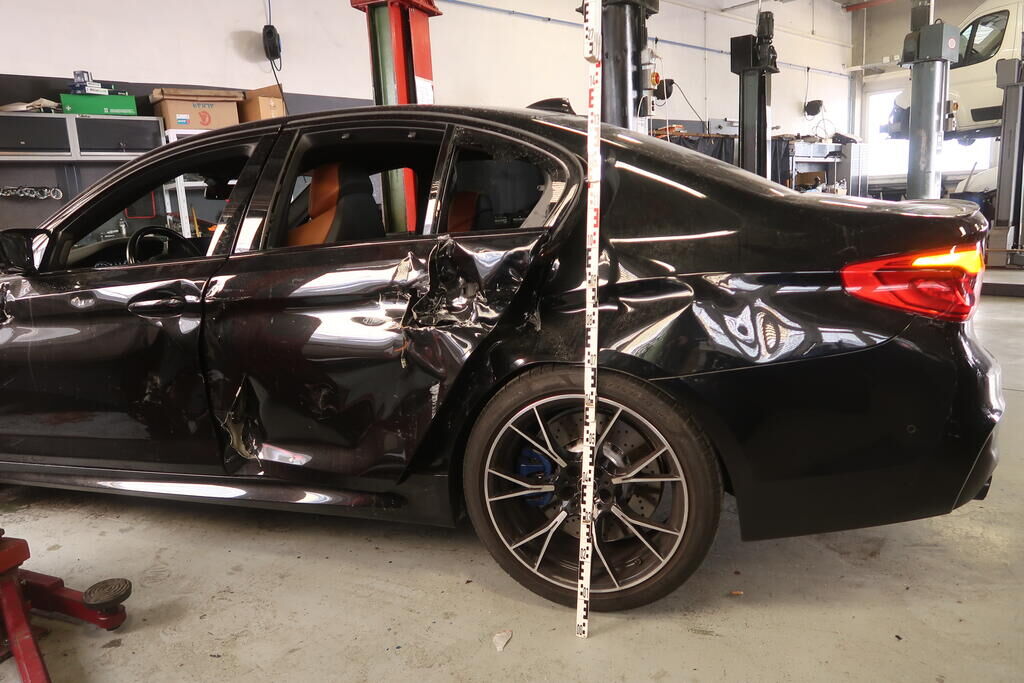 Aile arrière, porte et poignée arrière, porte avant, rétroviseur, montant supérieur avant, pied du milieu, vitre de porte arrière, revêtement porte arrière, lèche-vitre arrière; endommagés.