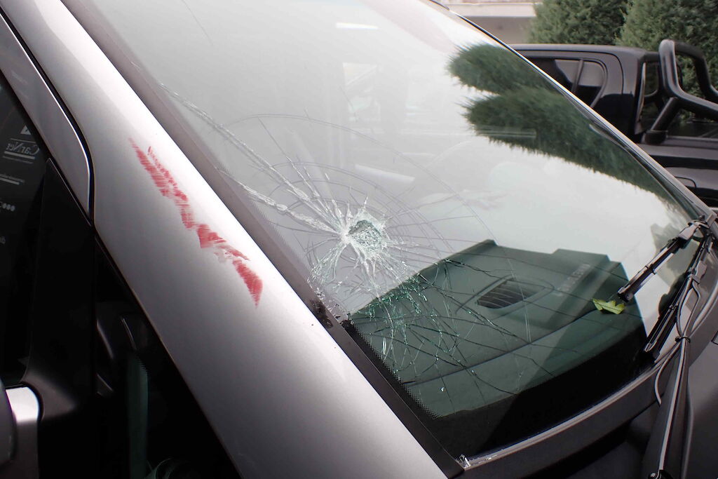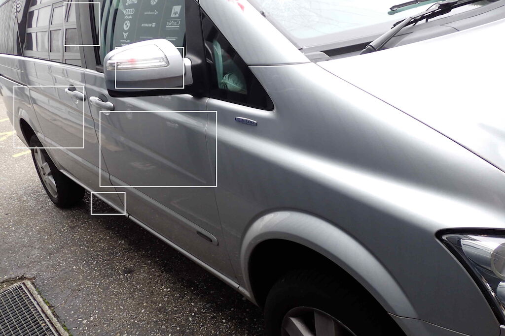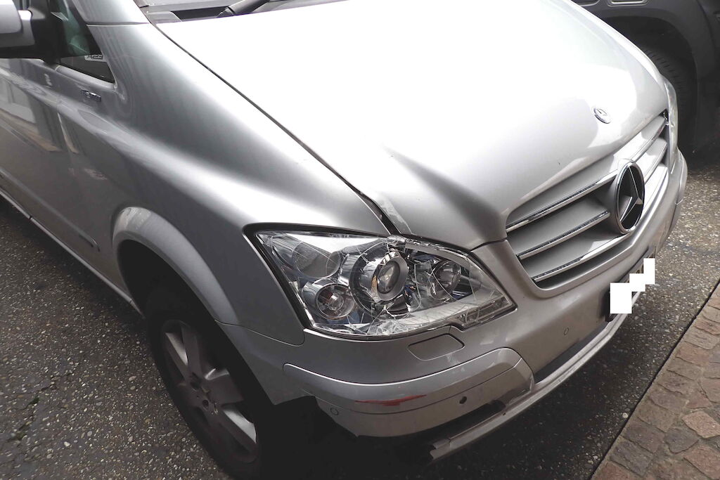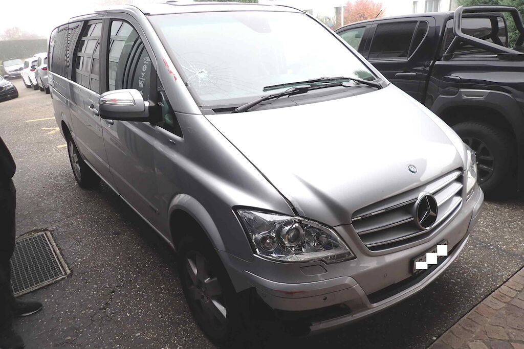 Stossfänger vr abgerissen, Motorhaube und Kotflügel vr deformiert, Scheinwerfer r und Frontscheibe gebrochen, Dach im vorderen Bereich deformiert (Vorschaden Dach im hinteren Bereich deformiert, Dachantenne beschädigt), A-Säule r oben, Aussenspiegel r, Türen r und Seitenwand hr zerkratzt, Dachrahmen r zerkratzt