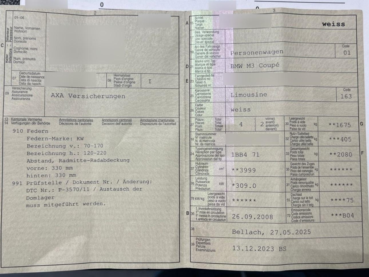 Radio BMW Professional, Anfahrassistent, Sitzbelegungserkennung für Beifahrersitz, Bremsassistent (BAS), Beide Make up-Spiegel beleuchtet, Lichtwarnsummer, Check-Control-System, Katalysator geregelt, Abschliessbare Radschrauben, Befestigungsösen im Laderaum, Lenkrad: Lenkrad längs- und höhenverstellbar, Aussentemperaturanzeige, Variable Visco – Hinterachssperre, Grün getönte Scheiben, Klimatisierungsautomatik, Oelstandsanzeige, Aussenspiegel rechts und links beheizt und elektrisch verstellbar, asphärisch gewölbtes Spiegelglas, Diebstahlwarnanlage, Regensensor für Scheibenwischer vorne, Drittes Bremslicht, Airbag: Airbag Fahrer und Beifahrer, Wassertemperaturanzeige, Nichtraucherausführung, Heckscheibenheizung, Licht: Nebelschlussleuchte, Licht: Leuchtweitenregulierung automatisch, Pollenfilter (Staubfilter), Scheibenwaschdüsen beheizt, Scheibenwischer vorne mit Intervall, Sitze: Sportsitze vorne, Innenraumlicht-Paket, Aussenspiegel und Türgriffe in Wagenfarbe, Armauflage vorne, verschiebbar, Seitenairbags, Gurtbringer elektrisch vorne, Assist: Cornering Brake Control (CBC), Antiblockiersystem (ABS), Innenspiegel automatisch abblendbar, Servotronic, Frontscheibe mit Color-Band, Park Distance Control vorne und hinten, Stoff-/Leder-Ausstattung, Kühlergrill mit Chromzierrand, Sportauspuffanlage, Sitzbelegungserkennung für Beifahrersitz, Bi-Xenon Lichtanlage, Interieurleisten in Titan Shadow, Lichtpaket, Weisse Blinkleuchten, ISOFIX Kindersitzvorrichtung, BMW Individual Dachhimmel Anthrazit, Dach in CFK Optik, Wartungsintervall-Anzeige, Lederhandbremshebel, Veloursfussmatten vorne und hinten, Bremsbelag-Verschleissanzeige, Tagfahrlicht, Sequentielles 7-Gang-Doppelkupplungs- getriebe mit Automatikfunktion, M Sportfahrwerk, Leseleuchten vorne, Mittelarmlehne vorne, Verbandskasten, Ablagenpaket, Zweiklanghorn, Aktive Kopfstützen, Höhenverstellbare Gurten vorne, M Lederlenkrad mit Schaltwippe und Multifunktion, Scheinwerfer-Waschanlage, Gurtstraffer vorne, Rücksitzlehne geteilt abklappbar, M Differenzialsperre, Fussraumbeleuchtung vorne, Innenlicht-Abschaltverzögerung, Stossstangen in Wagenfarbe, 6 Lautsprecher, Drehzahlmesser, Tageskilometerzähler, Tempomat, Wegfahrsperre elektronisch, Start-/Stop-Knopf, Window-Kopfairbags, Vordersitze elektrisch verstellbar, Fahrersitz mit Memory-Funktion, Dynamische Bremsleuchten, Automatikgurt in Fondmitte, 4 Leichtmetallfelgen im Doppelspeichen- styling (260M) 8.5x18J V./9.5x18J H. mit Pneu, Zentralverriegelung mit Fernbedienung, Elektrische Fensterheber vorne, Mittelarmlehne hinten, Durchladeklappe, (AUX) Auxiliary InlineSystem, Dynamische Stabilitätskontrolle (DSC), Durchladeöffnung im Kofferraum, Bordcomputer, Leseleuchten hinten, Digital Uhr