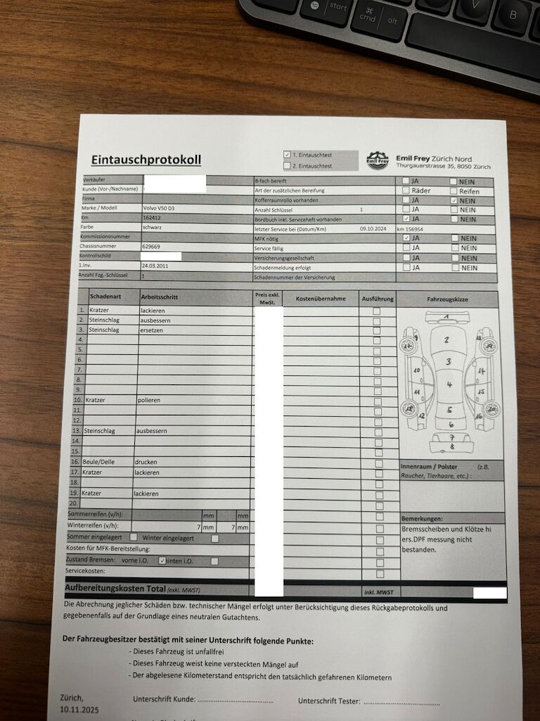 | Keine technische Prüfung (Werkstatttest) vorgenommen Diverse Schäden an Karosserie/Lack. Fahrzeug ab Platz, ohne Garantie und Aufbereitung. DPF/FAP Filter nicht kontrolliert Keine Gewähr auf die Angaben der Sonder- und Serienausstattung / keine mechanische Prüfung. Fahrzeug wurde unzerlegt expertisiert / keine Haftung für allfällige, nach Demontage bekanntwerdenden Mängel. Fahrzeugbereifung und Ausstattung gemäss Fotos / Fahrzeugkauf auf eigenes Risiko ab Platz ohne Nachwährschaft. – Div. kleine Kratzer am gesamten Fahrzeug. – Div. Kratzer an den Felgen. – Steinschlag in der Windschutzscheibe. – kleine Delle hinten rechts |