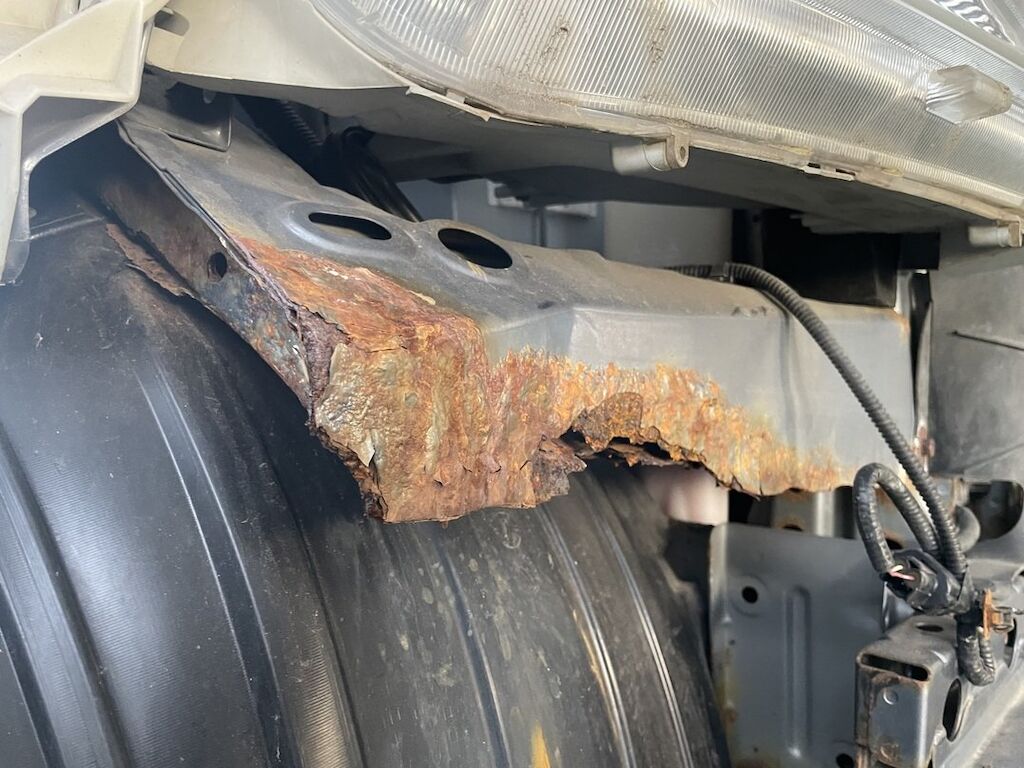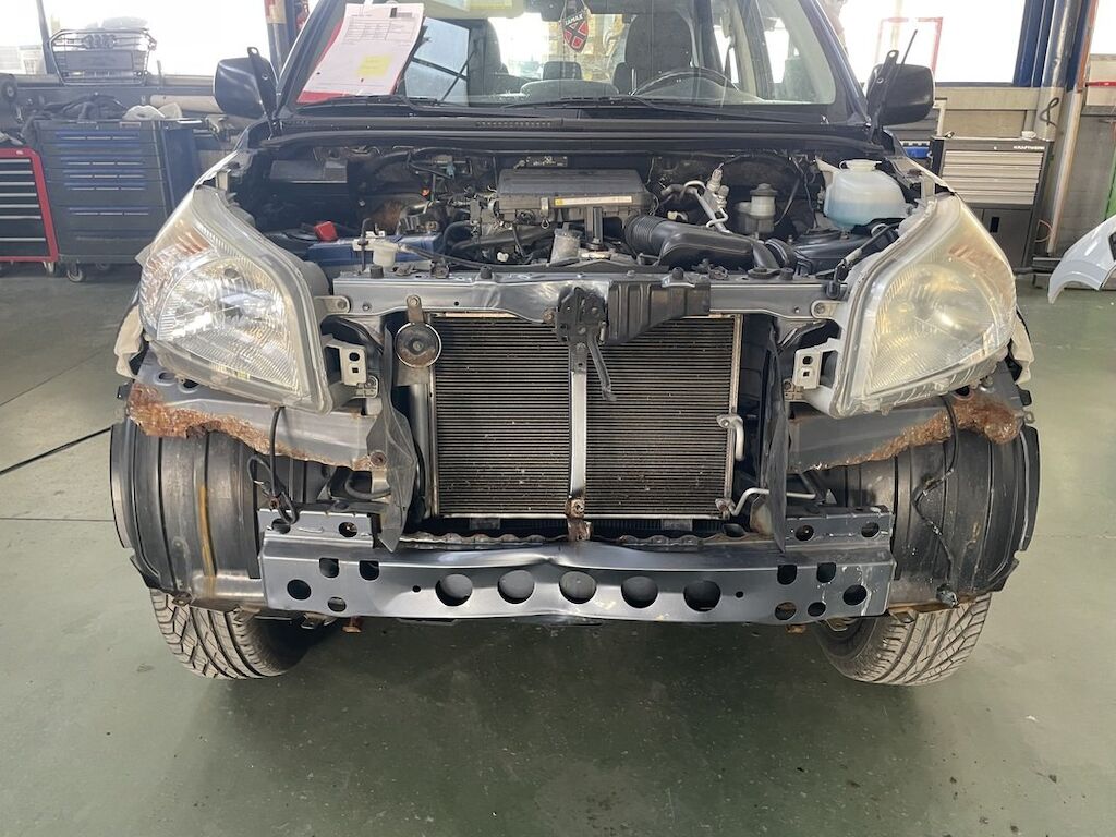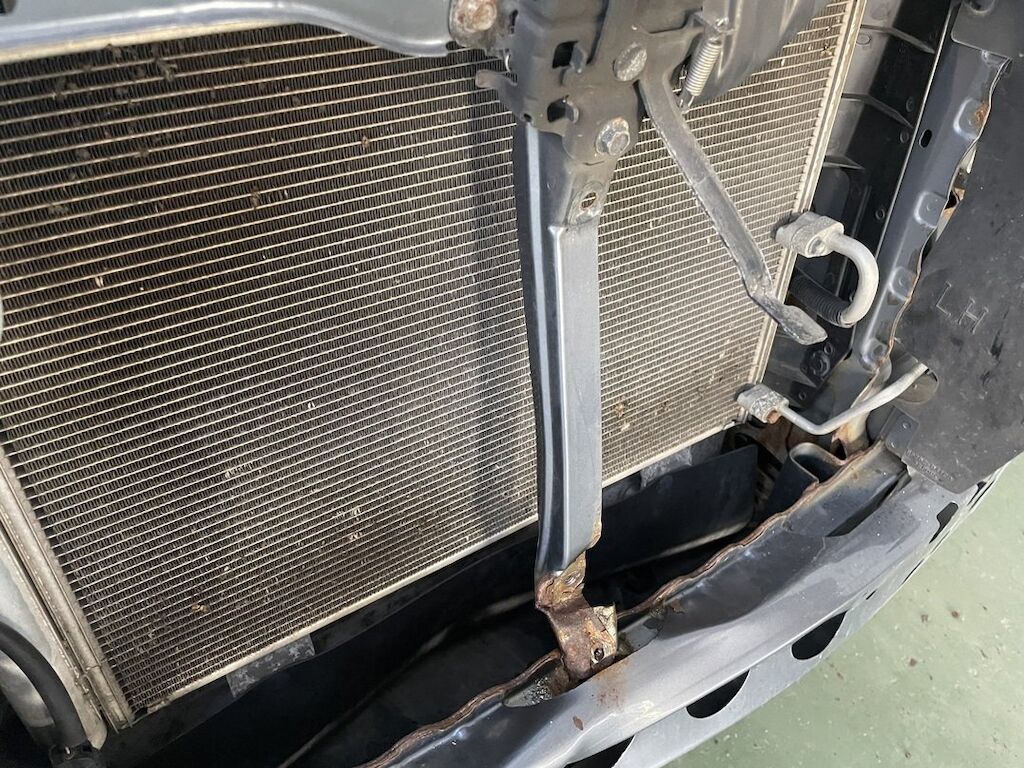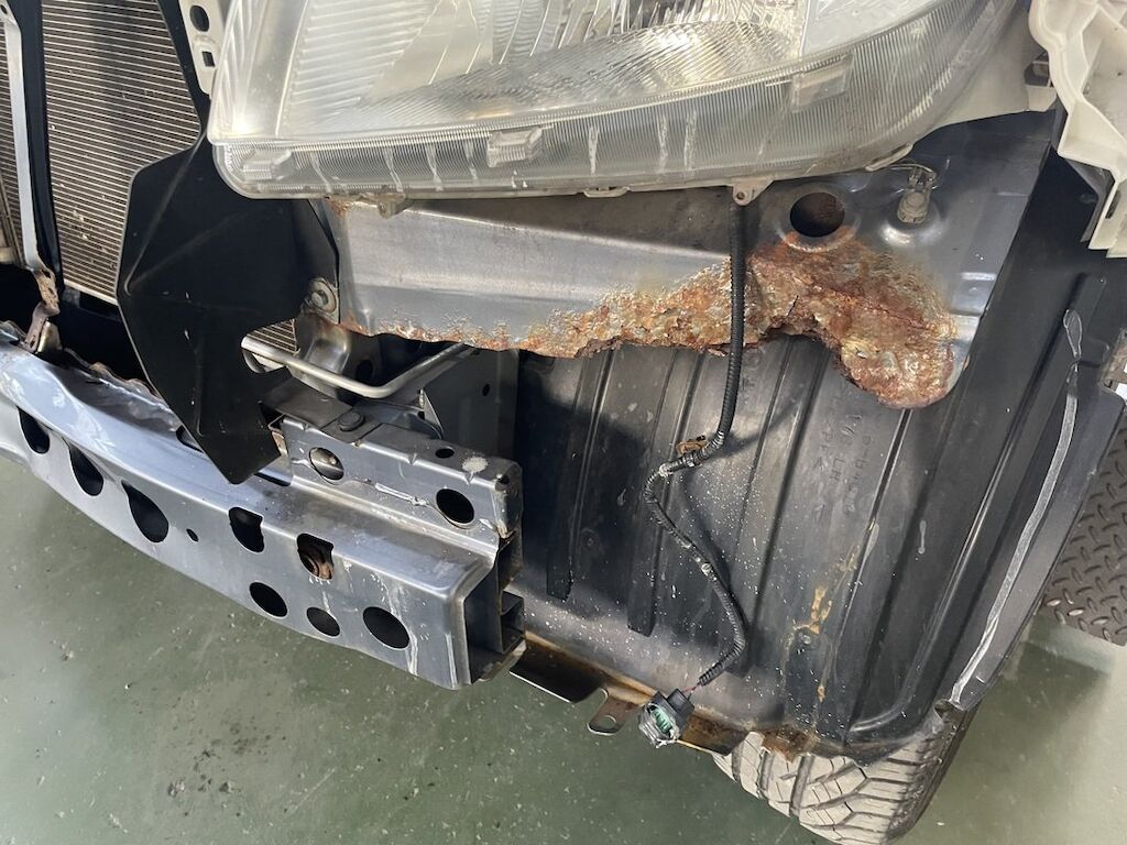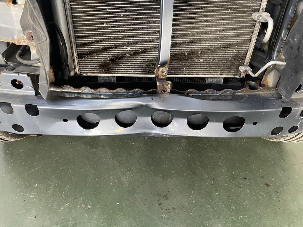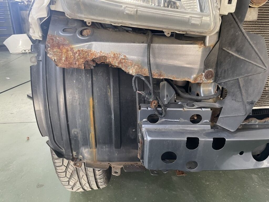 Pare-chocs, capot, traverse, tôle frontale et calandre endommagés. Dommages préexistants, rouille sur les supports de pare-chocs et passages de roue avant.