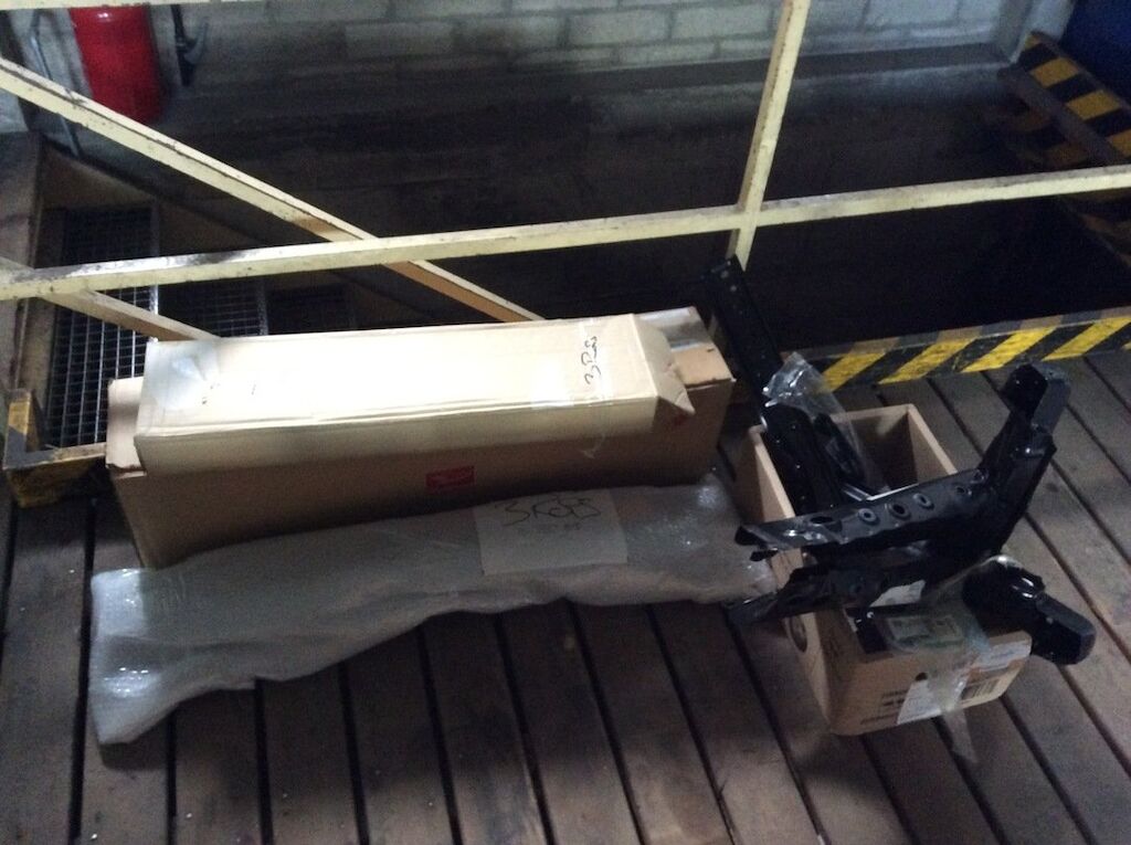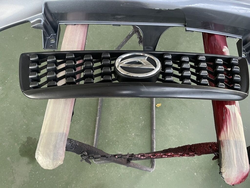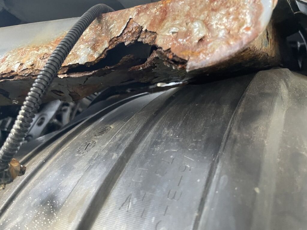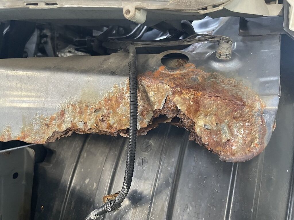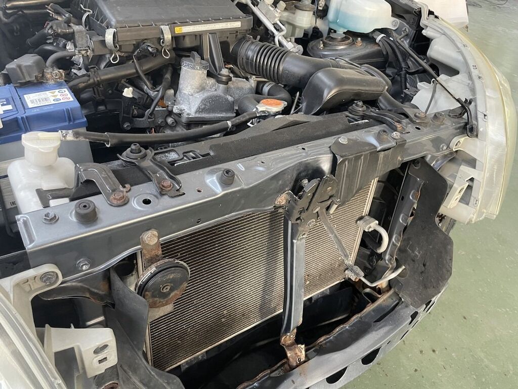 Pare-chocs, capot, traverse, tôle frontale et calandre endommagés. Dommages préexistants, rouille sur les supports de pare-chocs et passages de roue avant.
