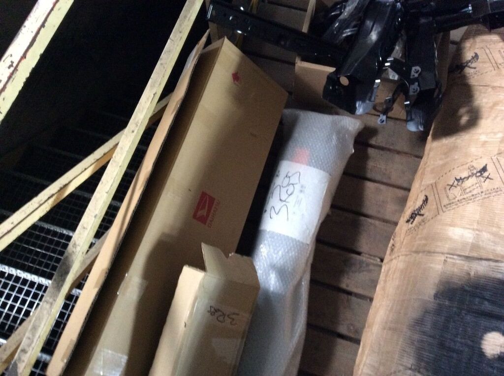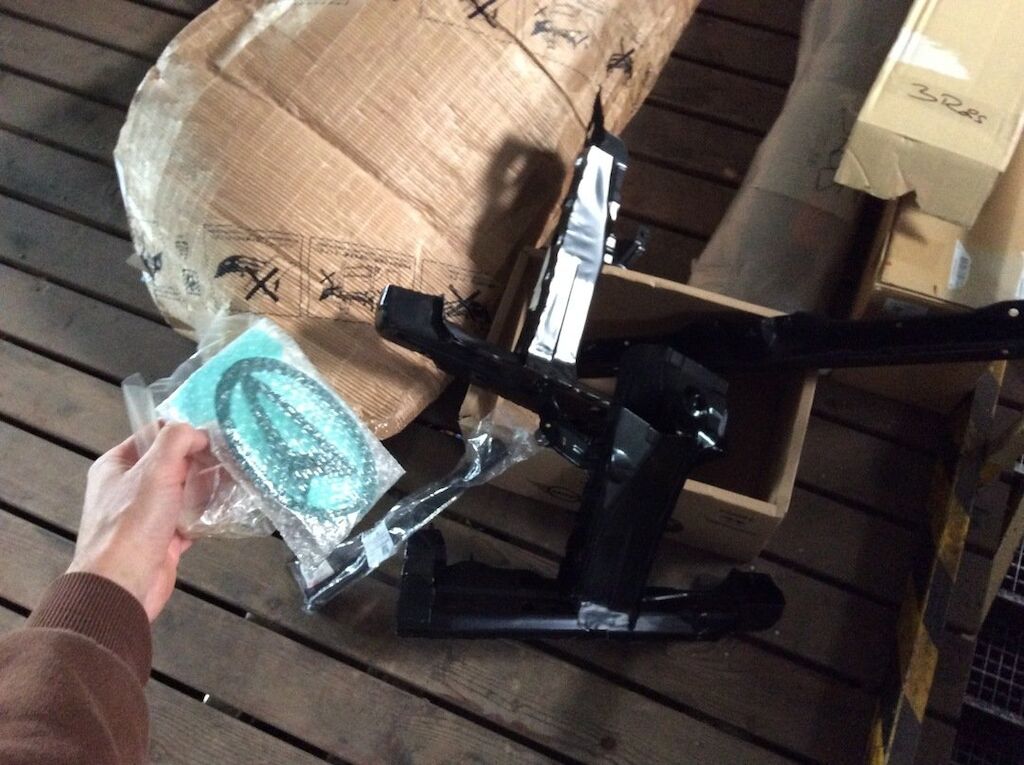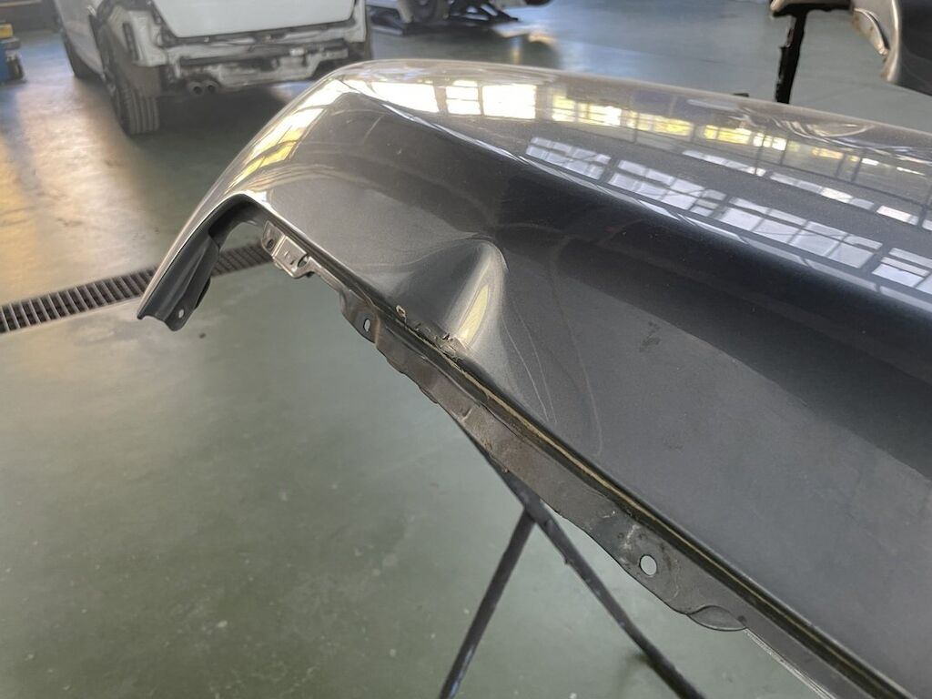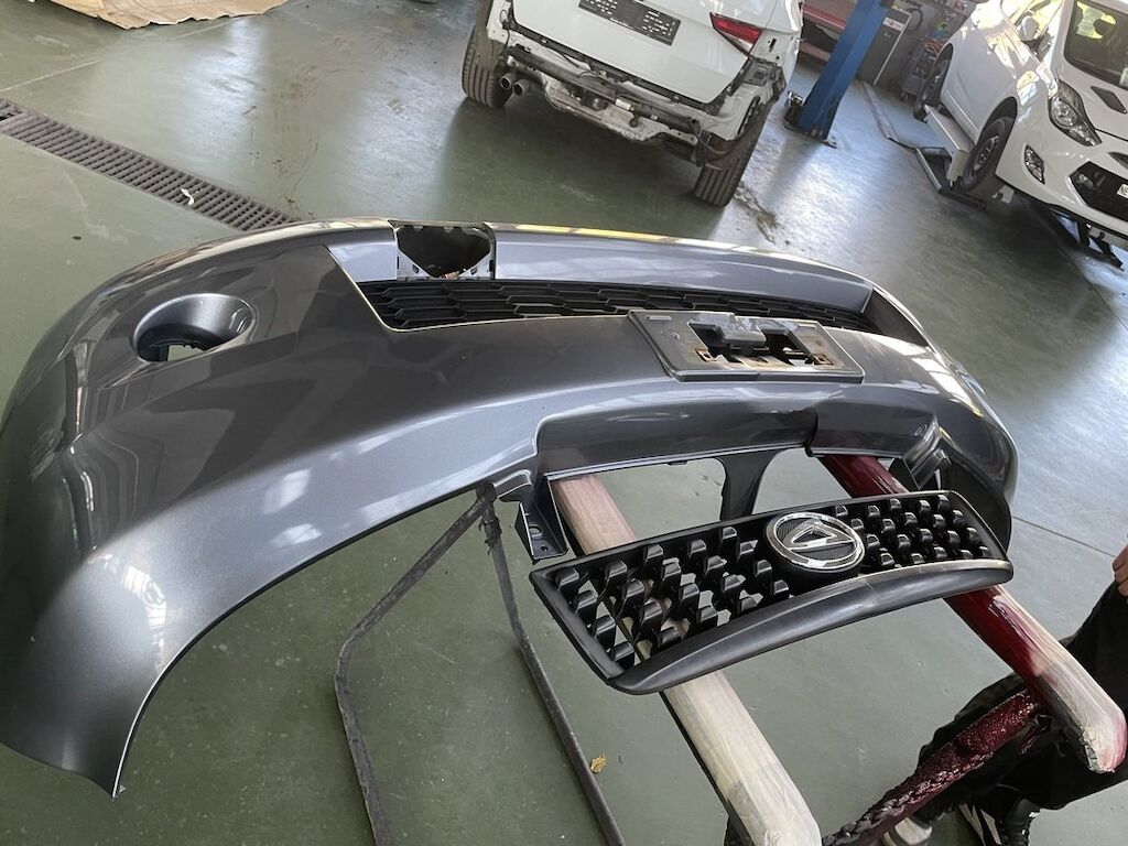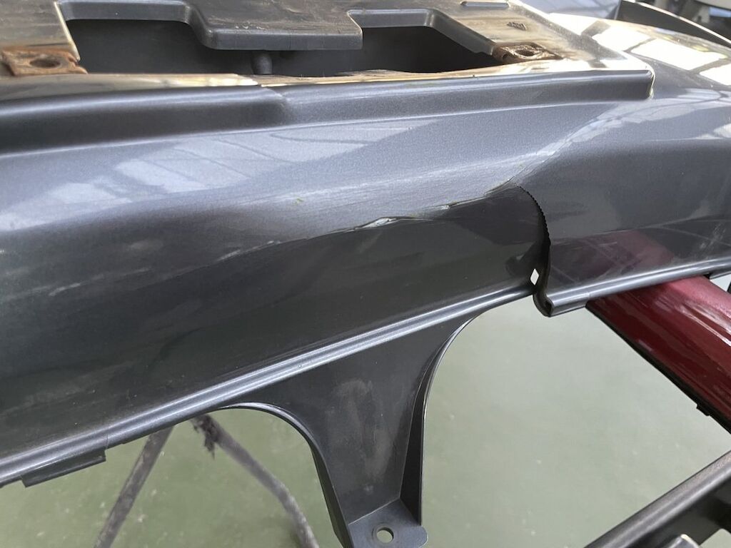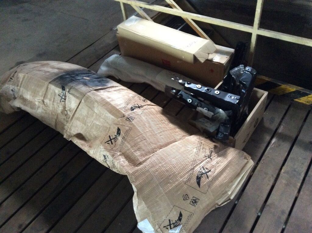 Pare-chocs, capot, traverse, tôle frontale et calandre endommagés. Dommages préexistants, rouille sur les supports de pare-chocs et passages de roue avant.