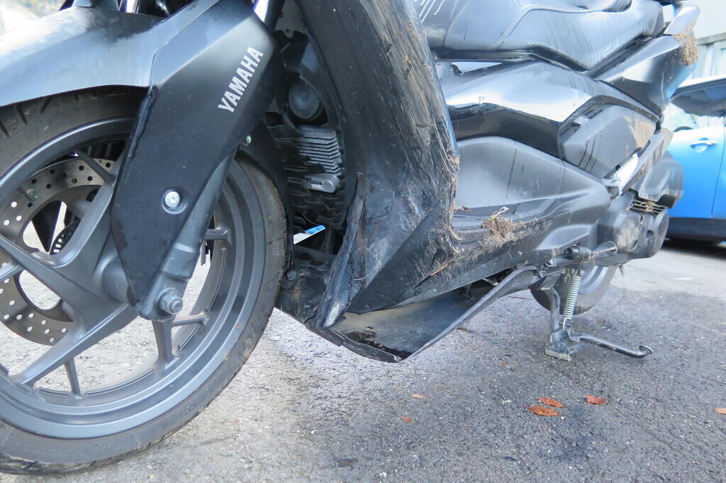 dommage total suite sortie de route, divers carénages râpés et cassés, fourche pliée, guidon faussé, éclairage cassé, échappement endommagé, risque cadre faussé, divers garnissages et accessoires cassés.