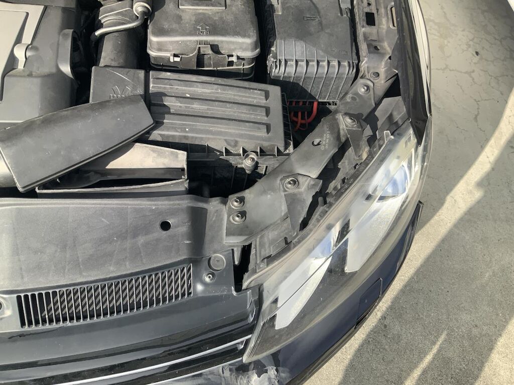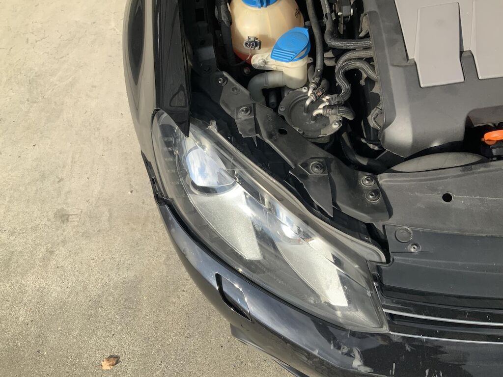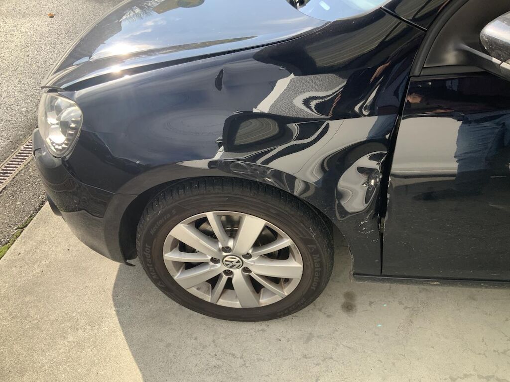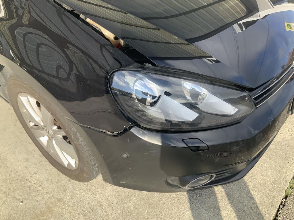 Motorhaube und Kotflügel und Fahrertüre eingebeult, beide Scheinwerfer, Stossstange etc, beschädigt.