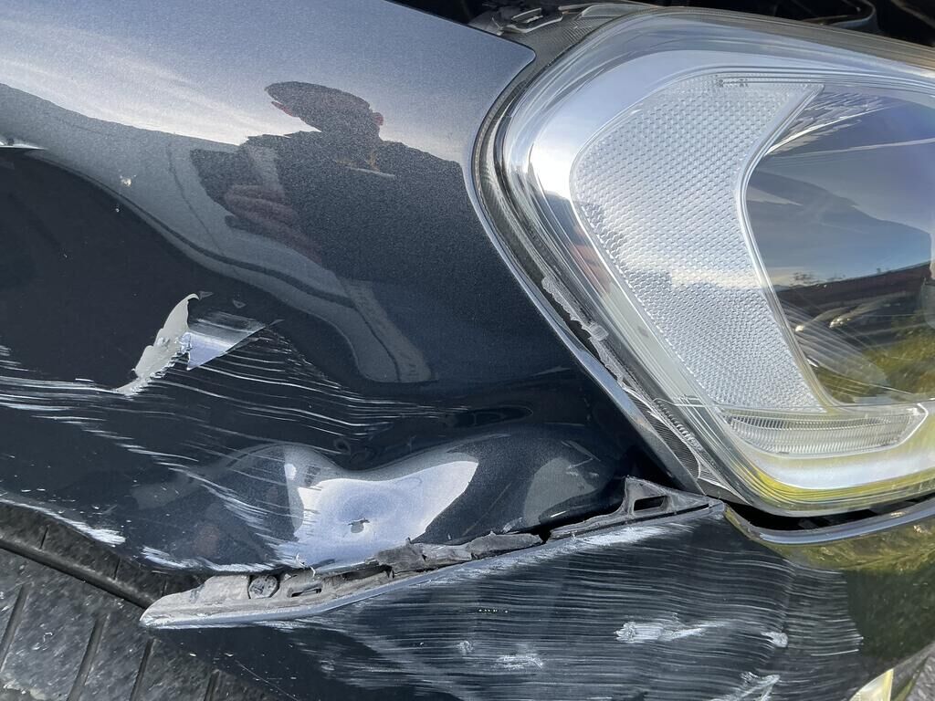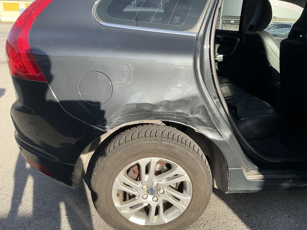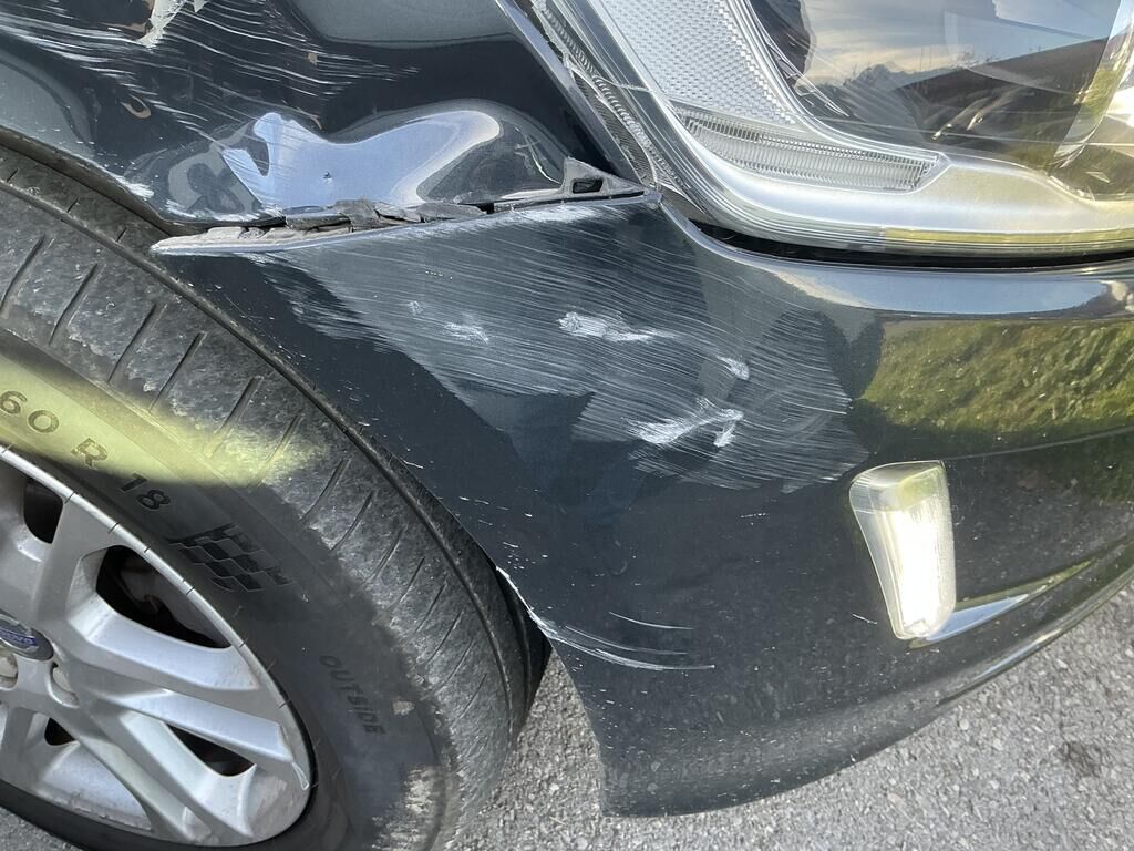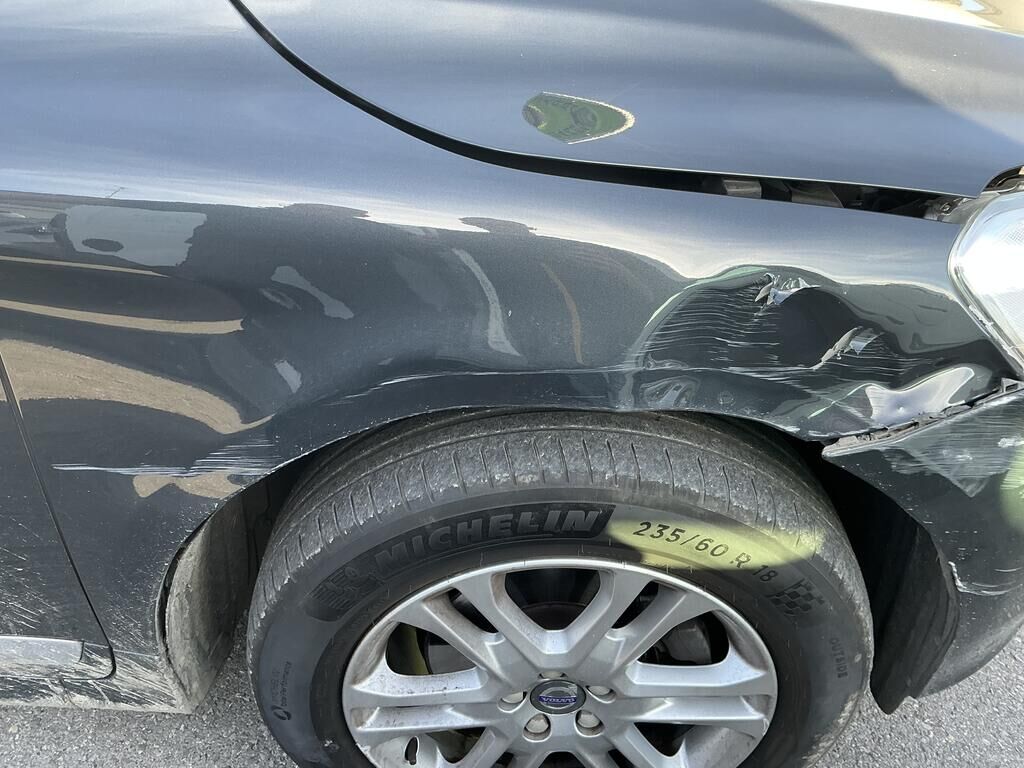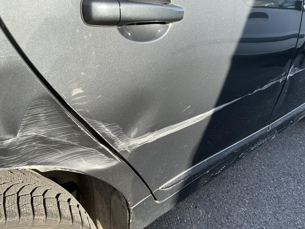 Collision du flanc droit: pare-chocs, ailes, phare, portes, poignées, jante et pneu endommagés.