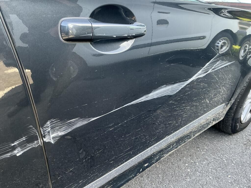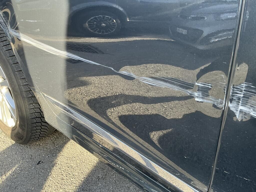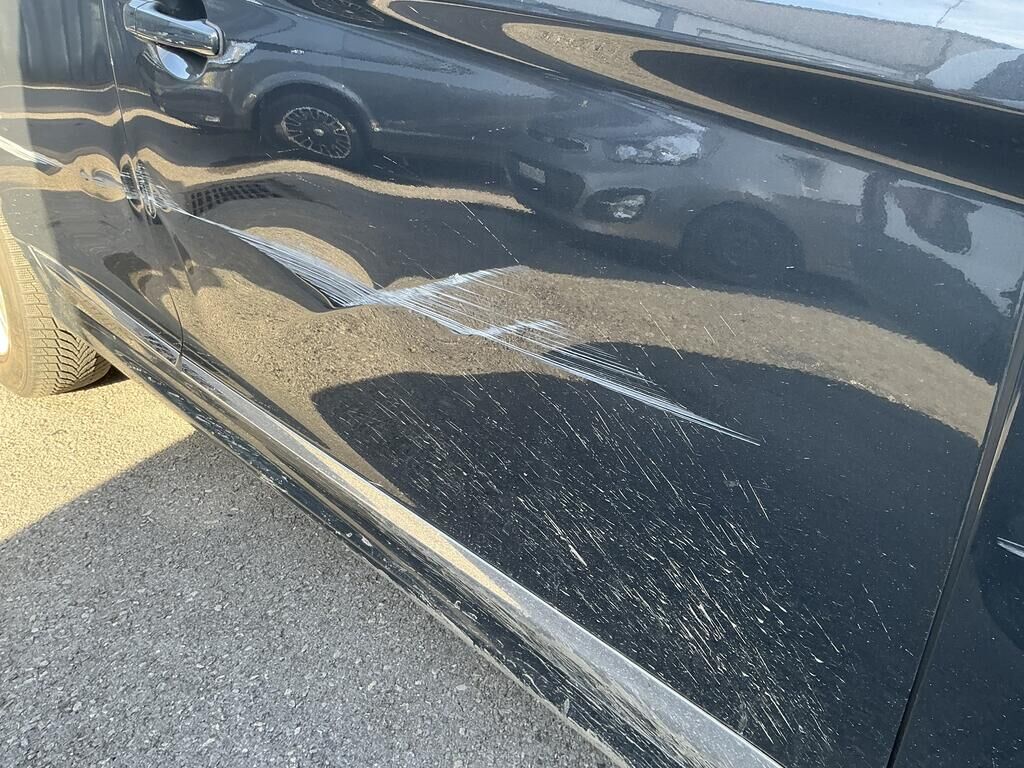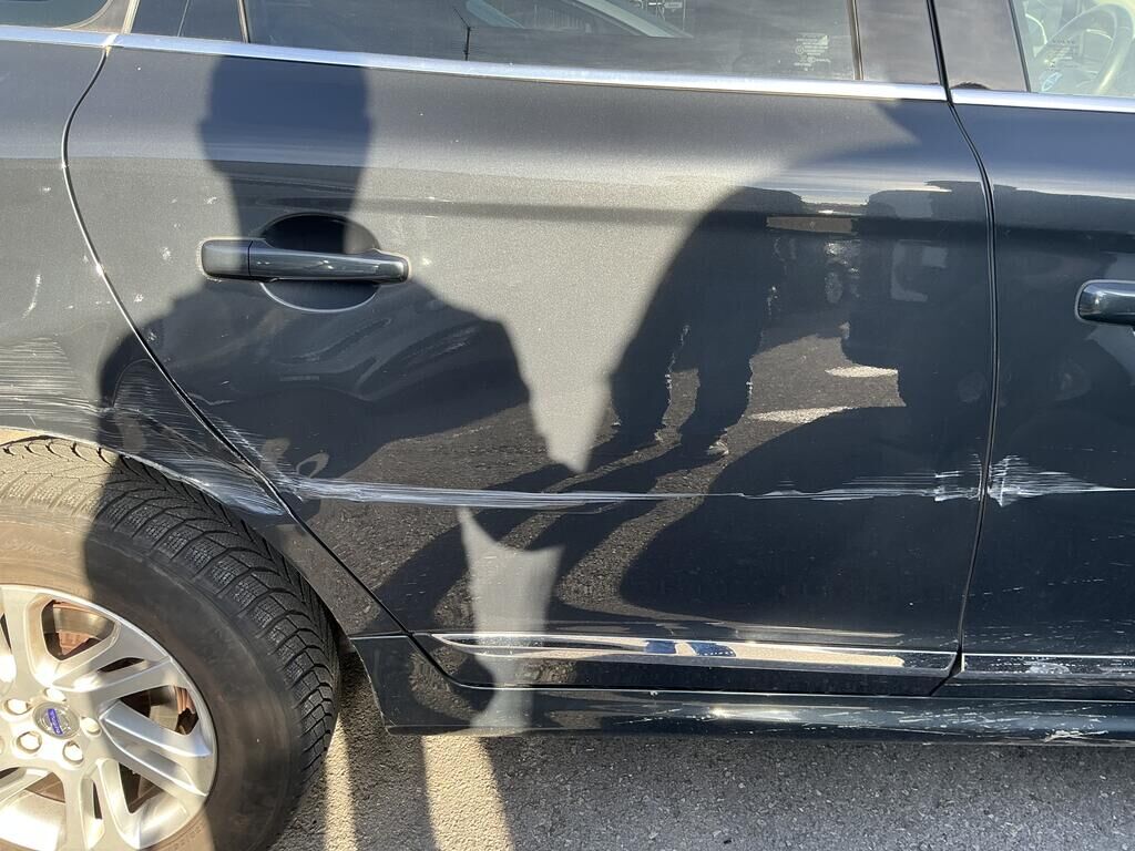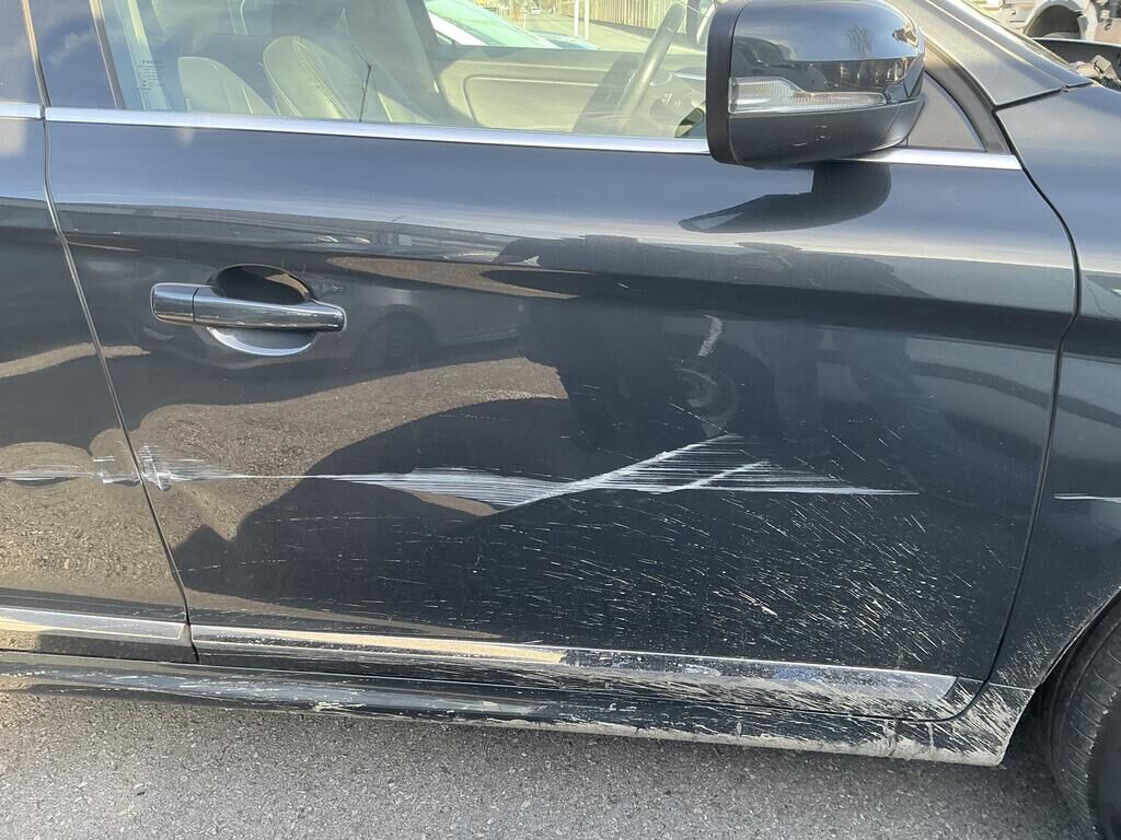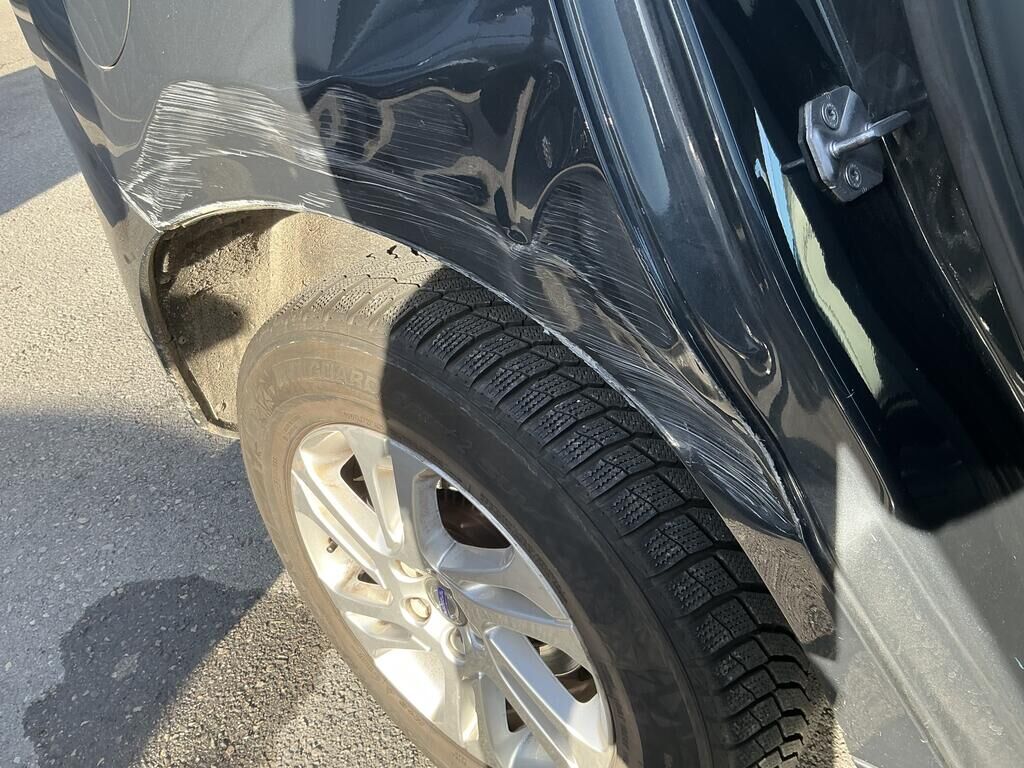 Collision du flanc droit: pare-chocs, ailes, phare, portes, poignées, jante et pneu endommagés.