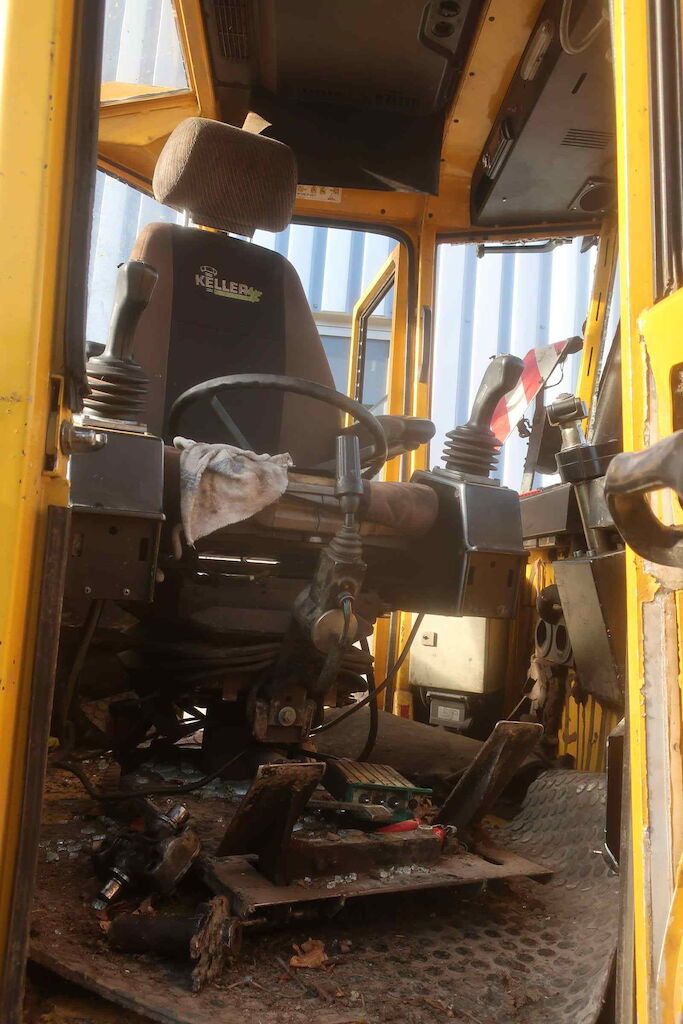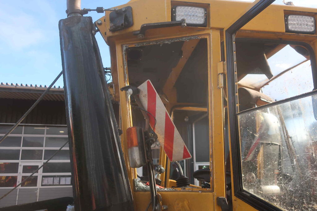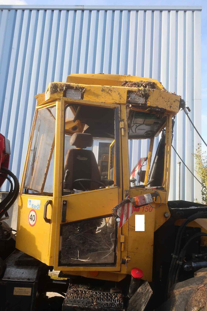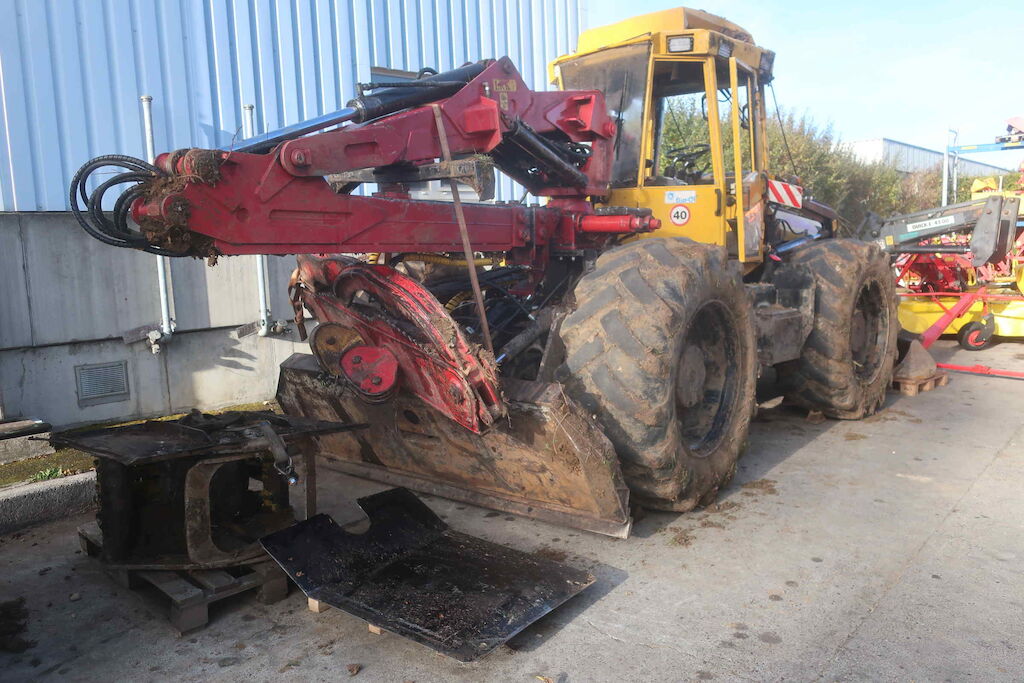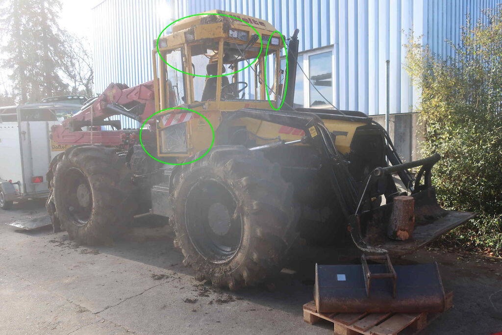 Cabine fortement endommagée, moteur bloqué, frontal plié, grue pliée, transmission bloquée.