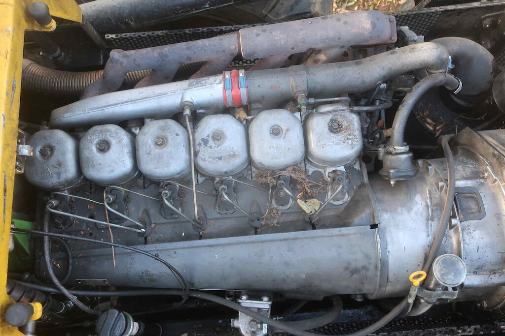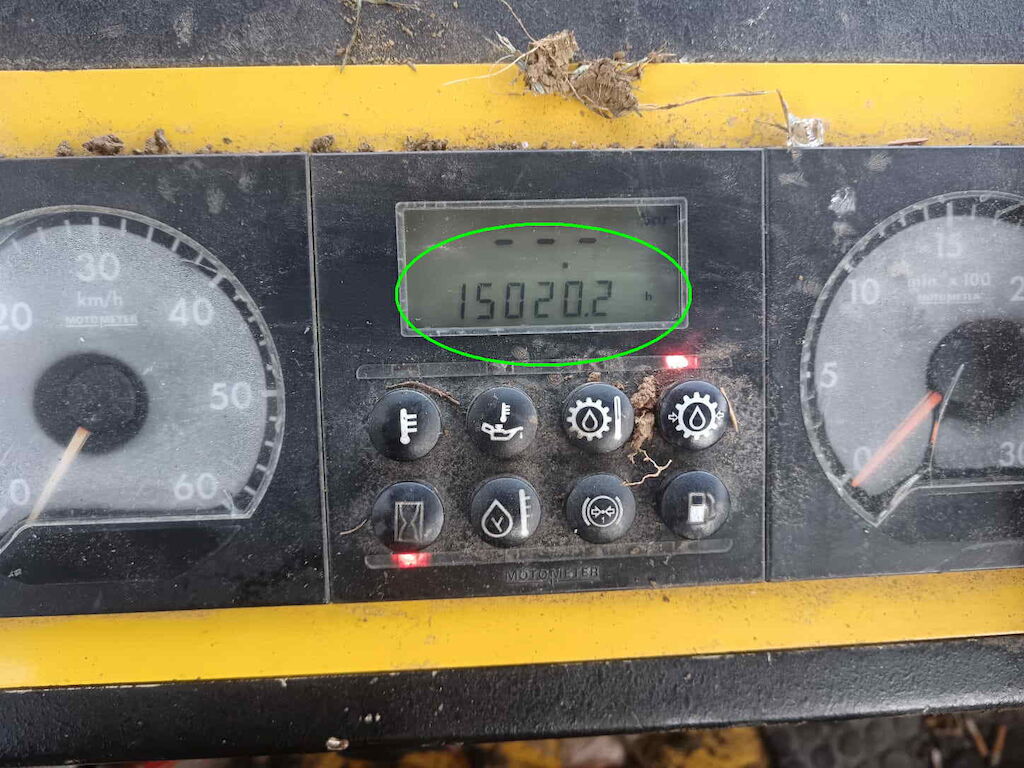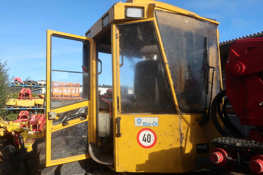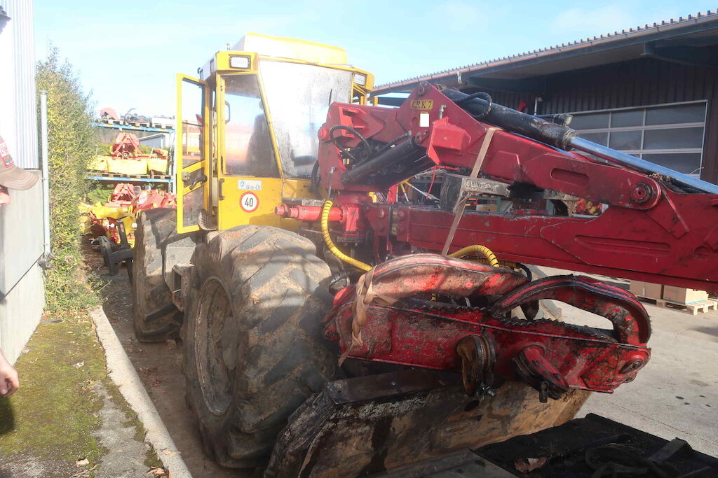 Cabine fortement endommagée, moteur bloqué, frontal plié, grue pliée, transmission bloquée.