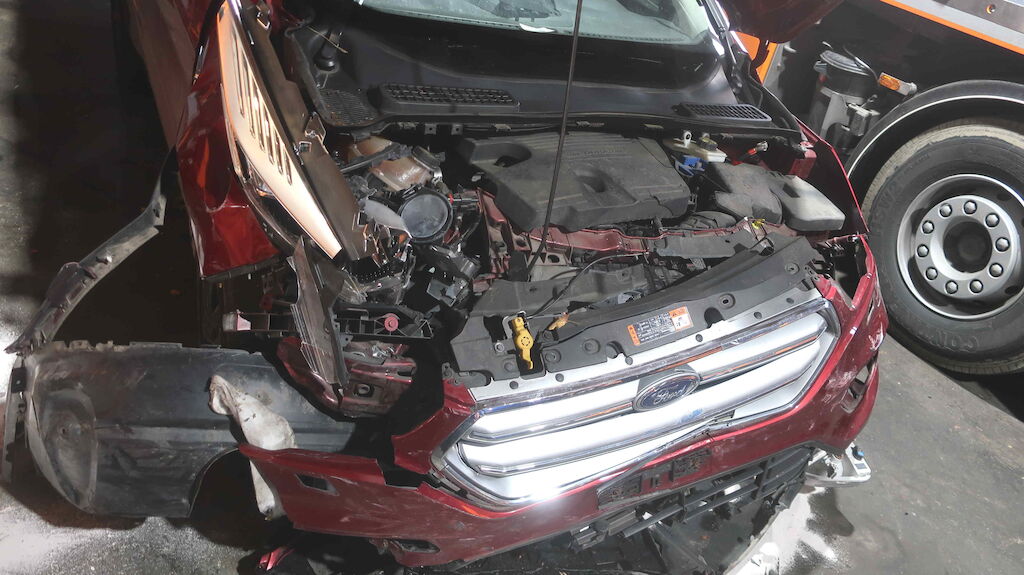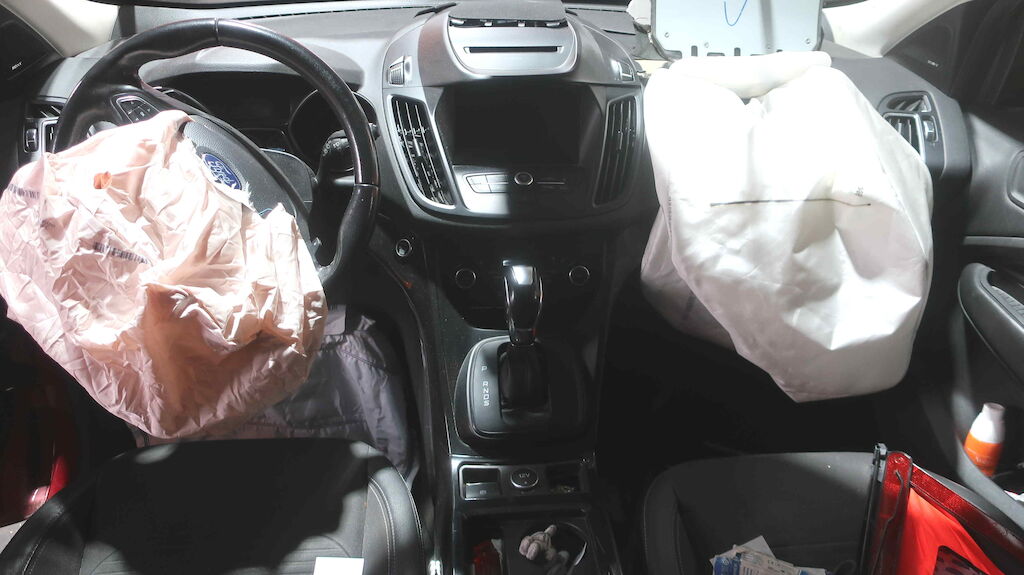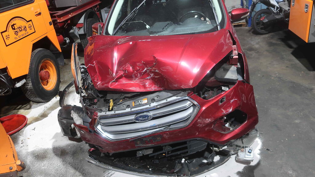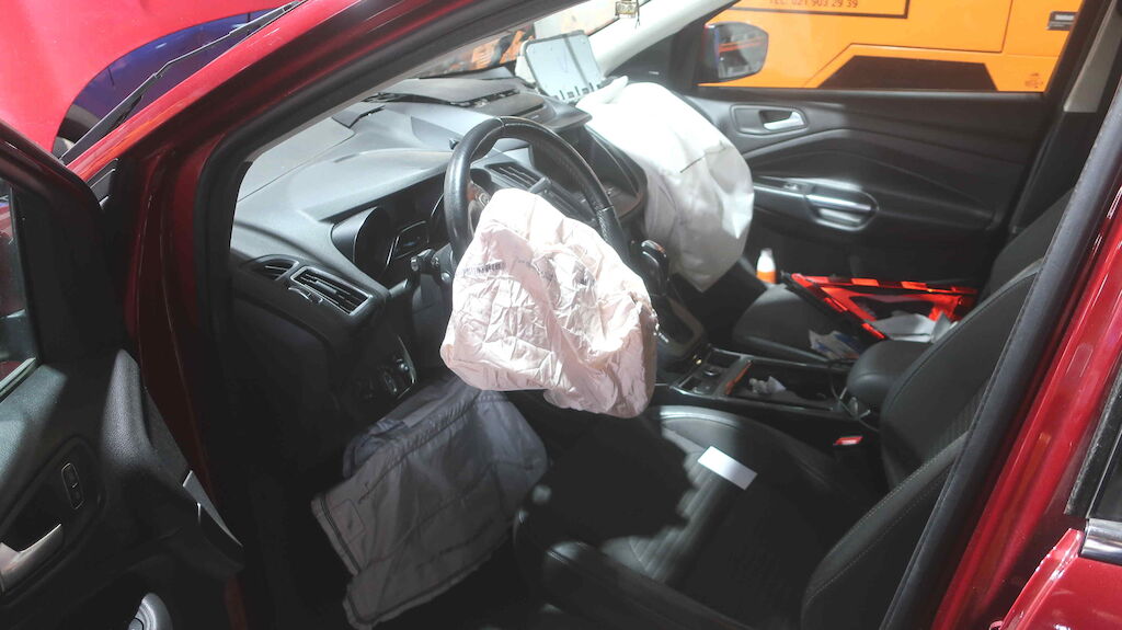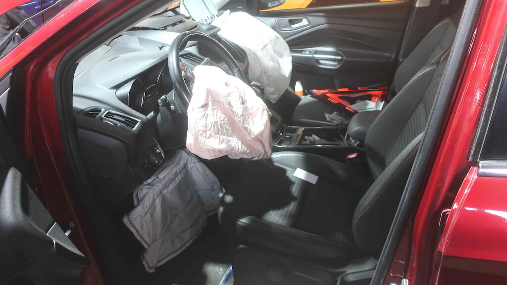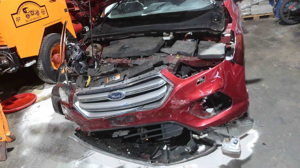 Violent choc avant avec déformation de cette partie de la voiture. Les airbags frontaux sont déployés.