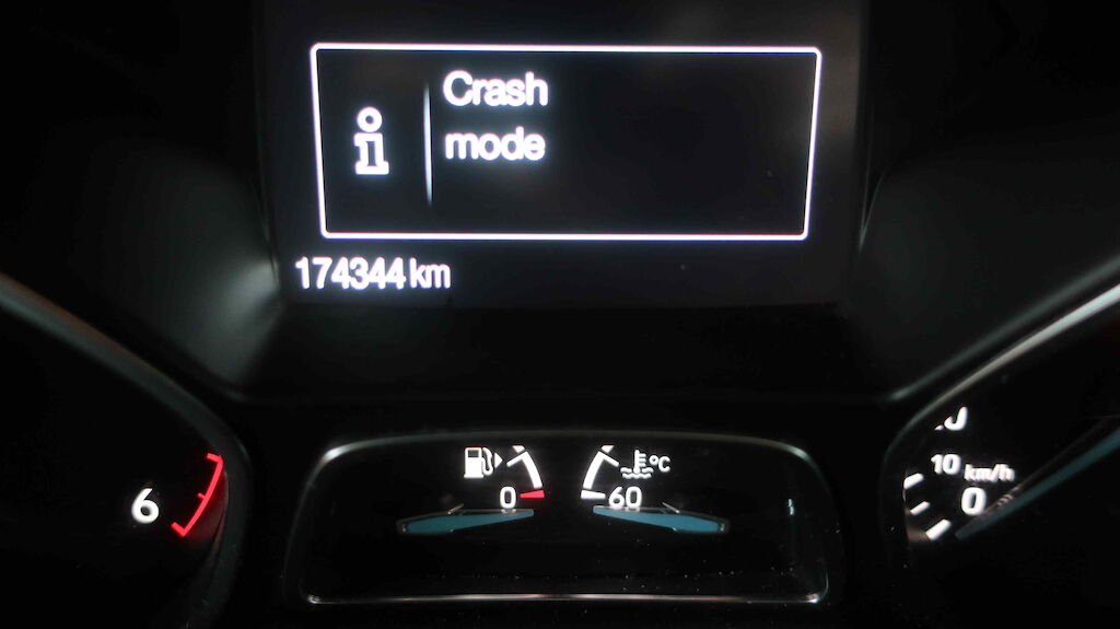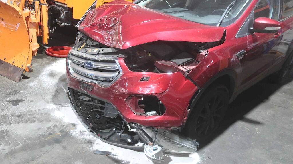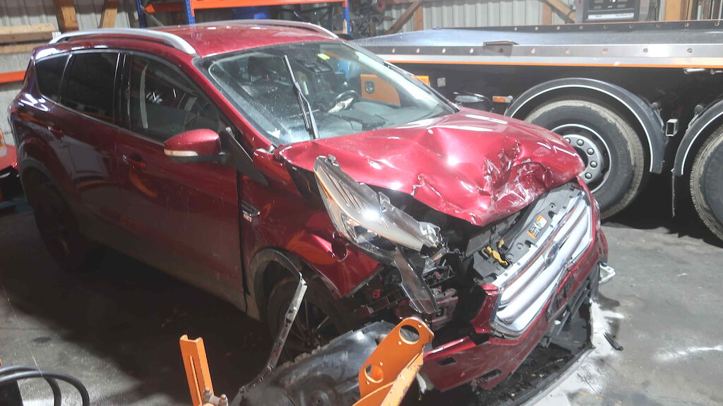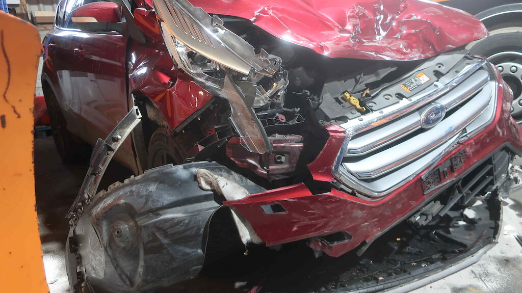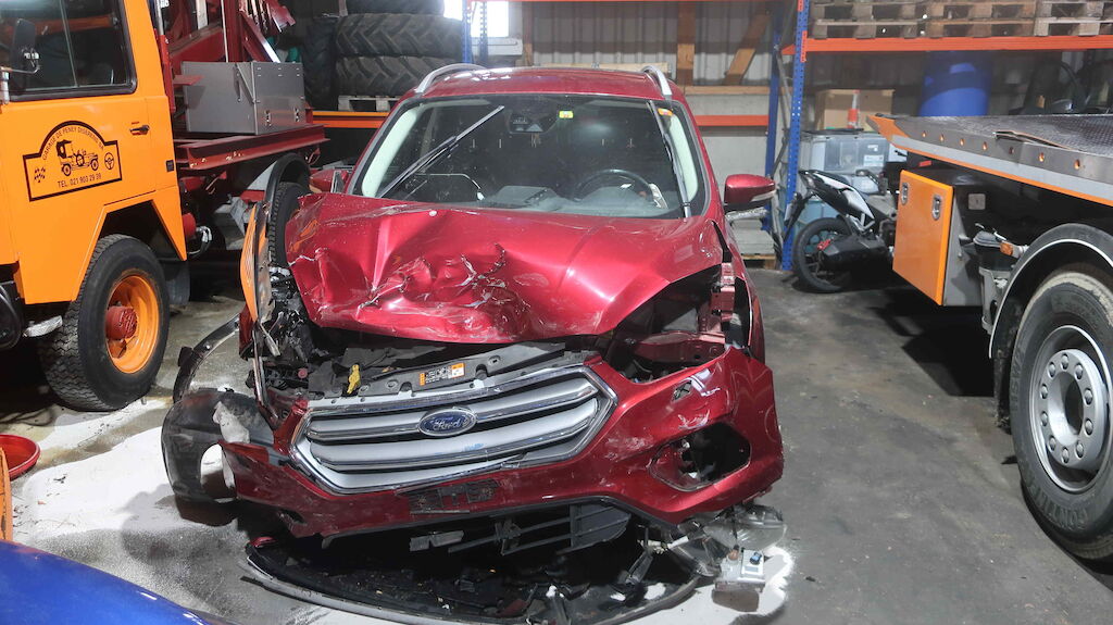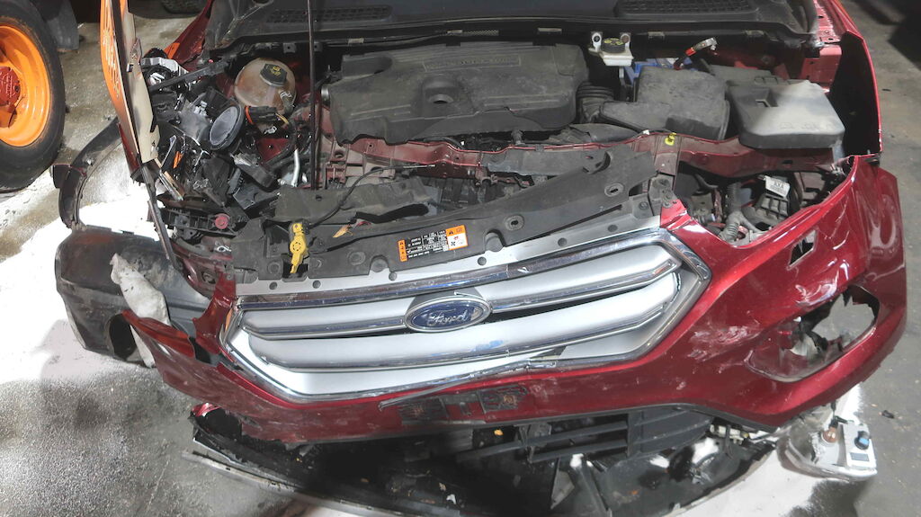 Violent choc avant avec déformation de cette partie de la voiture. Les airbags frontaux sont déployés.