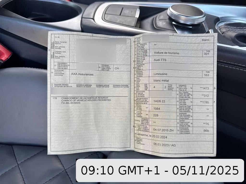 Adaptives Bremslicht, Rücksitzlehne geteilt abklappbar, Elektrische Fensterheber vorne, Sequentielles 6-Gang-Getriebe mit Automatikfunktion, Audi active lane assist, Aussenspiegel Aluminium Optik, Getönte Scheiben, Licht: LED Scheinwerfer, Fahrwerk: Sportfahrwerk, Mittelarmlehne vorne verschiebbar, Beide Make up-Spiegel beleuchtet, Elektronisches Stabilitäts-Programm (ESP), Licht: Drittes Bremslicht, Katalysator geregelt, Einstiegsschienen, Seitenairbag für Fahrer und Beifahrer, 3-Punkt-Sicherheitsgurte auf allen Plätzen, Scheinwerfer-Waschanlage, Sitze: Vordersitze heizbar, Garantie: 2 Jahre ohne Kilometerbegrenzung (ab 1. Inv.), Diebstahlwarnanlage mit Innenraum- überwachung und Abschleppschutz, Lenkrad: Progressivlenkung, Lichtsensor, Mittelarmlehne vorn in Kunstleder schwarz mit Kontrastnaht in Rot, Tempomat, Innenraumbeleuchtung, Innenspiegel automatisch abblendbar, S Sportsitze vorne mit elektr. Lendenwirbelstütze, Parkbremse, elektromechanisch, Multifunktions-Sportlenkrad in Leder, unten abgeflacht Tiptronic, mit Schaltwippen, Sicherheitslenksäule, Seitenaufprall-Schutzsystem, Licht: Nebelschlussleuchte, Alcantara-/Leder-Ausstattung, Räder: Reifendruck-Kontrollanzeige, Interieurelemente Quarzlack, Fussstütze und Pedalkappen in Edelstahl, Tankdeckel-Entriegelung von innen, Aussentemperaturanzeige, Wärmeschutzverglasung, ISOFIX Kindersitzvorrichtung, LED Blinker im Aussenspiegel, Allradantrieb permanent, Alu-Räder im 10-Y-Speichen-Design 18J, Antiblockiersystem (ABS), Klima: Klimatisierungsautomatik, Aussenspiegel rechts und links beheizt, elektrisch verstell- / und einklappbar, Licht: LED Heckleuchten, Dekoreinlagen in Aluminium, Aschenbecher und Zigarettenanzünder, Modellbezeichnungen (Logo & Model), Assist: Bremsassistent (BAS), Heckscheibenheizung, Teppichfussmatten vorne, Media: 8 Lautsprecher, Scheibenwischer vorne mit Intervall, Airbag: Airbag Fahrer und Beifahrer, Raucherpaket, Antriebsschlupfregelung (ASR), MMI Radio, Servolenkung geschwindigkeitsabhängig, Regensensor für Scheibenwischer vorne, Audi magnetic ride, Klima: Pollenfilter (Staubfilter), Frontscheibe mit Color-Band, Bordcomputer, Media: Digitaler Radioempfang (DAB), Stopp-/Start-System, Räder: Reifenreparatur-Set (Tire Fit), Heckspoiler, geschwindigkeitsabhängig elektrisch ausfahrbar, Audi drive select, Elektronische Differentialsperre (EDS), Wegfahrsperre elektronisch, Airbag: Airbag Beifahrer deaktivierbar