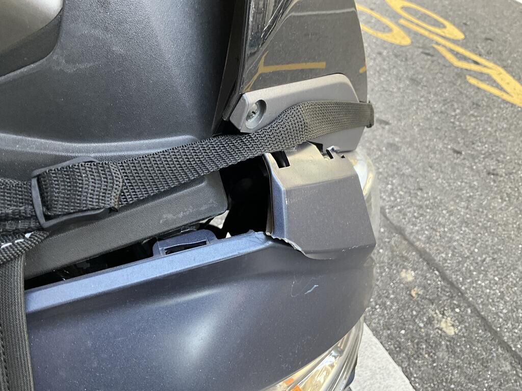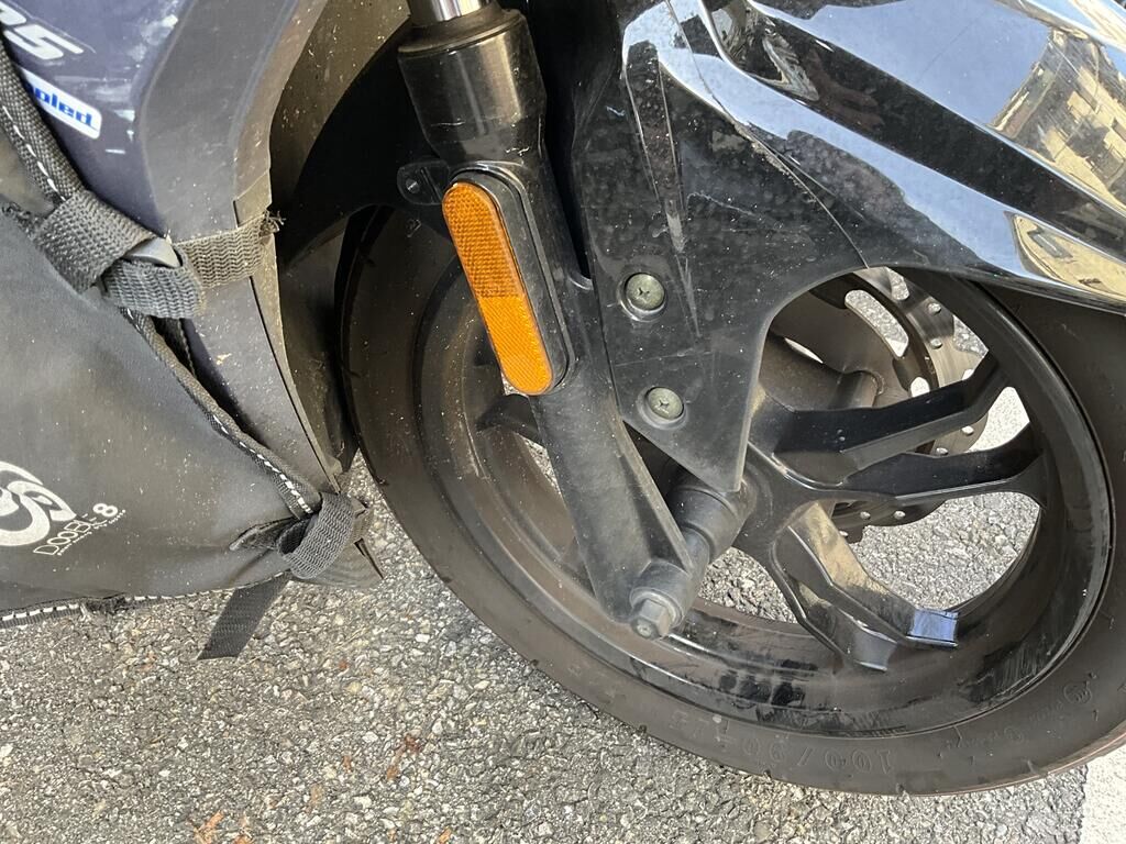 Fourche, té de fourche pliés (risque sur le cadre). Carénage AV et flanc DR, phare AV, levier DR, support de carénage, tôle d’échappement endommagés.