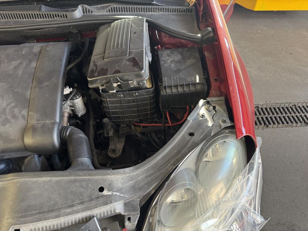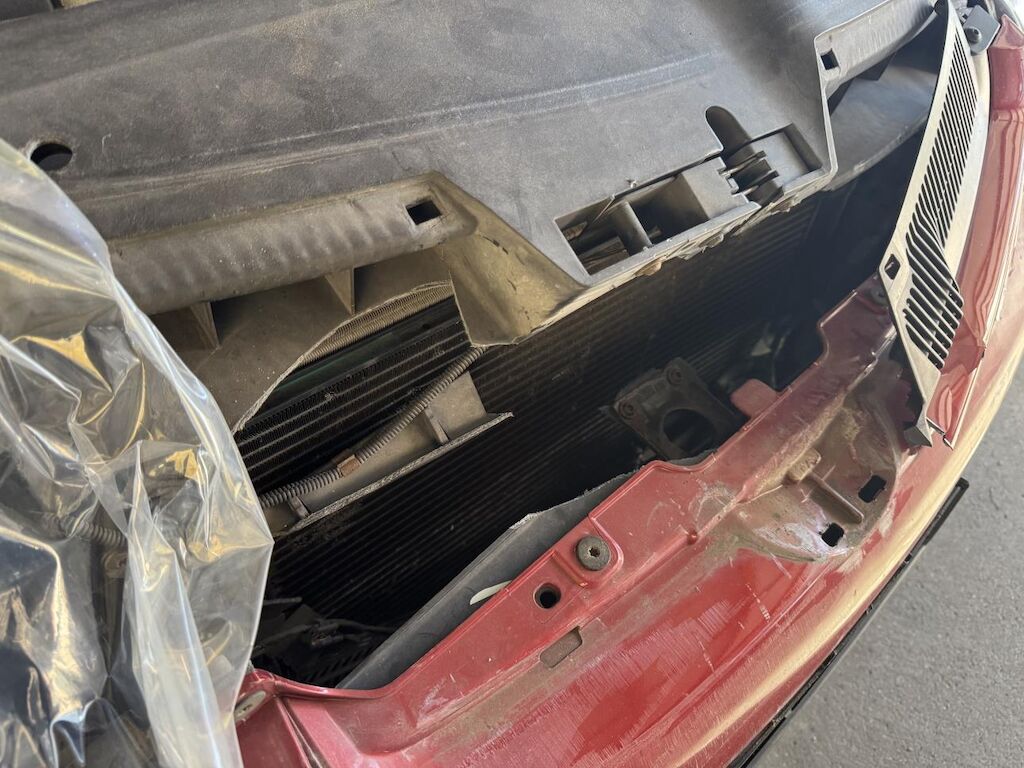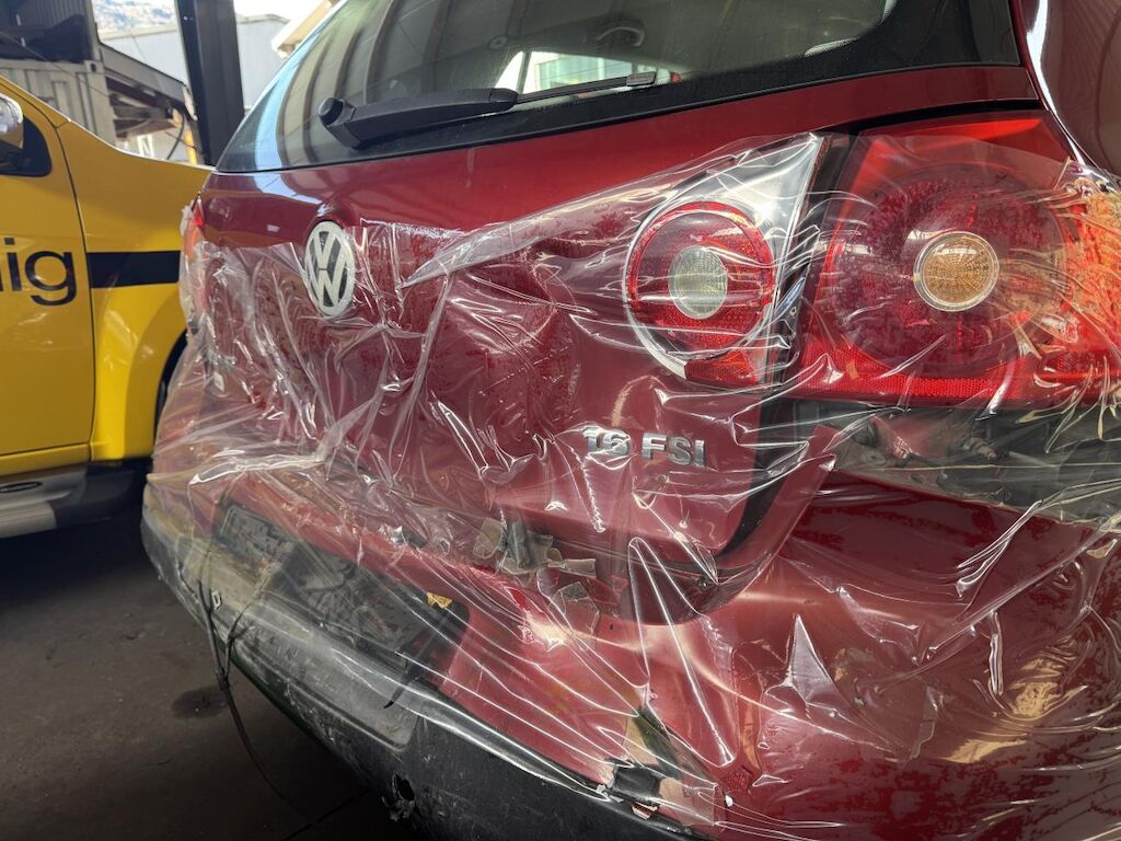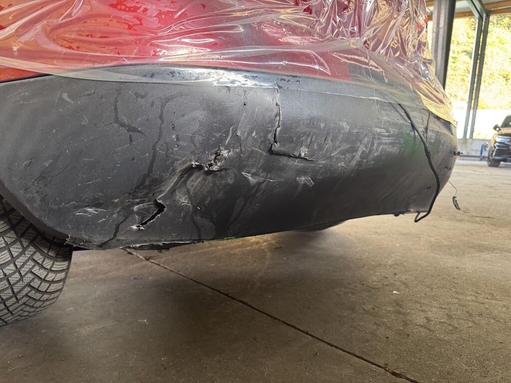 Dabei wurden die hintere Stossfängerabdeckung, die Heckklappe, der Pralldämpfer, das Heckblech, die Heckleuchten, die vordere Stossfängerabdeckung, der Kühlergrill, die Motorhaube, beide Scheinwerfer, der Schlossträger, beide Kotflügel, alle Kühler sowie diverse weitere Anbauteile in den Anprallzonen beschädigt.