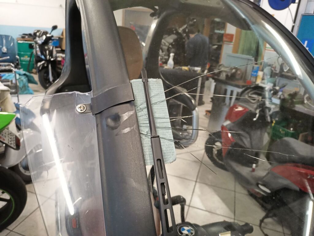 Impact à l’avant droit du scooter avec dommages au pare-brise, rétroviseur et divers composants.