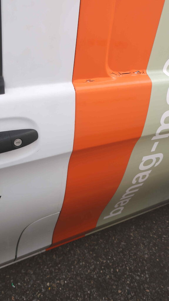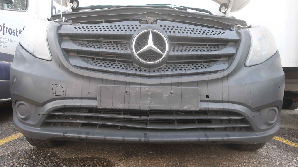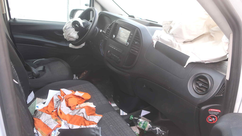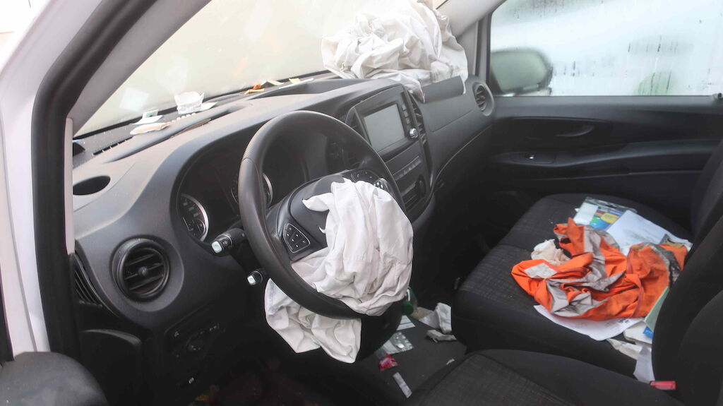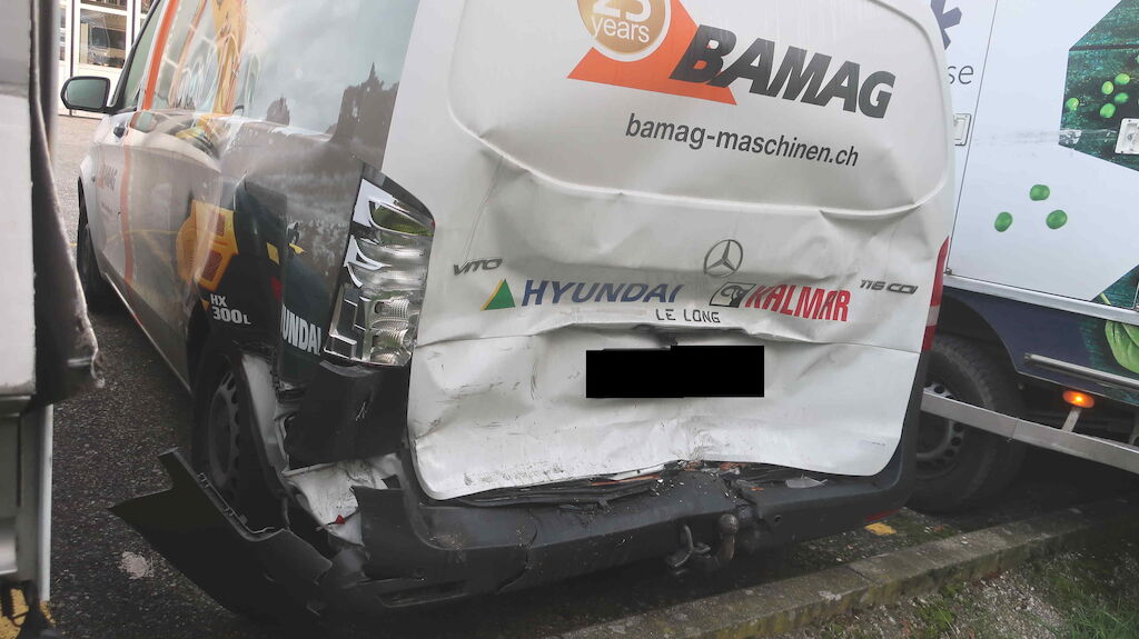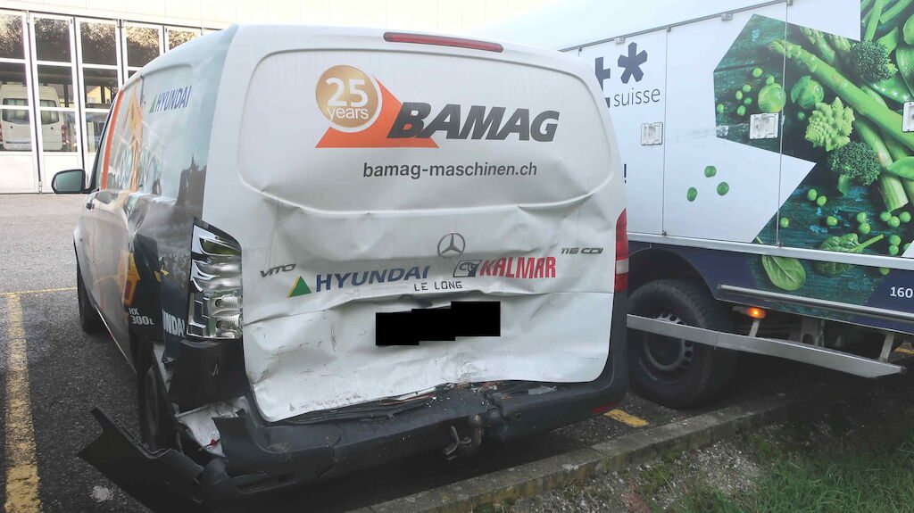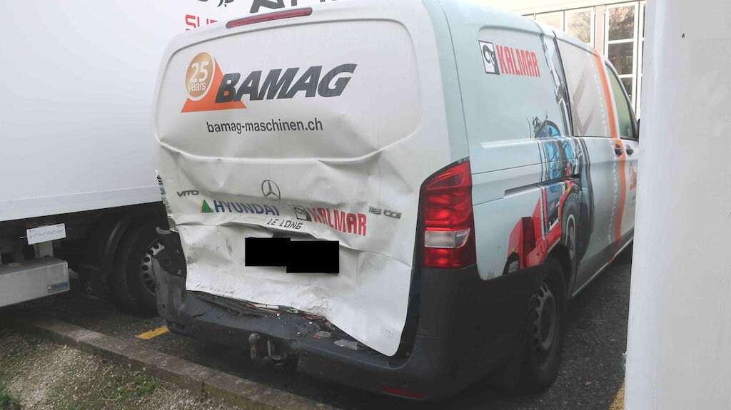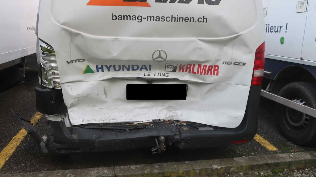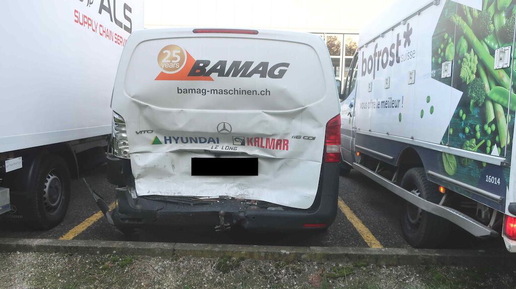 Violent choc arrière avec déformation du hayon du pare-chocs et du panneau latéral gauche. La partie avant est également endommagée et les airbags frontaux sont déployés.