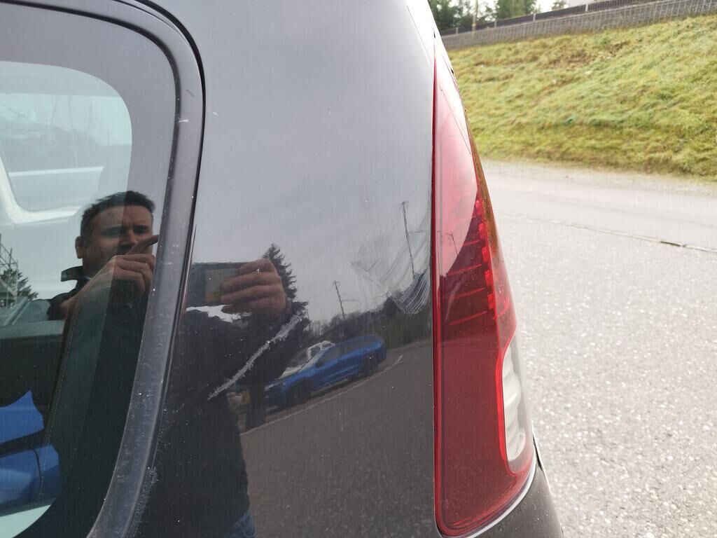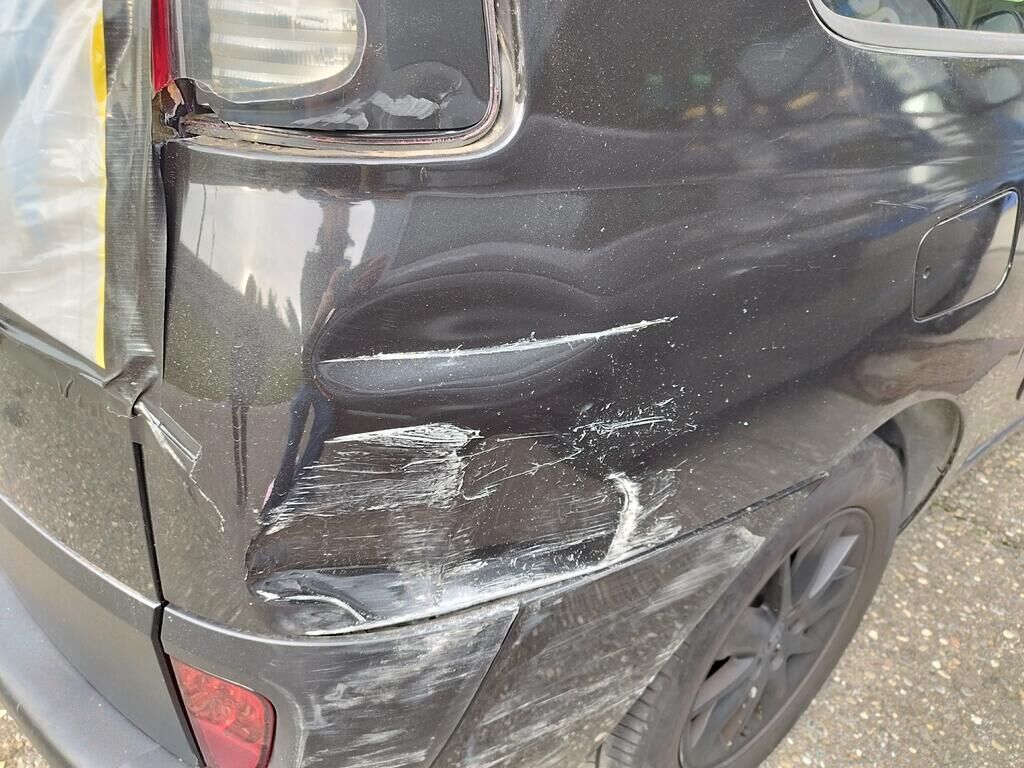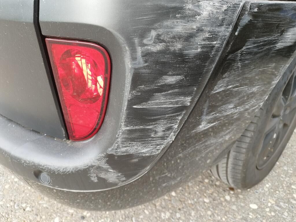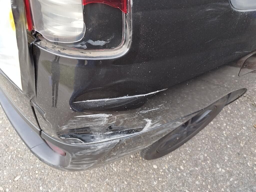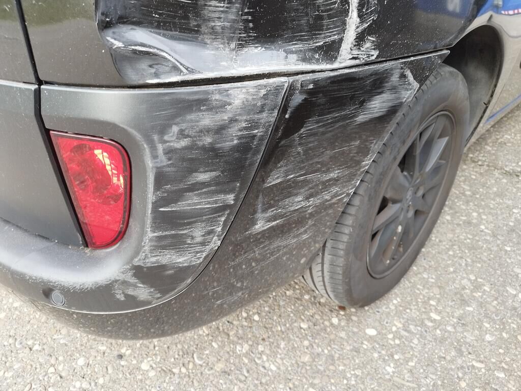 Die Stossstange hinten rechts hat Kratzspuren, die Seitenwand hinten rechts hat Kratzspuren und ist deformiert, die Heckleuchte rechts ist gerissen, die Heckscheibe ist zersplittert, die Heckklappe ist gerissen.