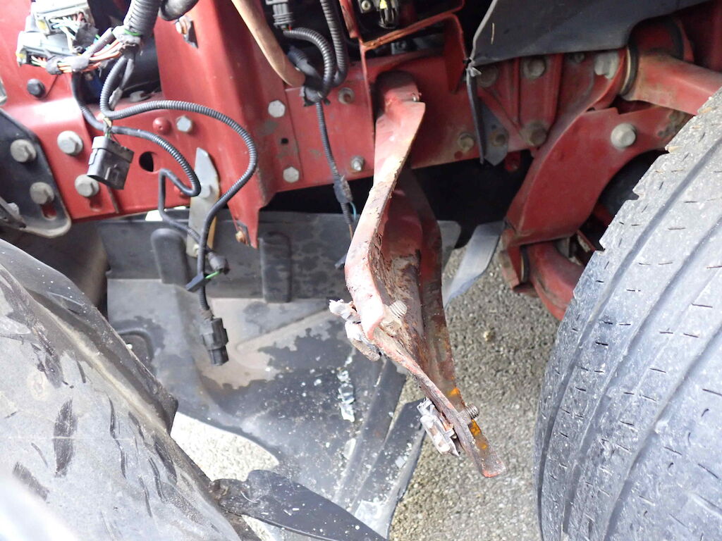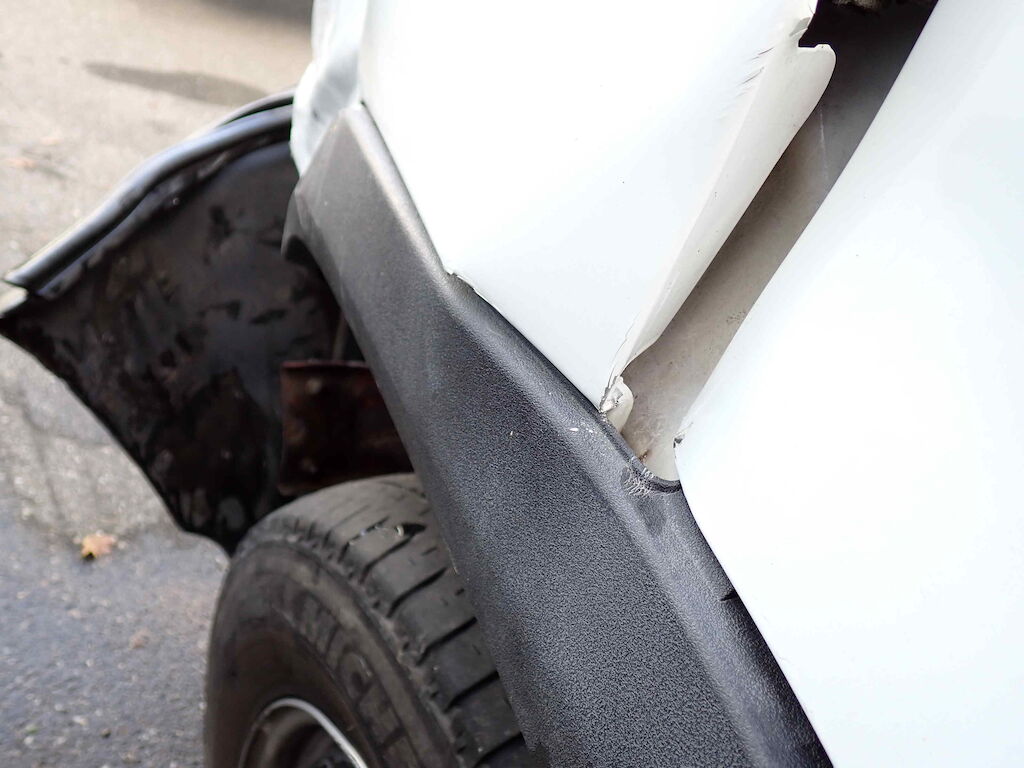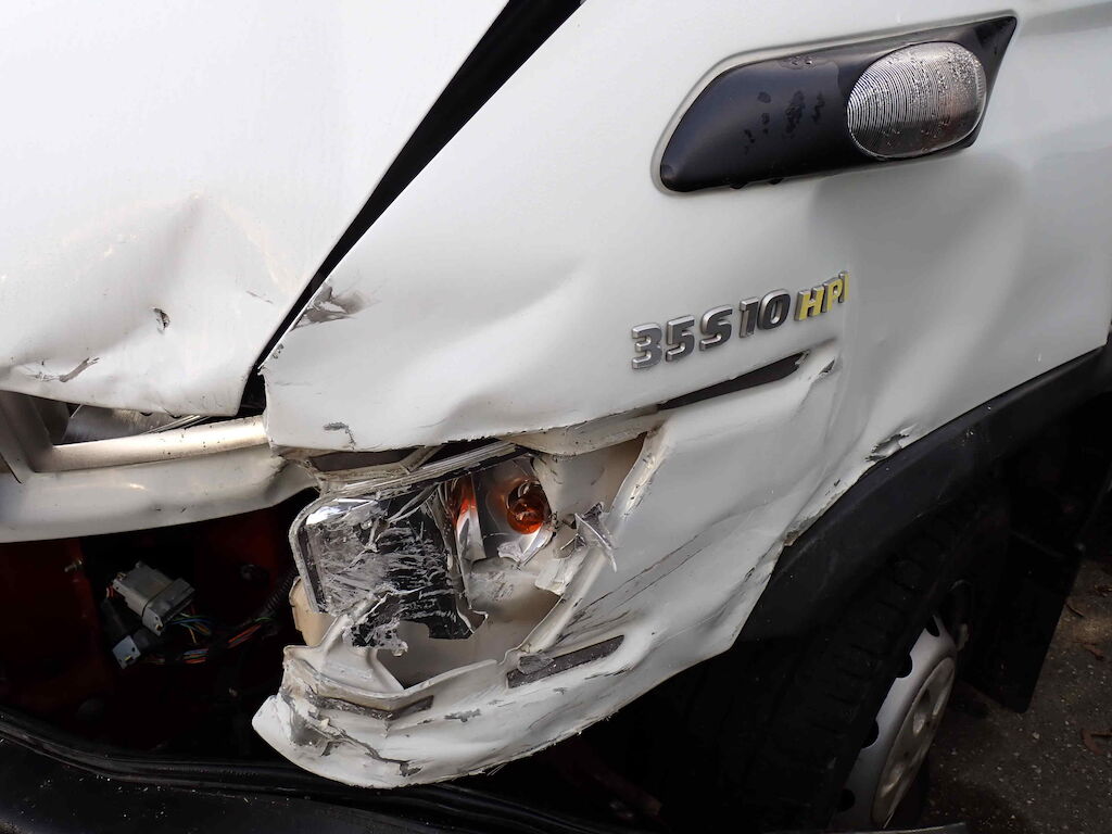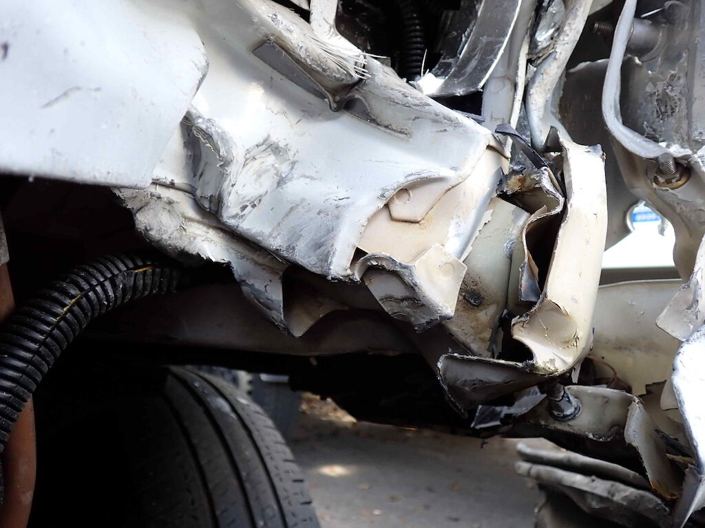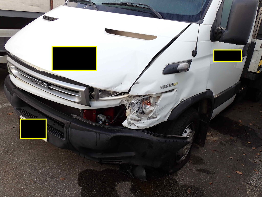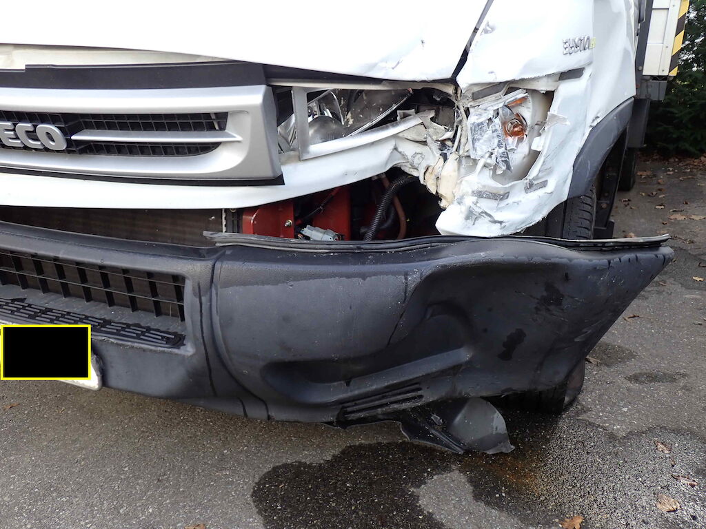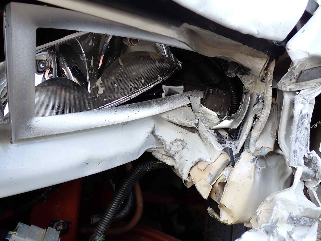 Motorhaube, Stossfänger vorne, Kotflügel vorne links, Holm oben links, Türe links Scheinwerfer links und Träger eingedrückt; Reifen vorne links platt