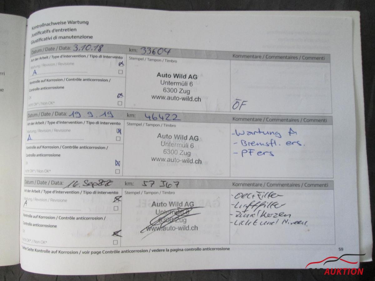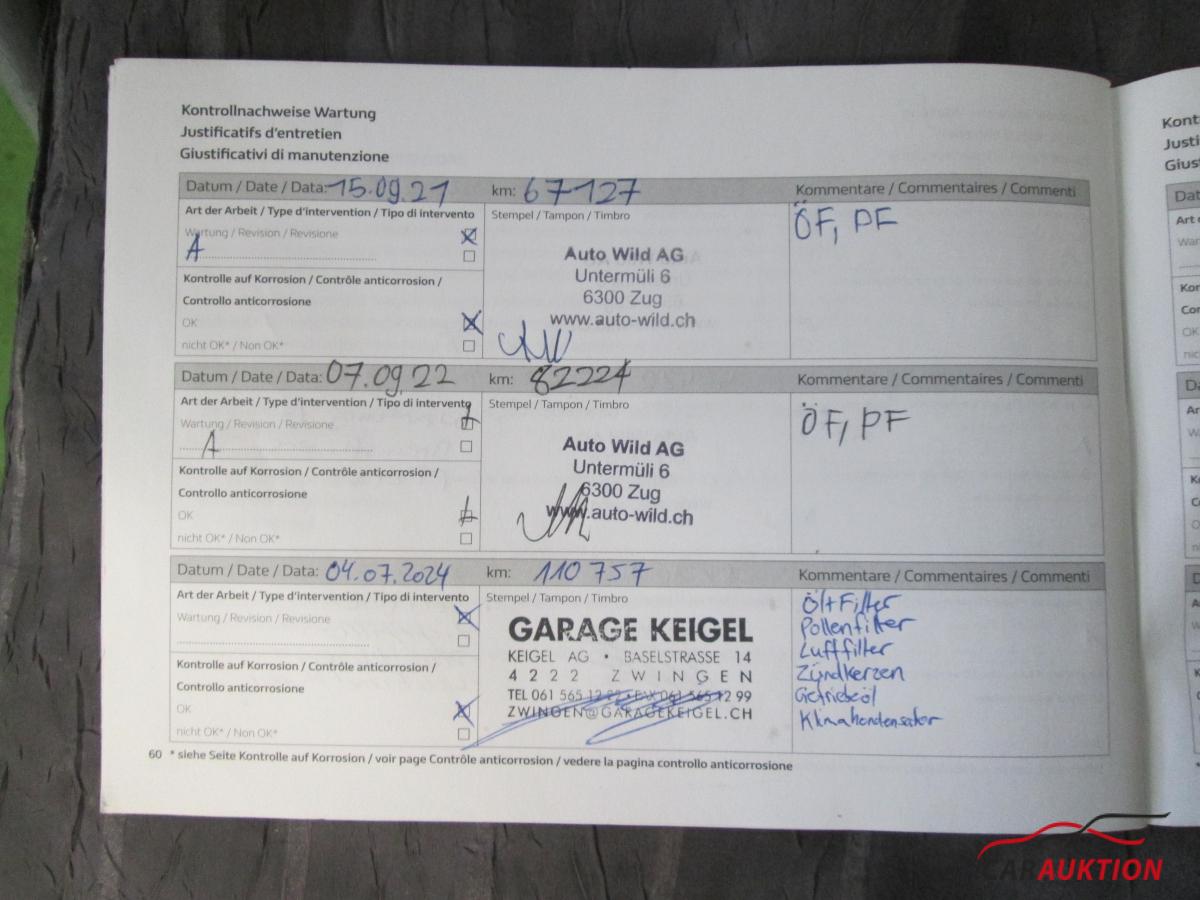 SD Karte (Europa), Panorama-Glasschiebedach, elektrisch, Adaptives Fahrlicht, Räder: Reifenreparatur-Set (Tire Fit), Abgedunkelte Seiten- und Heckscheibe, Spurhaltewarnung (Lane Departure Warning), Assist: Abstandswarner, Assist: Rückfahrkamera, Start-/Stop-Knopf, Gurtstraffer mit Gurtkraftbegrenzer, Antriebsschlupfregelung (ASR), Elektronisches Stabilitäts-Programm (ESP), Bordcomputer, Licht: Nebelschlussleuchte, Zentralverriegelung mit Fernbedienung und automatischer Türverriegelung, Navigationssystem, Kreuzstütze für Fahrersitz verstellbar, Elektrische Fensterheber vorne + hinten, Digitaler Radioempfang (DAB/DAB+), Pollenfilter (Staubfilter), Lenkrad längs- und höhenverstellbar, Berganfahrassistent, Warnblinkautomatik bei Vollbremsung, Ambientes Licht, Supervision Cluster, Sonnenschutzrollos für Türscheiben hinten, Panorama-Glasdach, 8 Lautsprecher, Teppichfussmatten vorne und hinten, Soundsystem, Tagfahrlicht, Getriebe: EDC automatisiertes Doppelkupplungsgetriebe 7-Gang, Tempomat mit Geschwindigkeitsbegrenzer, Window-Kopfairbags, Grip Control, Türgriffe aussen in Wagenfarbe, Multimediasystem mit Touchscreen, Rücksitzlehne abklappbar, Reflektierende Frontscheibe, Vordersitze manuell verstellbar, Licht- und Regensensor, LED Scheinwerfer, ABS, EBD elektronische Bremskraftverteilung, Parkassistent, Airbag Beifahrer deaktivierbar, Sonnenblenden mit beleuchtetem Schminkspiegel, Innenrückspiegel automatisch abblendend, Wegfahrsperre elektronisch, Leseleuchten hinten, Lenkrad und Schalthebelgriff in Leder, 4 Leichtmetallfelgen 19J mit Pneu, Airbag: Airbag Fahrer und Beifahrer, Park Distance Control vorne und hinten, Gurtkontrolle, Katalysator geregelt, Eco-Modus, Seitliche Einparkhilfe, Bremsassistent (BAS), Notbremsassistent, 2-Zonen-Klimaautomatik, Mittelkonsole, Automatische Parkbremse, Assist: Toter Winkel-Assistent, Licht: Drittes Bremslicht, Vordersitze heizbar, Keyless Drive Hands-free, Luftausströmer hinten, Leseleuchten vorne, ISOFIX-Kindersitzverankerungen hinten (2), Fahrersitz elektrisch verstellbar, Stoff-/Kunstleder-Ausstattung, Heckscheiben-Wisch-/Waschanlage, Handschuhfach gekühlt, Kopfstützen vorne höhenverstellbar, Bluetooth Freisprecheinrichtung, Servolenkung, Heckscheibenheizung, Verkehrsschild-Erkennungssystem, Elektrische Kindersicherung, Seitenairbags, Scheibenwischer vorne mit Intervall, 3-Punkt-Sicherheitsgurte auf allen Plätzen