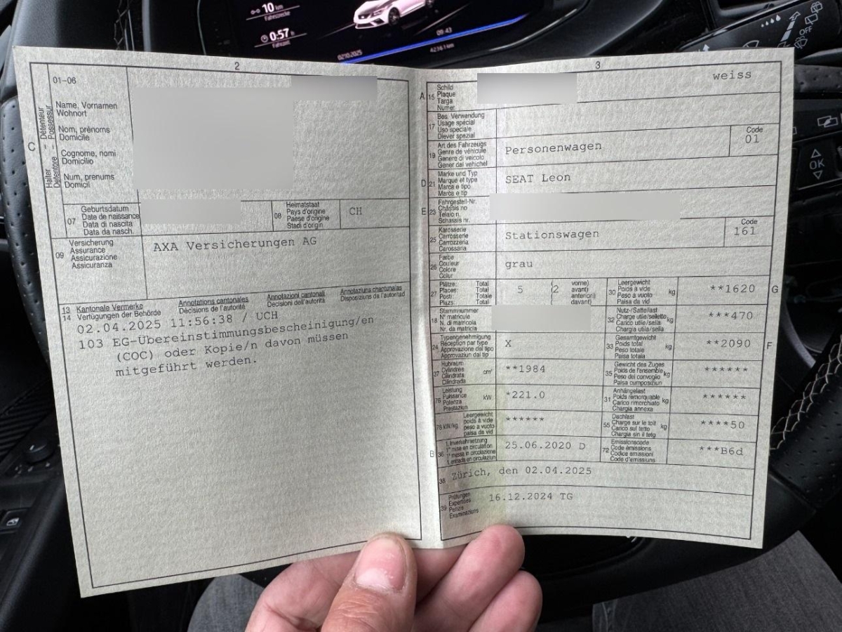 Paket: Fahrerassistenzpaket 4 (Assist: Stauassistent, Assist: Verkehrszeichenerkennung, Notbremsassistent, Assist: Spurhalteassistent Lane Assist, Assist: Emergency Assist, Licht: Fernlicht-Assistent), Media: SEAT Connectivity Box, Media: Kartenmaterial ”Europa” Mapcare, Lackierung: Metallic-Lackierung, Sicherheitstrennnetz oder /-gitter im Gepäckraum, Media: BeatsAudio Sound System, Media: SEAT FullLink, Schalensitze in Alcantara, Schlüsselloses Schliess- und Startsystem (KESSY), Assist: Rückfahrkamera, Assist: Einparkhilfe vorne und hinten mit optischer Anzeige, SEAT Garantie: Garantie 2 Jahre ohne Kilometerbegrenzung (ab 1. Inv.), Media: Navigationssystem PLUS, Lackierung: Uni-Lackierung, SEAT Garantie: Garantie 3. und 4 Jahre oder 80’000 km (ab 1. Inv.)