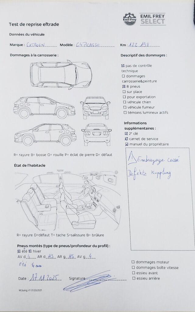 Pas de contrôle technique (essai en atelier) effectué, Embrayage cassé,