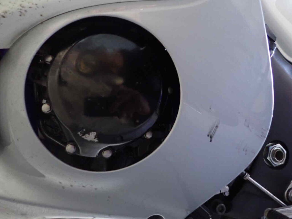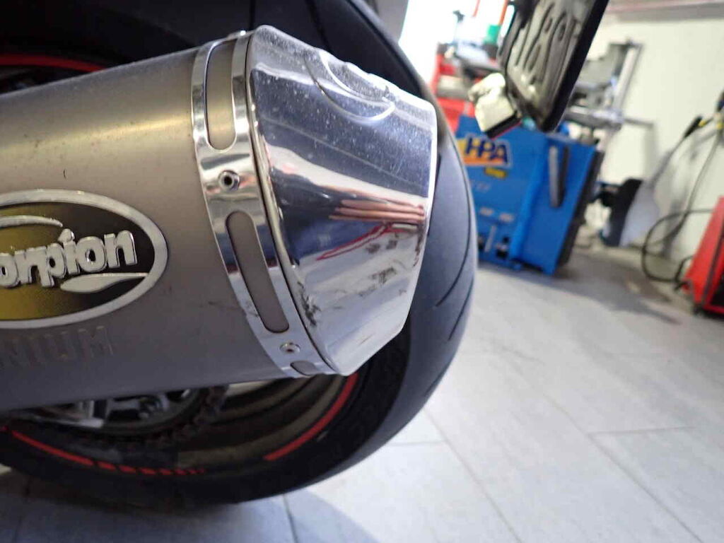 Le rétroviseur, le réservoir et le carénage avec des marque sur le silencieux d’échappement.