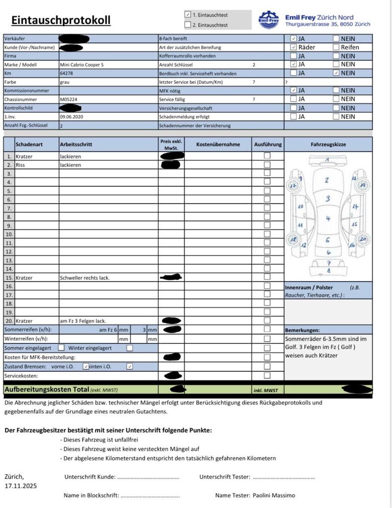| Keine technische Prüfung (Werkstatttest) vorgenommen Diverse Schäden an Karosserie/Lack. Fahrzeug ab Platz, ohne Garantie und Aufbereitung. Keine Gewähr auf die Angaben der Sonder- und Serienausstattung / keine mechanische Prüfung. Fahrzeug wurde unzerlegt expertisiert / keine Haftung für allfällige, nach Demontage bekanntwerdenden Mängel. Fahrzeugbereifung und Ausstattung gemäss Fotos / Fahrzeugkauf auf eigenes Risiko ab Platz ohne Nachwährschaft. – Div. Kratzer und Dellen am gesamten Fahrzeug. – Div. Kratzer an drei Felgen. – Digitaler Service vorhanden |