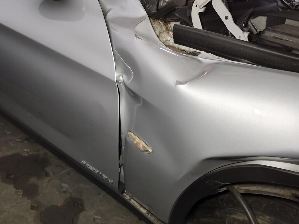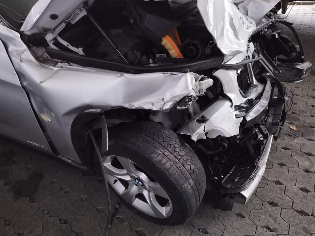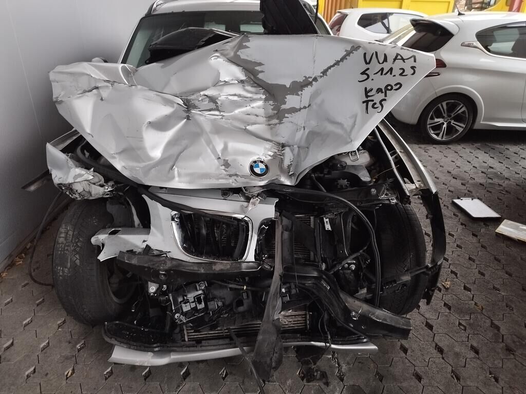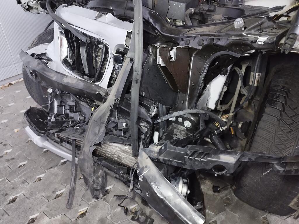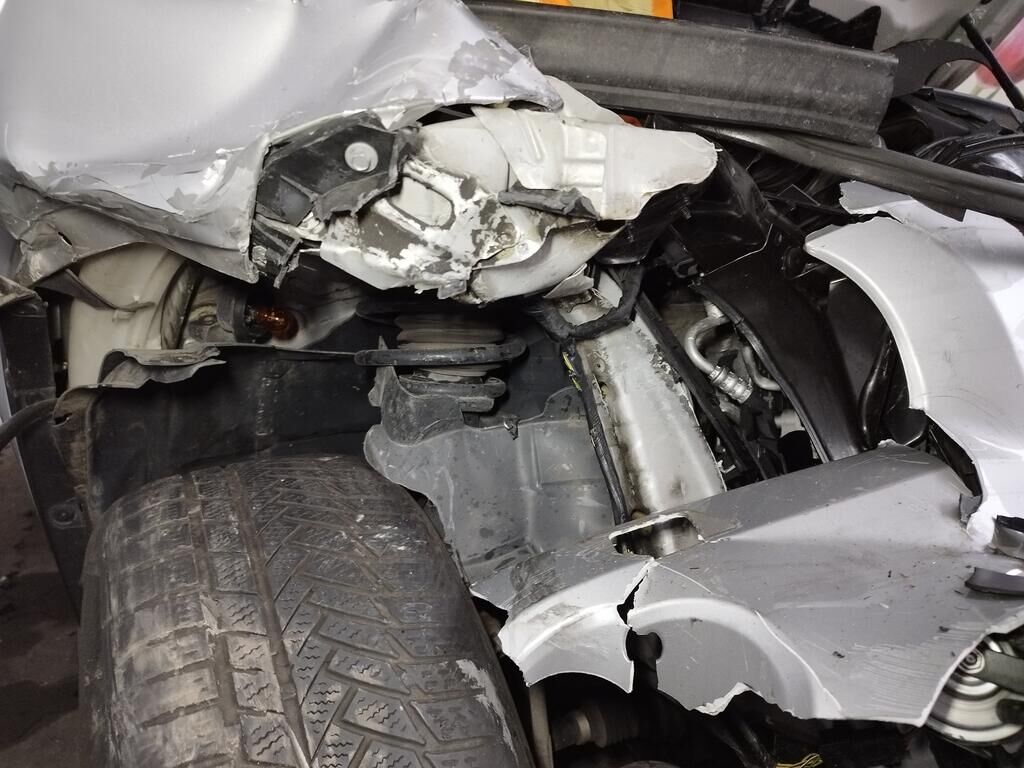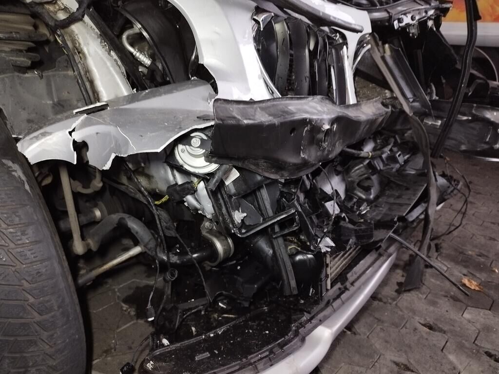 Die ganze Front ist bis zum Motor deformiert, alle Kühler sind deformiert, diverse Teile vom Motor sind deformiert, das Rad vorne rechts steht weiter hinten, der Fahrer sowie Beifahrerairbag sind ausgelöst, die Frontscheibe ist gerissen.