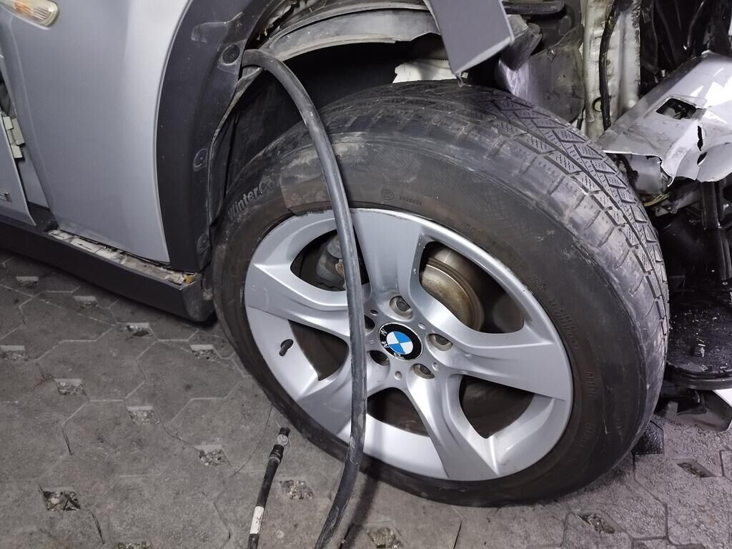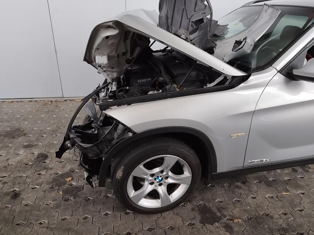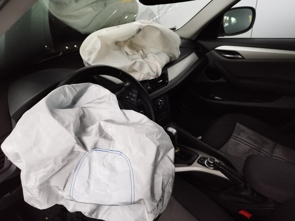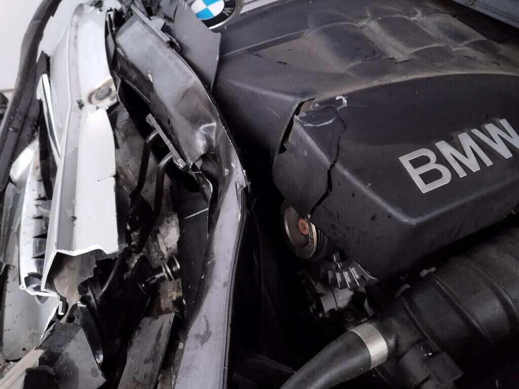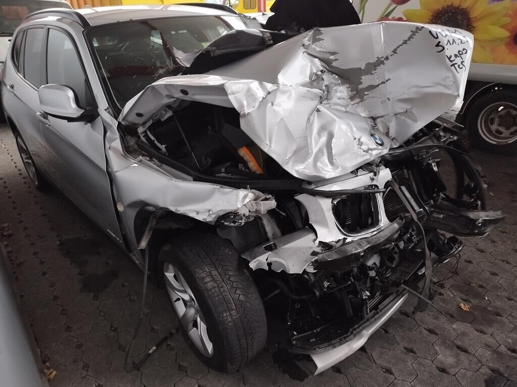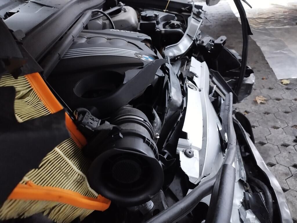 Die ganze Front ist bis zum Motor deformiert, alle Kühler sind deformiert, diverse Teile vom Motor sind deformiert, das Rad vorne rechts steht weiter hinten, der Fahrer sowie Beifahrerairbag sind ausgelöst, die Frontscheibe ist gerissen.