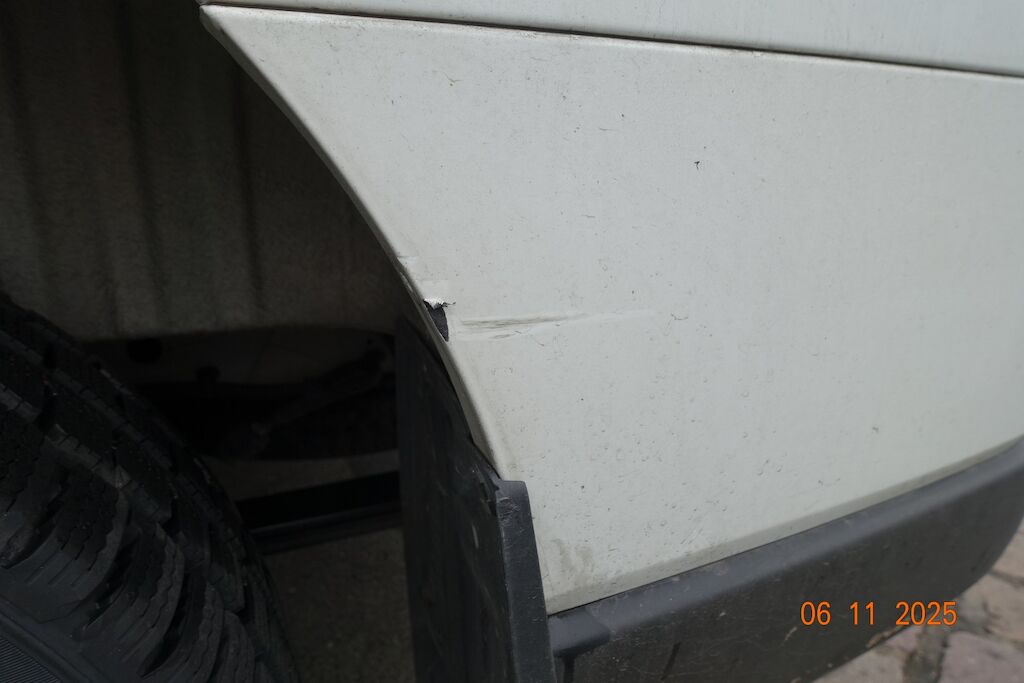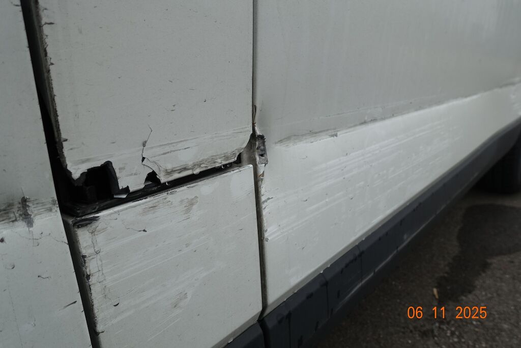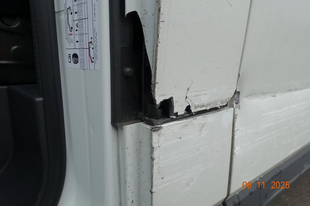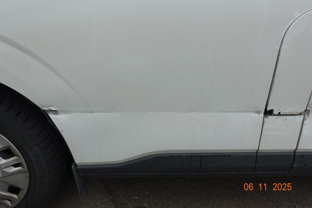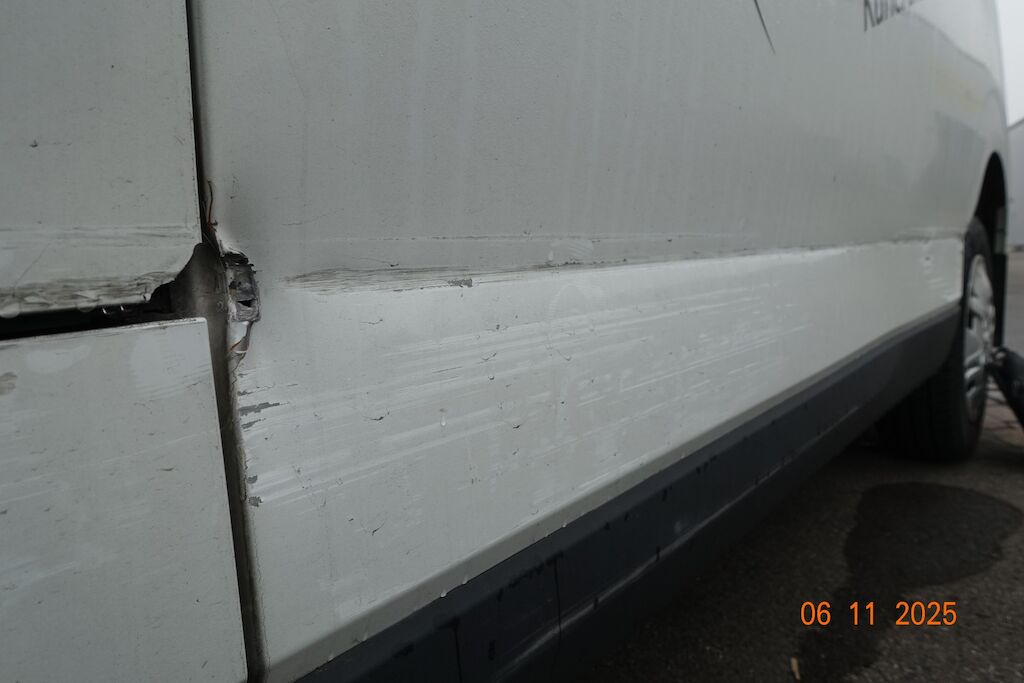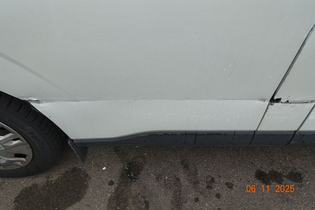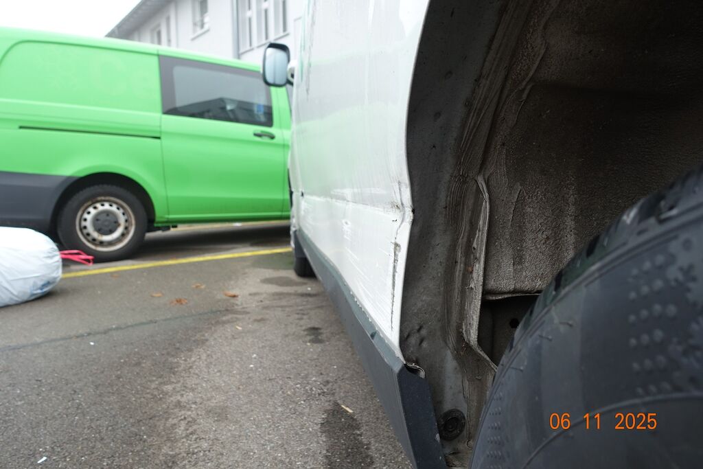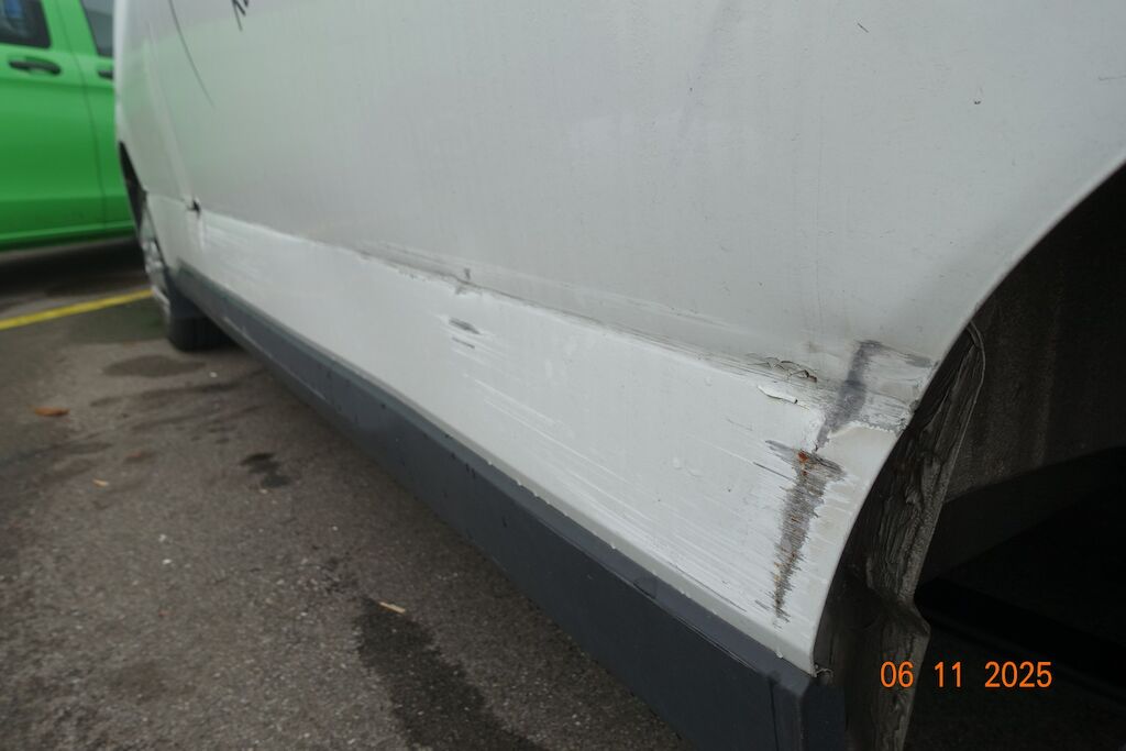 Die komplette linke Fahrzeugseite ist eingedrückt. Der Radkasten sowie die Türe und die Seitenwand L sind deformiert. Diverse Zierleisten und Abdeckungen sind beschädigt. Die Raddeckel sind ebenfalls zerkratzt.