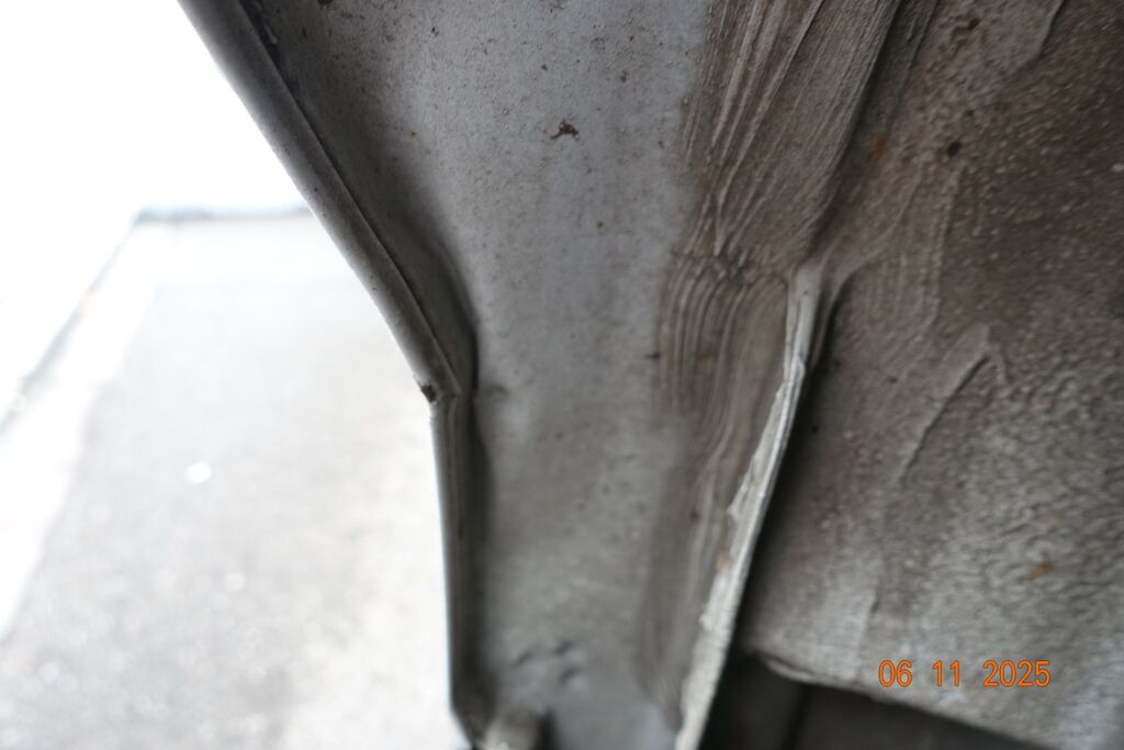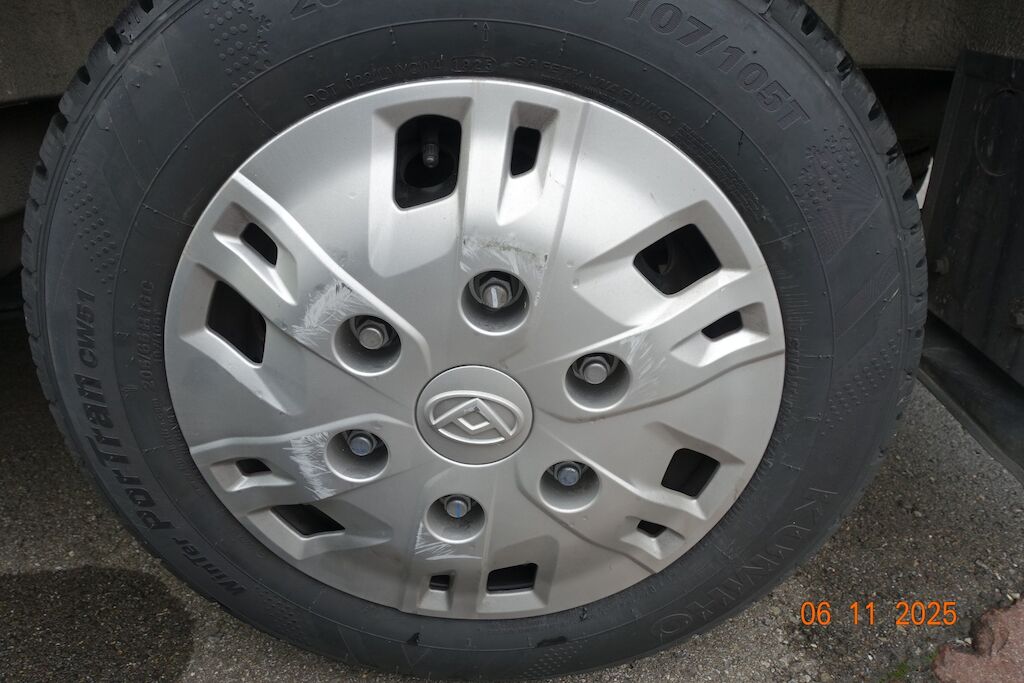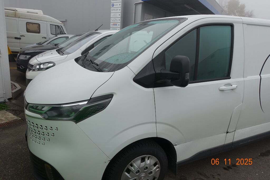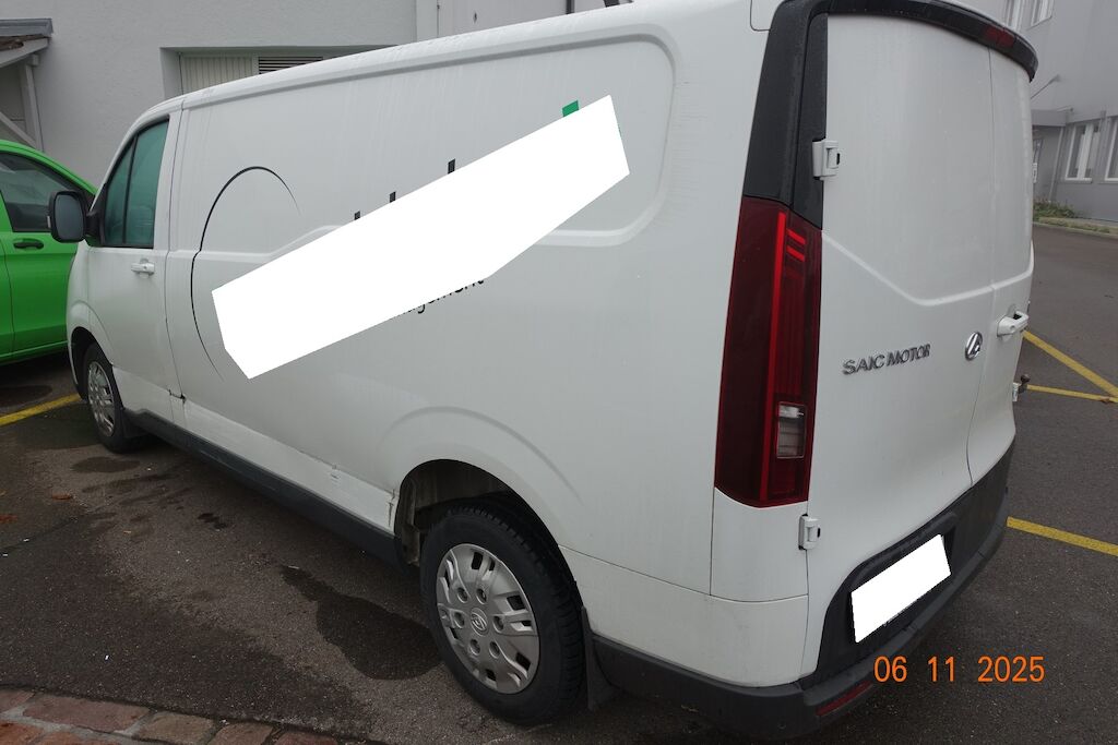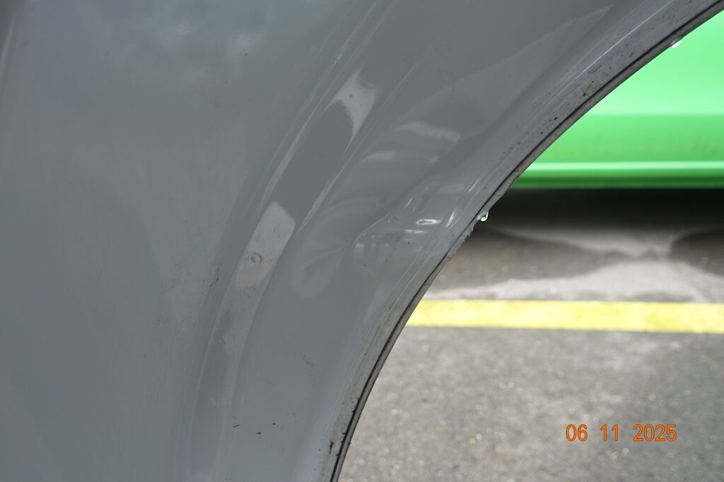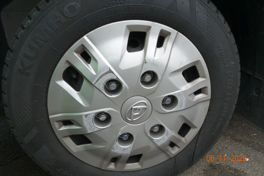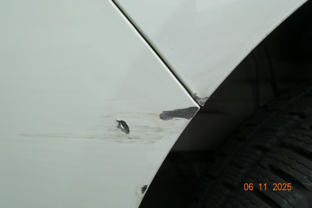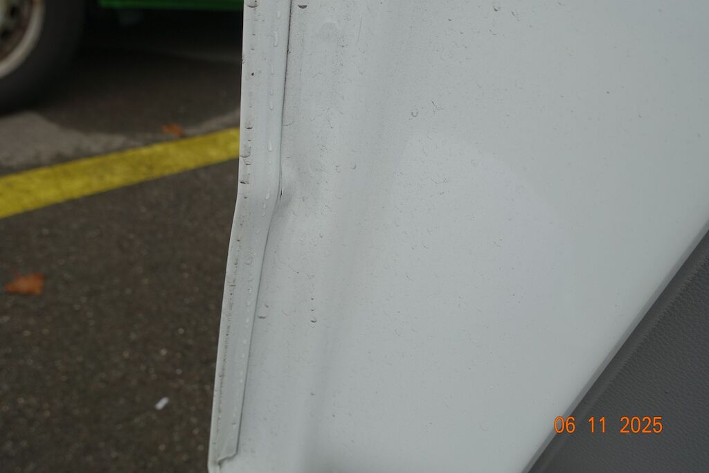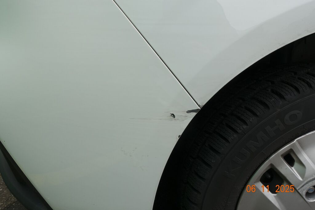 Die komplette linke Fahrzeugseite ist eingedrückt. Der Radkasten sowie die Türe und die Seitenwand L sind deformiert. Diverse Zierleisten und Abdeckungen sind beschädigt. Die Raddeckel sind ebenfalls zerkratzt.