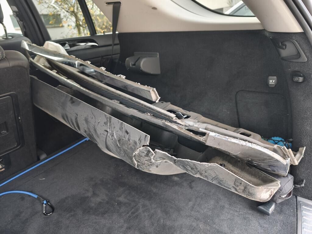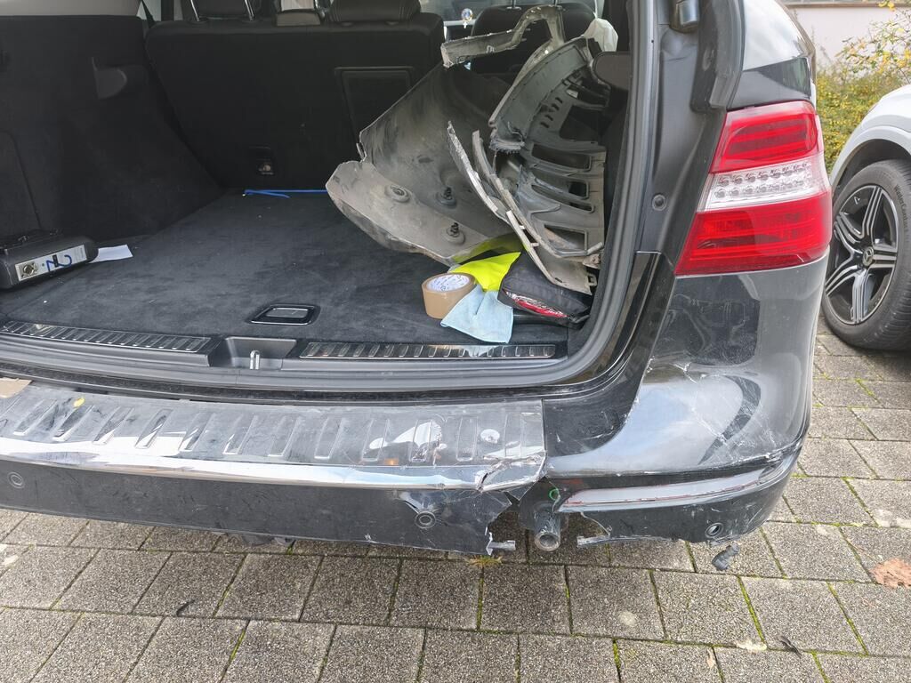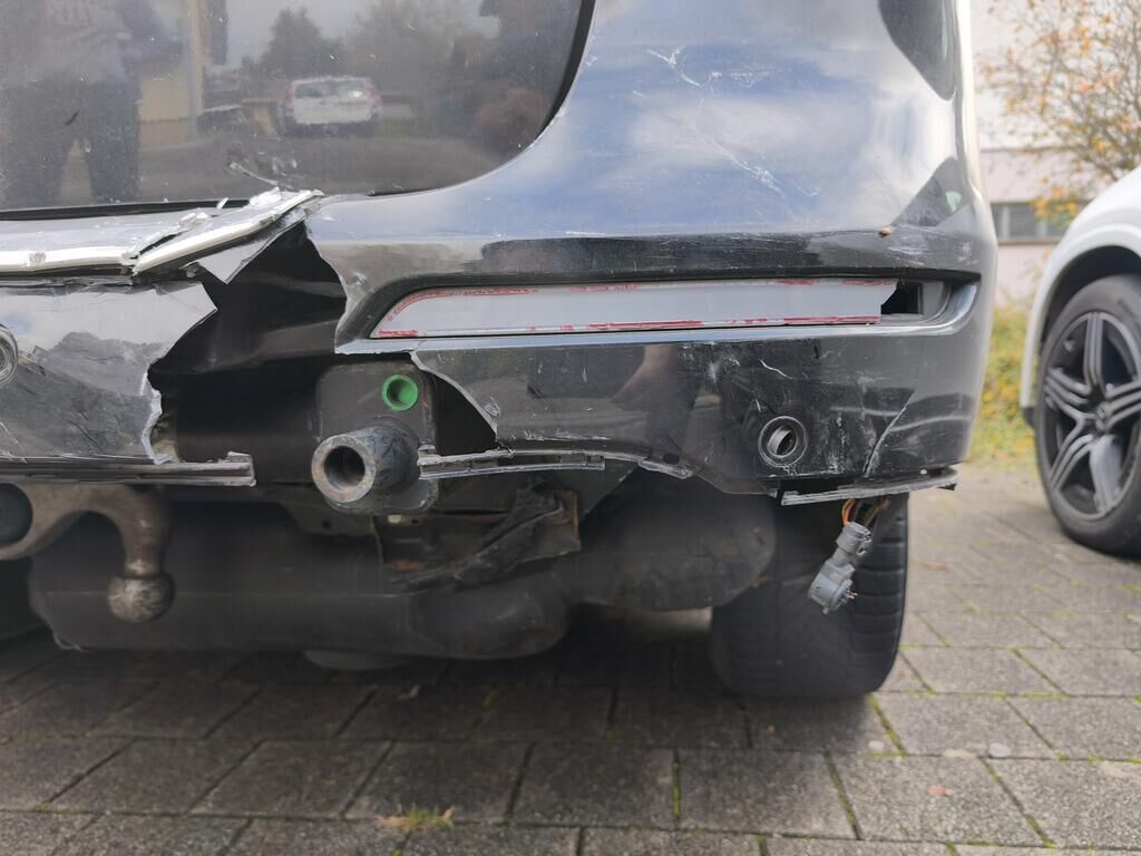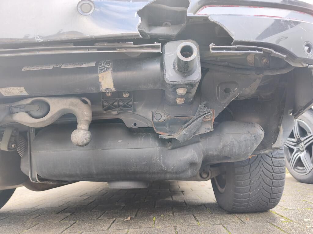 Beschädigt, deformiert und/oder gestaucht sind die Stossstange hinten inkl. Anbauteilen rechts, Der Träger der AHK, das Heckabschlussblech, der Adblue-Tank hinten rechts, die Radhausabdeckung hinten rechts und die Heckklappe.