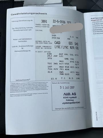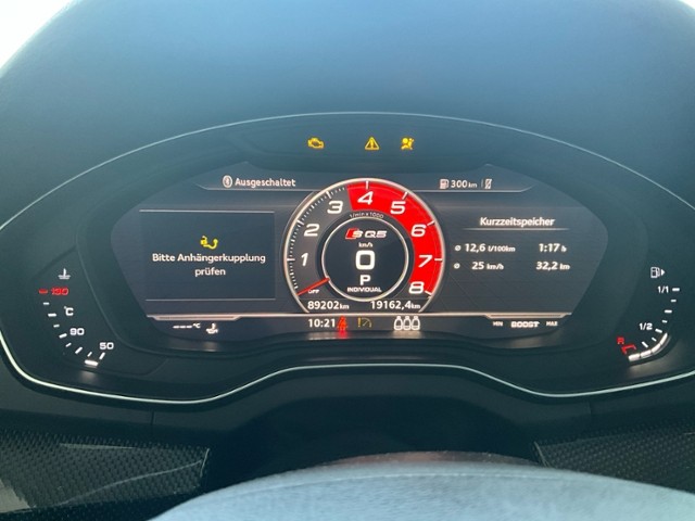 Ausstattung Serienaustattung Sitzheizung für Vordersitze Lendenwirbelstützen elektr. für Vordersitze Mittelarmlehne vorne Tempostat Aussenspiegel elektrisch verstellbar/ heizbar und anklappbar Airbag Fahrer und Beifahrerseite Seitenairbag Fahrer und Beifahrerseite ESP/ ASR/ EDS/ ABS mit EBV Sportsitze vorne Radschrauben mit Diebstahlsicherung Dachhimmel schwarz/ Stoff Fahrerinformationssystem mit Farbdisplay Multifunktions-Ledersportlenkrad 3-Speichen Tagesfahrlichtschaltung Servolenkung Bremsassistent EBA Netztrennwand Vordersitze elektrisch verstellbar Automatisch abblendbarer Innenspiegel Isofix Kindersitzverankerung/ Deakt. Beifahrerairbag Radioempfang digital DAB Tirefit Pack Glanz Kindersitz-Vorbereitung Isofix hinten Einstiegsleisten Aluminium Sportfahrwerk mit variabler Dämpfung Reifendruck-Kontrollanzeige Dekoreinlagen in Aluminium gebürstet Audi drive select (Fahrzeugcharakteristik) Aussenspiegel in Aluminiumoptik Gepäckraumklappe elektrisch öffnend und schliessend Leichtmetallräder 20″ 5-Doppelspeichen LED-Scheinwerfer Bluetooth Schnittstelle Stop + Start System Keine Gewähr auf die Angaben der Serienausstattungen S-Line Sitzbezüge in Leder-Alcantara Komfort Klimaautomatik MMI Radio plus Audi connect Notruf & Service Sonderausstattung Ausstattung |