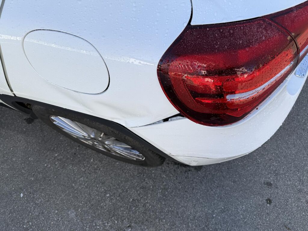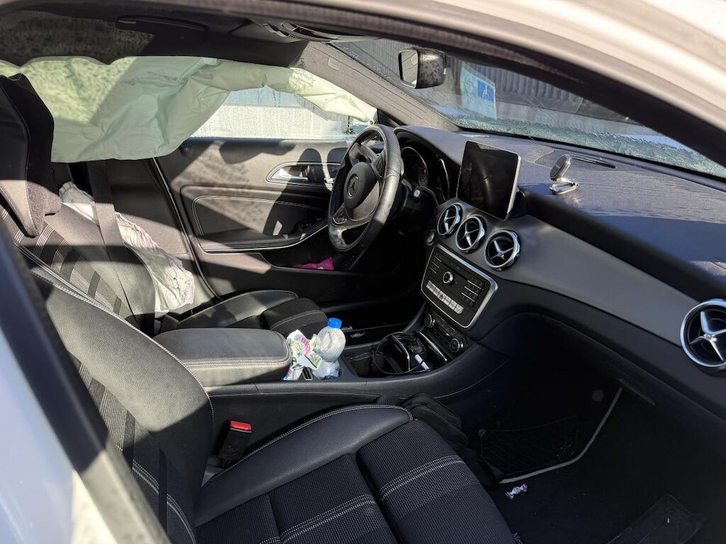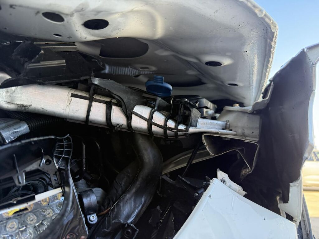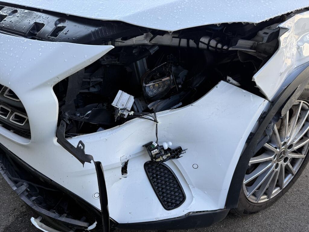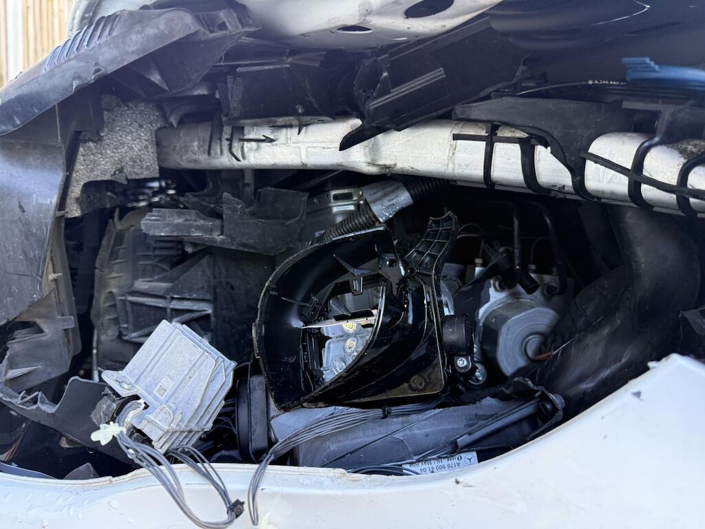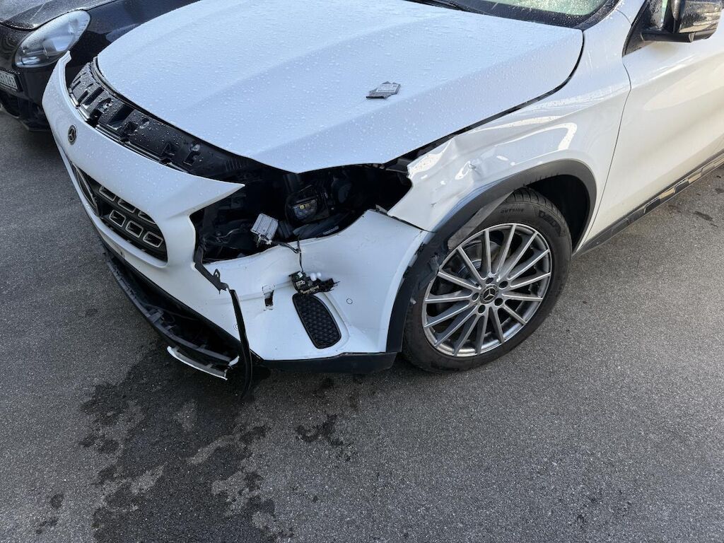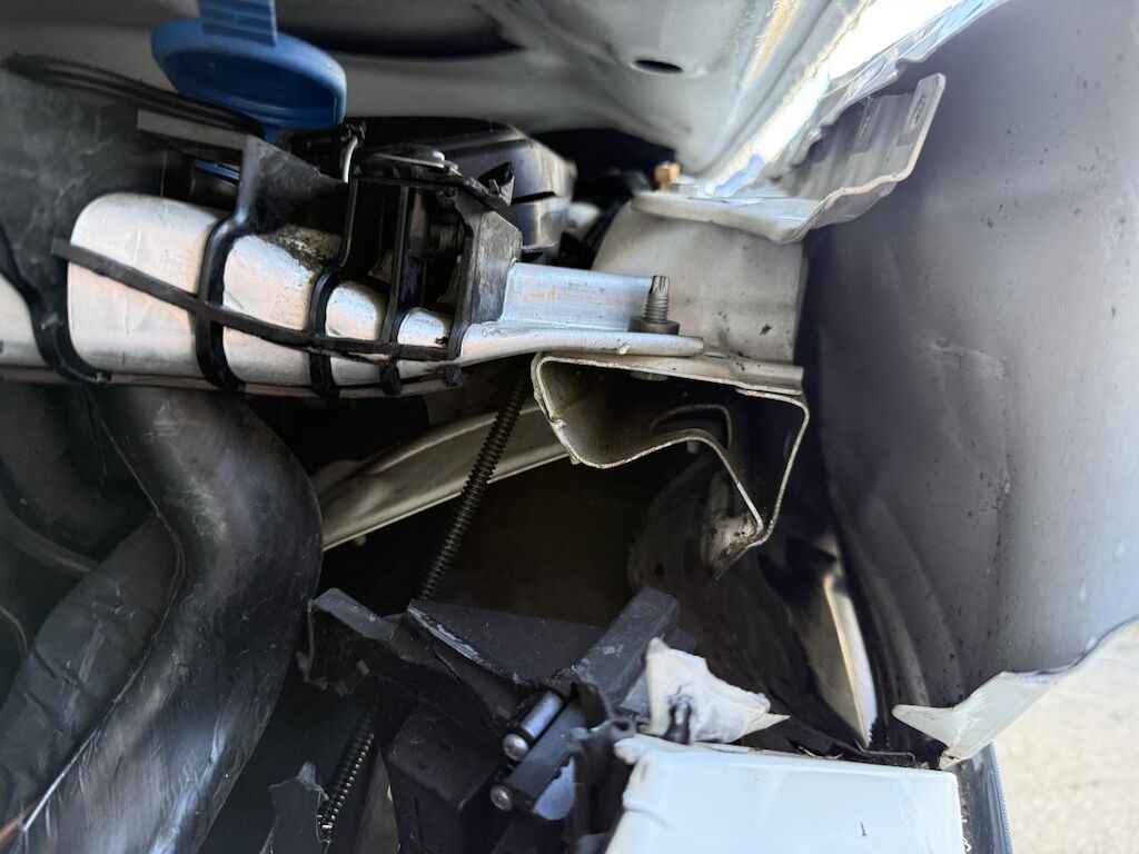 Anprall vorne links, dabei wurde der Vorbau nach rechts verschoben. Stossfänger, Träger, Kotflügel und Achse sind deformiert. Zusätzlich ist das Heck links beschädigt worden und es haben die Gurtstraffer und Airbags ausgelöst.