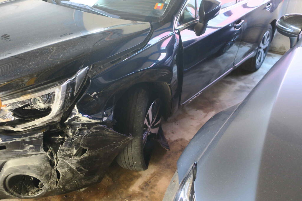 Front, Seitenschaden links. Rad, Radaufhängung vo. links ist deformiert.