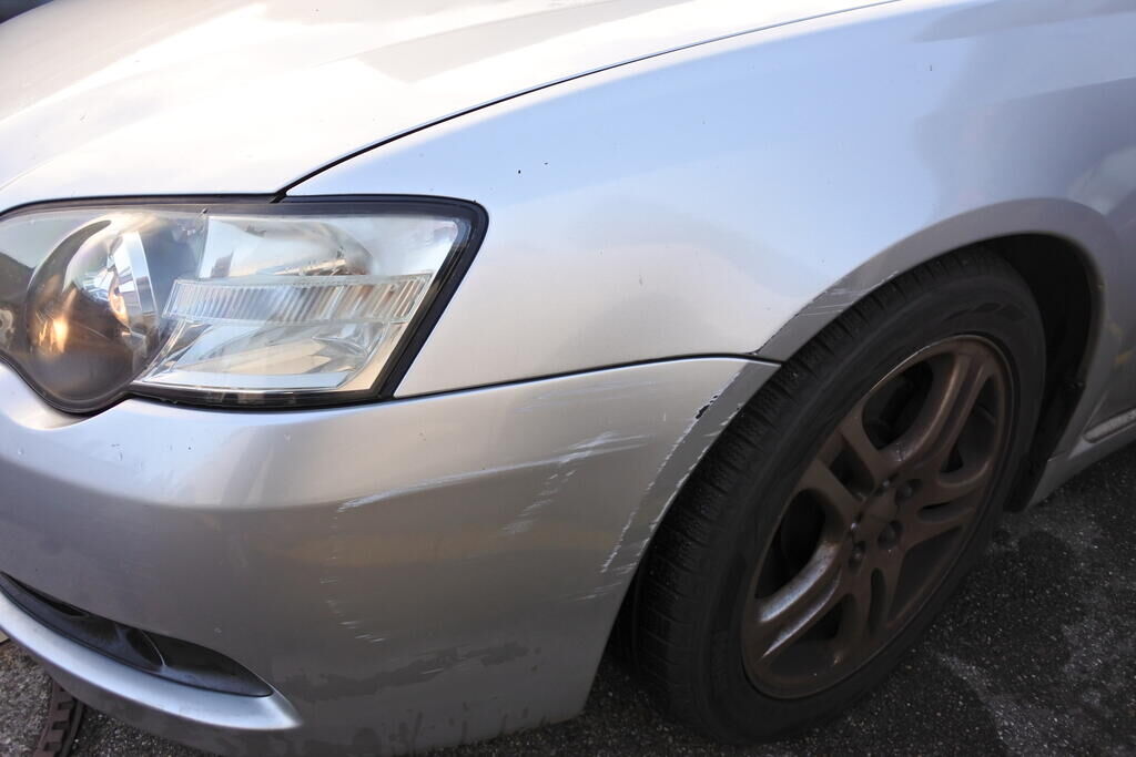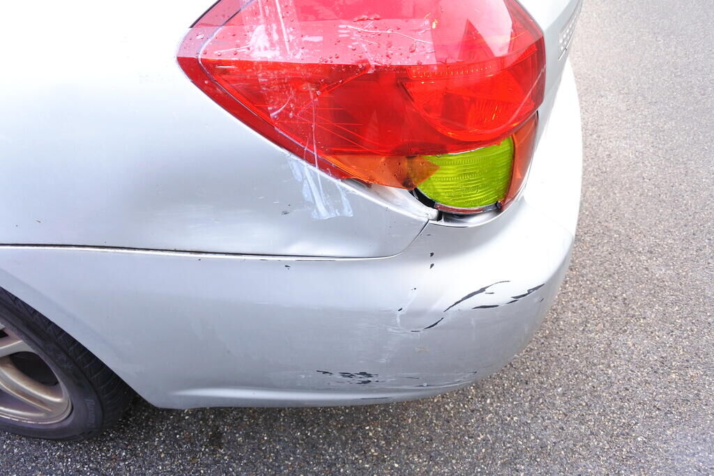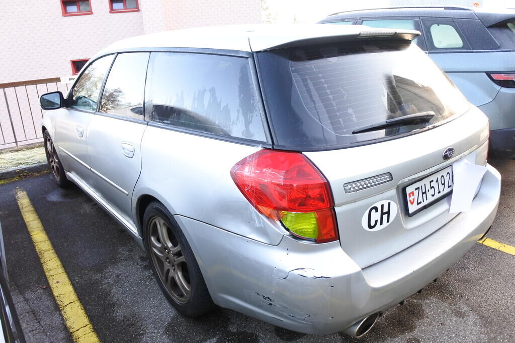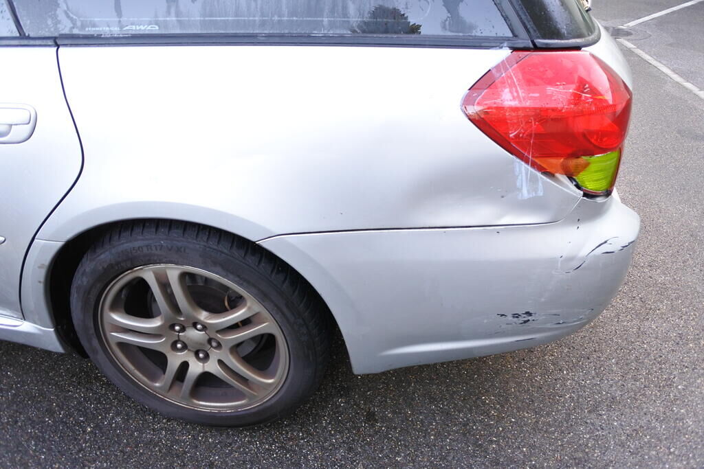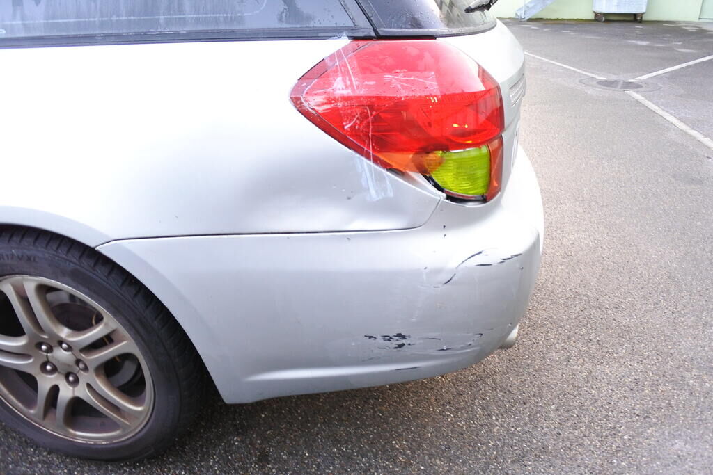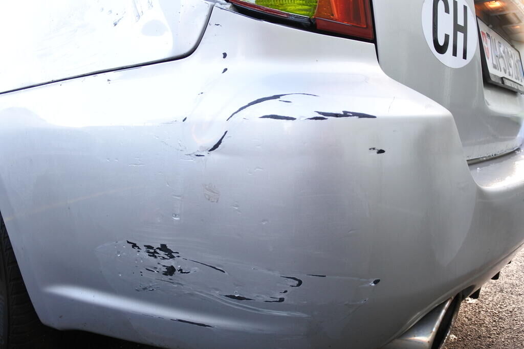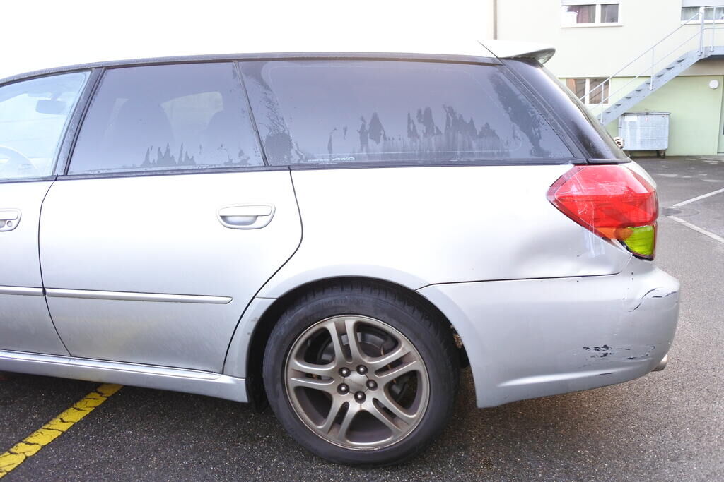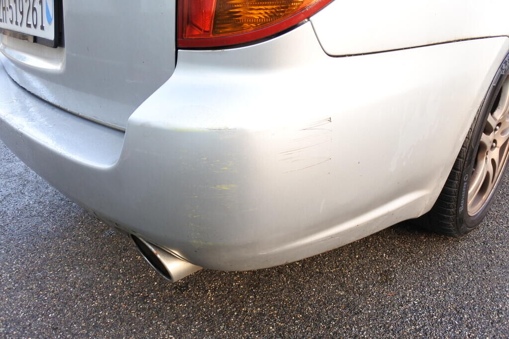 Die Seitenwand, die Rückleuchte und die Stossstange sind deformiert, zerborsten bzw. bleibend verformt. Der Auspuff generiert überdurchnittliche Geräusche, schlägt an )