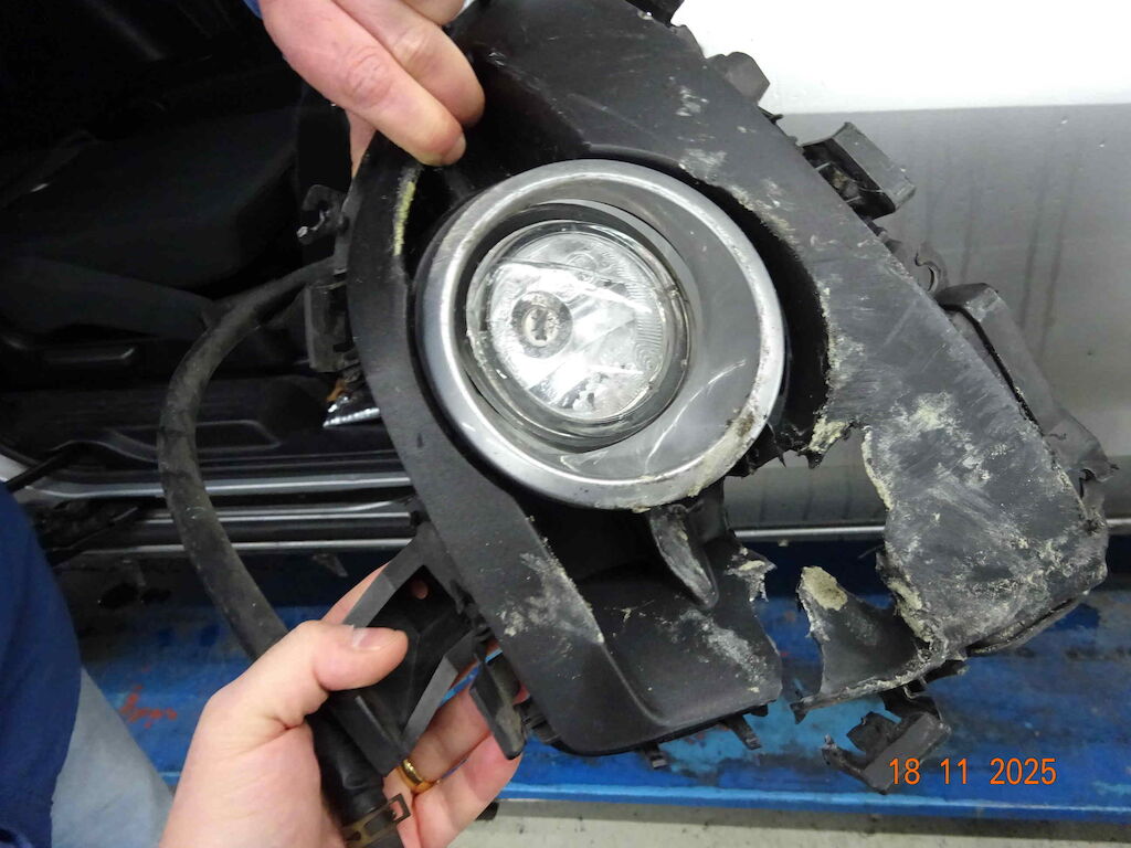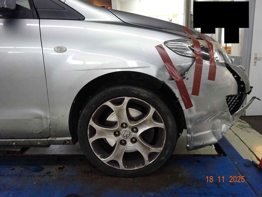 Stossstange vorne gerissen, Nebellampe rechts gebrochen, Radhausschale rechts gerissen, Risiko Aufhängung rechts, Motorabdeckung gerissen, Auspuffhalterung hinten abgerissen, Unterbodenabdeckung gerissen, Kotflügel rechts deformiert, Türe Vorne rechts deformiert, Türe hinten rechts Kratzer, Seitenwand rechts kratzer, Stossstange hinten kratzer, Schweller rechts deformiert. Felge vorne rechts beschädigt